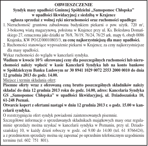 OBWIESZCZENIE Syndyk masy upadłości Gminnej Spółdzielni „Samopomoc Chłopska” w upadłości likwidacyjnej z siedzibą w Krajence ogłasza sprzedaż z wolnej ręki nieruchomości oraz ruchomości upadłego: 1. Nieruchomość gruntowa zabudowana budynkiem piekarni o pow. użytk. 720 m2, 3-boksową wiatą magazynową, położona w Krajence przy ul. Ks. Bolesława Domańskiego 27, oznaczona jako działki nr 76/8, 76/19, 76/24, 76/25 ark. mapy 6, obręb 0086 Krajenka, KW PO1Z/00010803/3, za cenę najkorzystniejszą dla masy upadłości. 2. Ruchomości stanowiące wyposażenie piekarni w Krajence, za ceny najkorzystniejsze dla masy upadłości. Wykaz ruchomości do wglądu w kancelarii syndyka. Wadium w kwocie 10% oferowanej ceny dla poszczególnych ruchomości lub nieruchomości należy wpłacić w kasie Kancelarii Syndyka lub na konto bankowe w Spółdzielczym Banku Ludowym nr 30 8941 1029 0072 2553 2000 0010 do dnia 12 grudnia 2013 do godz. 14.00. Miejsce i termin składania ofert: Pisemne oferty wraz z oferowaną ceną brutto poszczególnych składników należy składać do dnia 12 grudnia 2013 roku do godz. 14.00, adres: Kancelaria Syndyka GS „Samopomoc Chłopska” w upadłości likwidacyjnej, ul. Dziadoszańska 10, 61-248 Poznań. Otwarcie kopert z ofertami nastąpi w dniu 12 grudnia 2013 r. o godz. 15.00 w kancelarii syndyka. O rozstrzygnięciu ofert syndyk powiadomi zainteresowanych pisemnie. Szczegółowe informacje o sprzedawanych składnikach majątkowych masy oraz regulaminie sprzedaży można uzyskać w kancelarii syndyka w Poznaniu, przy ul. Dziadoszańskiej 10, w każdy dzień roboczy w godz. od 9.00 do 14.00 (tel. 61 8766424), a z przedmiotem sprzedaży można się zapoznać po uprzednim telefonicznym uzgodnieniu terminu (tel. 602 751 801).