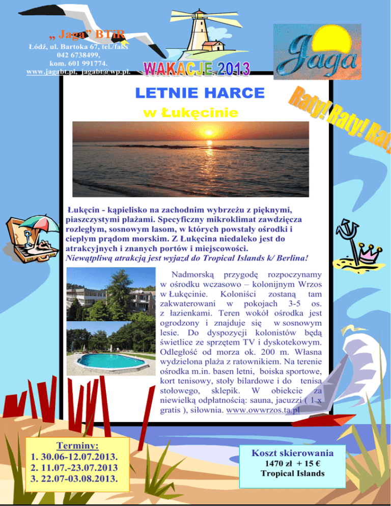 „ Jaga” BTiR Łódź, ul. Bartoka 67, tel./faks 042 6738499, kom. 601 991774. www.jagabt.pl, [email protected]. LETNIE HARCE w Łukęcinie Łukęcin - kąpielisko na zachodnim wybrzeżu z pięknymi, piaszczystymi plażami. Specyficzny mikroklimat zawdzięcza rozległym, sosnowym lasom, w których powstały ośrodki i ciepłym prądom morskim. Z Łukęcina niedaleko jest do atrakcyjnych i znanych portów i miejscowości. Niewątpliwą atrakcją jest wyjazd do Tropical Islands k/ Berlina! Nadmorską przygodę rozpoczynamy w ośrodku wczasowo – kolonijnym Wrzos w Łukęcinie. Koloniści zostaną tam zakwaterowani w pokojach 3-5 os. z łazienkami. Teren wokół ośrodka jest ogrodzony i znajduje się w sosnowym lesie. Do dyspozycji kolonistów będą świetlice ze sprzętem TV i dyskotekowym. Odległość od morza ok. 200 m. Własna wydzielona plaża z ratownikiem. Na terenie ośrodka m.in. basen letni, boiska sportowe, kort tenisowy, stoły bilardowe i do tenisa stołowego, sklepik. W obiekcie za niewielką odpłatnością: sauna, jacuzzi ( 1 x gratis ), siłownia. www.owwrzos.ta.pl Terminy: 1. 30.06-12.07.2013. 2. 11.07.-23.07.2013 3. 22.07-03.08.2013. Koszt skierowania 1470 zł + 15 € Tropical Islands PROGRAM. Dzień 1. Zbiórka godz. 8.00. Parking przy stadionie RTS Widzew. Wyjazd 8.15. Przejazd do Łukęcina . Zakwaterowanie. Kolacja. Spacer. Nocleg. Dzień 2-11 W trakcie pobytu m.in. kąpiele i plażowanie, gry, zabawy, dyskoteki oraz udział w imprezach plenerowych i rekreacyjno – sportowych. W trakcie pobytu m.in. - Wycieczka autokarowa do Świnoujścia i Międzyzdrojów – W trakcie wycieczki m.in. przeprawa promem przez Świnę, spacer po uzdrowisku, promenada. Zwiedzanie fortu Gerharda – zespołu umocnień rozbudowywanych od XVIII w. Wycieczka na Wyspę Skarbów (www.wyspa-skarbow.pl). Uczestnicy zwiedzają Wyspę Skarbów , są tam strusie, mini pole golfowe, boisko do piłki siatkowej, bilard, piłkarzyki, stół do tenisa stołowego, strzelanie z łuków, narty pirackie, most linowy i diabelski. Gra rekreacyjna- uczestnictwo w biegu na orientację z poszukiwaniem skarbu. Międzyzdroje – spacer po Parku Zdrojowym, Promenadzie Gwiazd i po pięknym molo. - Wycieczka do Kołobrzegu oraz do Centrum Rozrywki Zieleniewo Wioska indiańska, Western city, Mini-zoo- czeka na nas trzygodzinna kumulacja atrakcji w tym: zwiedzanie stadniny, przejażdżka konna, bryczką, strzelanie z łuku, ognisko w wigwamie, kowbojska karuzela, indiańskie narty, zabawa z zespołem muzycznym, konkursy (m.in. dojenie kóz, szukanie złota), show pokazy z udziałem koni. Kołobrzeg miał charakter miasta-twierdzy, zbudowano tu fortyfikacje, z których mury przy plaży zachowały się do dzisiaj. Jest tutaj port handlowy, pasażerski, rybacki i jachtowy, molo o długości 220 m, latarnia morska oraz Stare Miasto, którego perełką jest ratusz. Dzień 12. Śniadanie. Pobranie prowiantu. Wycieczka do Tropical Islands w Nimczech (konieczny paszport lub dowód osobisty). Pobyt w tropikalnym aquaparku koło Berlina otwartym w 2004 roku. Temp. wody od 2831 stopni, powietrza 27 stopni Celsjusza. Prosimy zabrać strój kąpielowy i klapki. „Nad nami kopuła o wysokości 3 bloków 10-cio piętrowych przykrywająca teren odpowiadający ośmiu stadionom piłki nożnej. Jest tu m.in.: ogród, bagno, laguna, las tropikalny i plaża z setką palm kokosowych i 12-metrowymi fikusami. Wyjazd do Polski. Obiadokolacja. Dzień13. Przyjazd na miejsce zbiórki we wczesnych godzinach porannych. 1.Zakwaterowanie w Ośrodku Wypoczynkowym „Wrzos” 2.Wyżywienie ( śniadanie, obiad, kolacja, podwieczorek). Prowiant na wycieczki autokarowe. Prowiant na drogę powrotną. Obiadokolacja na trasie Tropical Island - Łódź 3.Transport autokarem 4.Ubezpieczenie NNW i KL na wycieczkach zagranicznych. 5.Możliwość korzystania z basenu letniego, boiska sportowego, kortów tenisowych, stołów bilardowych i do tenisa stołowego, sklepiku, sal ze sprzętem TV i dyskotekowym. 6.Opiekę wykwalifikowanej kadry pedagogicznej i ratownika 7.Realizację ciekawego programu rekreacyjnego : wycieczki do Kołobrzegu, Międzyzdrojów, Świnoujścia, Tropical Island koło Berlina . 8.Wycieczki jak w programie, gry, zabawy, dyskoteki. Wstępy w Polsce– w cenie imprezy. Wstęp do Tropical Islands płatny dodatkowo łącznie 15 € / os. UWAGA !!! Konieczny paszport. „Jaga” Biuro Turystyki i Rekreacji Łódź, ul. Bartoka 67 , tel./faks 042 6738499, kom. 601 991774. www.jagabt.pl, [email protected]. Uwaga na wyjazd konieczny paszport lub dowód osobisty.