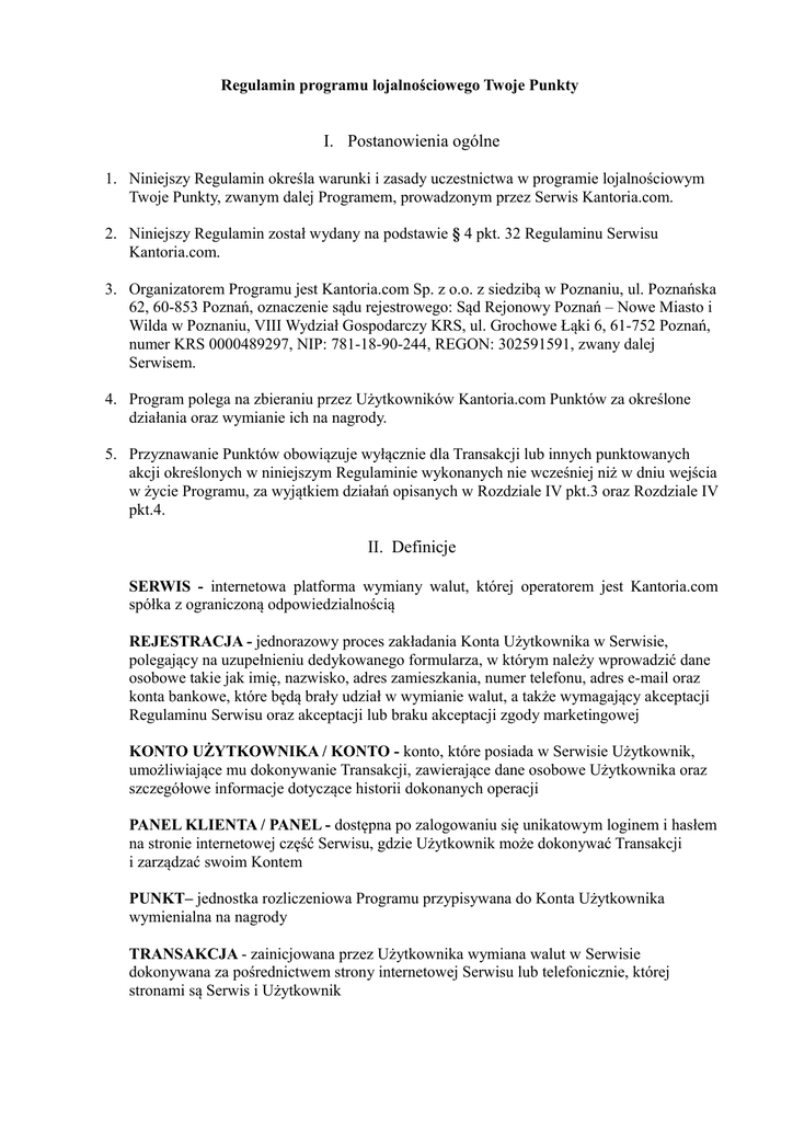 Regulamin programu lojalnościowego Twoje Punkty I. Postanowienia ogólne 1. Niniejszy Regulamin określa warunki i zasady uczestnictwa w programie lojalnościowym Twoje Punkty, zwanym dalej Programem, prowadzonym przez Serwis Kantoria.com. 2. Niniejszy Regulamin został wydany na podstawie § 4 pkt. 32 Regulaminu Serwisu Kantoria.com. 3. Organizatorem Programu jest Kantoria.com Sp. z o.o. z siedzibą w Poznaniu, ul. Poznańska 62, 60-853 Poznań, oznaczenie sądu rejestrowego: Sąd Rejonowy Poznań – Nowe Miasto i Wilda w Poznaniu, VIII Wydział Gospodarczy KRS, ul. Grochowe Łąki 6, 61-752 Poznań, numer KRS 0000489297, NIP: 781-18-90-244, REGON: 302591591, zwany dalej Serwisem. 4. Program polega na zbieraniu przez Użytkowników Kantoria.com Punktów za określone działania oraz wymianie ich na nagrody. 5. Przyznawanie Punktów obowiązuje wyłącznie dla Transakcji lub innych punktowanych akcji określonych w niniejszym Regulaminie wykonanych nie wcześniej niż w dniu wejścia w życie Programu, za wyjątkiem działań opisanych w Rozdziale IV pkt.3 oraz Rozdziale IV pkt.4. II. Definicje SERWIS - internetowa platforma wymiany walut, której operatorem jest Kantoria.com spółka z ograniczoną odpowiedzialnością REJESTRACJA - jednorazowy proces zakładania Konta Użytkownika w Serwisie, polegający na uzupełnieniu dedykowanego formularza, w którym należy wprowadzić dane osobowe takie jak imię, nazwisko, adres zamieszkania, numer telefonu, adres e-mail oraz konta bankowe, które będą brały udział w wymianie walut, a także wymagający akceptacji Regulaminu Serwisu oraz akceptacji lub braku akceptacji zgody marketingowej KONTO UŻYTKOWNIKA / KONTO - konto, które posiada w Serwisie Użytkownik, umożliwiające mu dokonywanie Transakcji, zawierające dane osobowe Użytkownika oraz szczegółowe informacje dotyczące historii dokonanych operacji PANEL KLIENTA / PANEL - dostępna po zalogowaniu się unikatowym loginem i hasłem na stronie internetowej część Serwisu, gdzie Użytkownik może dokonywać Transakcji i zarządzać swoim Kontem PUNKT– jednostka rozliczeniowa Programu przypisywana do Konta Użytkownika wymienialna na nagrody TRANSAKCJA - zainicjowana przez Użytkownika wymiana walut w Serwisie dokonywana za pośrednictwem strony internetowej Serwisu lub telefonicznie, której stronami są Serwis i Użytkownik UŻYTKOWNIK - podmiot, który dokonał prawidłowej Rejestracji konta na stronie internetowej https://www.kantoria.com poprzez uzupełnienie formularza z danymi osobowymi, który jest: a) pełnoletnią osobą fizyczną, posiadającą pełną zdolność do czynności prawnych, b) osobą prawną i jednostką organizacją nieposiadającą osobowości prawnej reprezentowane przez uprawnione do tego podmioty SKUTECZNE POLECENIE – sytuacja, w wyniku której Osoba Polecająca przekaże Kod Osobie Polecanej i przy użyciu którego Osoba Polecana zarejestruje się w Serwisie i dokona co najmniej jednej Transakcji o wartości nie mniejszej niż 100 jednostek Podstawowej Waluty OSOBA POLECAJĄCA– Użytkownik, który zrealizował co najmniej jedną Transakcję wymiany waluty na co najmniej 100 jednostek Waluty Podstawowej w Serwisie i przekazał swój Kod innej osobie niebędącej dotąd Użytkownikiem Serwisu, przy użyciu którego osoba ta dokonała Rejestracji OSOBA POLECANA– osoba niebędąca wcześniej Użytkownikiem Serwisu, która zarejestrowała się z użyciem Kodu otrzymanego od Osoby Polecającej, i wcześniej nie dokonywała Transakcji w Serwisie przy użyciu innego Konta KOD – unikatowy ciąg znaków stanowiący jednocześnie Login Osoby Polecającej pozwalający na powiązanie Osoby Poleconej z Osobą Polecającą KURS ŚREDNI – średnia arytmetyczna wyliczona z aktualnego kursu kupna i kursu sprzedaży ze strony internetowej Serwisu, zwany potocznie kursem Forex. Transakcja wymieniona po Kursie Średnim zawiera maksymalny upust, jaki Użytkownik może otrzymać w Serwisie WALUTA PODSTAWOWA– waluty biorące udział w Programie: EUR, CHF, USD, GBP III. Warunki przystąpienia do Programu 1. Program skierowany jest do Użytkowników Serwisu, którzy dokonali Rejestracji. 2. Punkty gromadzone są na Koncie Użytkownika w Serwisie. 3. Działaniami w rozumieniu Rozdziału III pkt. 3 są: a. skuteczne Polecenie, b. wystawienie opinii w serwisie Opineo.pl c. wystawienie opinii w serwisie Facebook.com d. wystawienie opinii w Google e. ustawienie i realizowanie Transakcji w ramach usługi Stała Transakcja, f. udział w innych akcjach i konkursach niewymienionych w niniejszym Regulaminie organizowanych okolicznościowo przez Serwis. 4. Ilość Punktów, jakie można otrzymać za poszczególne działania wymienione w Rozdziale III pkt.3 określa Załącznik do niniejszego Regulaminu. IV. Zasady przyznawania Punktów 1. Zasady przyznawania punktów za Skuteczne Polecenie a. w celu uzyskania Punktów za Skuteczne Polecenie należy spełnić następujące kryteria łącznie: - Osoba Polecająca, która dokonała wymiany na co najmniej 100 jednostek Waluty Podstawowej, przekazuje swój Kod Osobie Polecanej - Osoba Polecana rejestruje się w Serwisie przy użyciu Kodu otrzymanego od Osoby Polecającej - Osoba Polecana dokonuje wymiany walut na co najmniej 100 jednostek Waluty Podstawowej na swój numer rachunku lub numer rachunku osoby trzeciej niebędącej dotąd Użytkownikiem Serwisu. b. Jeżeli Osoba Polecana z jakiś przyczyn nie poda Kodu otrzymanego od Osoby Polecającej podczas Rejestracji, może go uzupełnić w Panelu Klienta maksymalnie przed dokonaniem pierwszej Transakcji. c. Osoba Polecająca oraz Osoba Polecana otrzymują automatycznie Punkty za Skuteczne Polecenie w wysokości określonej zgodnie z Załącznikiem do niniejszego Regulaminu w terminie do 3 dni roboczych od daty spełnienia warunków określonych w Rozdziale IV pkt.1 lit a. d. Osoba Polecająca może polecić Serwis dowolnej liczbie osób. 2. Zasady przyznawania punktów za wys