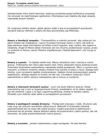Emery: To będzie wielki test PSGFC.pl - Polskie centrum kibiców Paris Saint-Germain - News Szkoleniowiec Paris Saint-Germain, podczas przedmeczowej konferencji prasowej nie ukrywał, że nadchodzące spotkanie z Olympique Lyon będzie dla jego zespołu naprawdę dużym testem. OL rozgrywa solidny sezon, gdzie oprócz walki o grę w europejskich pucharach, zacięcie walczy również o awans do fazy pucharowej Ligi Mistrzów. Emery o kondycji zespołu: - Trenowaliśmy w sobotni poranek, aby zobaczyć na jakim etapie się znajdujemy. Layvin Kurzawa trenował razem z nami, ale była to jego pierwsza sesja treningowa od blisko trzech tygodni, więc ciężko, aby zagrał w niedzielę. Angel Di Maria także trenował, ale nie chcemy podejmować ryzyka, przez co zostanie w Paryżu. Javier Pastore współpracuje z fizjoterapeutami i nie ma go w kadrze. Emery o Lyonie: - To będzie wielki test. Mamy określone cele i wierzę w moich graczy. Traktujemy ten mecz jako ważny test, który udowodni naszą autentyczność. Przeciwko Arsenalowi pokazaliśmy naprawdę wielką wydajność. Mecz z Lyonem jest meczem, w którym możemy zdobyć kolejne trzy punkty w walce o tytuł, dlatego jest istotny. Lyon na pewno będzie zmotywowany i będzie chciał przezwyciężyć pewne wątpliwości, dlatego będzie to trudny cel dla nas. Chciałbym zobaczyć moich zawodników w takim samym nastawieniu jak w meczu w Londynie. Emery o mocnych stronach Lyonu: - Lyon ma dużo dobrych graczy. Kiedy mierzyliśmy się z nimi w Superpucharze Francji, wiedziałem, że to dobry zespół. To się nie zmieniło. Ligue 1 to liga z ogromną jakością, mówię to bardzo często. Ponadto Lyon dobrze radzi sobie w europejskich pucharach. Emery o postępach swojej drużyny: - Postęp jest znaczący i stały. Drużyna cały czas uczy się różnych wariantów taktycznych. Matuidi? Z Arsenalem iekawie zaprezentował się na nowe dla siebie pozycji. Ciężko pracował w defensywie i przenosił się do przodu. Nasze taktyka zależy od przeciwnika z jakim gramy, ale nie ukrywam, że lubię wszechstronność moich graczy. Emery o Lucasie: - Jestem zadowolony z jego występów. On jest bardzo 1/2 Emery: To będzie wielki test PSGFC.pl - Polskie centrum kibiców Paris Saint-Germain - News zaangażowany, gdziekolwiek by nie zagrał. Potrafi bronić, atakować, wykonuje wiele funkcji na boisku i oczywiście, ma talent. Widać, że zrobił w PSG ogromny progres. Autor: PSGKP 2/2 Powered by TCPDF (www.tcpdf.org)