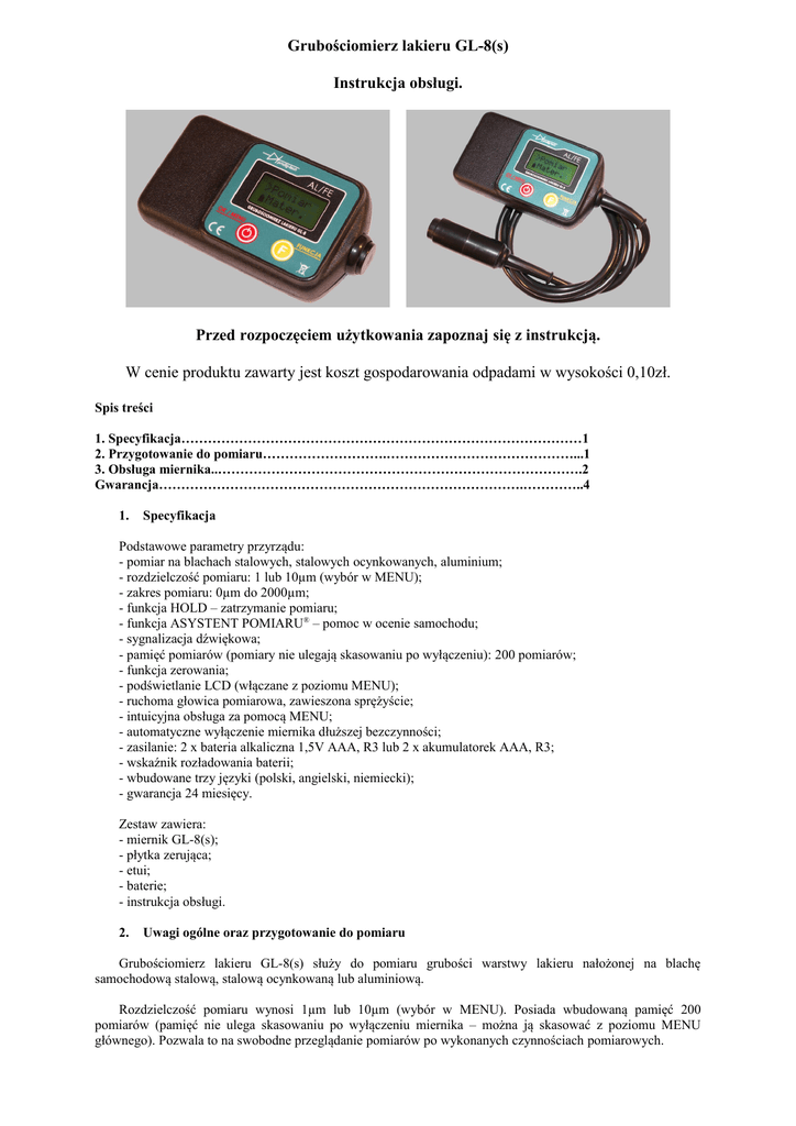 Grubościomierz lakieru GL-8(s) Instrukcja obsługi. Przed rozpoczęciem użytkowania zapoznaj się z instrukcją. W cenie produktu zawarty jest koszt gospodarowania odpadami w wysokości 0,10zł. Spis treści 1. Specyfikacja………………………………………………………………………………1 2. Przygotowanie do pomiaru……………………….……………………………………...1 3. Obsługa miernika..……………………………………………………………………….2 Gwarancja……………………………………………………………………….…………..4 1. Specyfikacja Podstawowe parametry przyrządu: - pomiar na blachach stalowych, stalowych ocynkowanych, aluminium; - rozdzielczość pomiaru: 1 lub 10µm (wybór w MENU); - zakres pomiaru: 0µm do 2000µm; - funkcja HOLD – zatrzymanie pomiaru; - funkcja ASYSTENT POMIARU® – pomoc w ocenie samochodu; - sygnalizacja dźwiękowa; - pamięć pomiarów (pomiary nie ulegają skasowaniu po wyłączeniu): 200 pomiarów; - funkcja zerowania; - podświetlanie LCD (włączane z poziomu MENU); - ruchoma głowica pomiarowa, zawieszona sprężyście; - intuicyjna obsługa za pomocą MENU; - automatyczne wyłączenie miernika dłuższej bezczynności; - zasilanie: 2 x bateria alkaliczna 1,5V AAA, R3 lub 2 x akumulatorek AAA, R3; - wskaźnik rozładowania baterii; - wbudowane trzy języki (polski, angielski, niemiecki); - gwarancja 24 miesięcy. Zestaw zawiera: - miernik GL-8(s); - płytka zerująca; - etui; - baterie; - instrukcja obsługi. 2. Uwagi ogólne oraz przygotowanie do pomiaru Grubościomierz lakieru GL-8(s) służy do pomiaru grubości warstwy lakieru nałożonej na blachę samochodową stalową, stalową ocynkowaną lub aluminiową. Rozdzielczość pomiaru wynosi 1µm lub 10µm (wybór w MENU). Posiada wbudowaną pamięć 200 pomiarów (pamięć nie ulega skasowaniu po wyłączeniu miernika – można ją skasować z poziomu MENU głównego). Pozwala to na swobodne przeglądanie pomiarów po wykonanych czynnościach pomiarowych. Funkcja HOLD pozwala na dokonanie pomiaru i zatrzymanie go, dzięki czemu możemy miernik oddalić od badanej powierzchni i odczytać pomiar. Urządzenie ma wbudowane podświetlanie wyświetlacza. Funkcja ASYSTENT POMIARU® podpowiada oceniającemu samochód czy miał on naprawy blacharskolakiernicze. Dzięki zastosowaniu nowoczesnej konstrukcji, miernik ten jest bardzo ekonomiczny. Do jego zasilania wystarczą dwa tzw. "cienkie paluszki" alkaliczne (baterie R3, AAA). Czas pracy na takich bateriach sięga nawet kilkunastu godzin ciągłej pracy. Zerowanie (kalibracja) Przed rozpoczęciem pomiarów, należy sprawdzić czy miernik jest wyzerowany (czytaj FUNKCJA ZERO). Wymiana baterii. Jeżeli baterie wyczerpią się, należy je wymienić na nowe. Baterie powinny być alkaliczne typu AAA (popularne cienkie paluszki R3). W tym celu, na odwrocie miernika należy otworzyć klapkę i wymienić baterie. UWAGA !!! 1. Baterie powinny być alkaliczne. Zwykłe baterie szybko mogą się wyczerpać. Pomiaru dokonuje się przykładając czujnik do badanej powierzchni. Czujnik powinien możliwie płasko przylegać. Badana powierzchnia powinna być czysta i gładka – brud i chropowatość powodują dodatkową warstwę mierzoną. Miernik należy trzymać przyłożony do blachy aż wynik ustabilizuje się. Zaleca się trzymać miernik w dwóch rękach i delikatnie dociskać do blachy – eliminuje to drgania ręki. 3. Obsługa miernika Miernik wyposażony jest w dwa przyciski, za pomocą których obsługujemy przyrząd: - czerwony przycisk (OK / MENU): służy do włączenia miernika, zatwierdzania wybranych funkcji z MENU oraz do wychodzenia z funkcji z powrotem do MENU; - żółty przycisk (WYBÓR FUNKCJI): służy do przełączania funkcji w MENU głównym; ponadto podczas przeglądania pamięci pomiarów przełączamy nim kolejno pomiary; podczas pomiaru naciśniecie tego przycisku spowoduje zapamiętanie aktualnie wykonywanego pomiaru. Miernik włączamy przyciskając na chwilę przycisk „OK”. Po wyświetleniu loga firmy oraz nazwy przyrządu, miernik przejdzie do MENU głównego. Znak „>” w drugiej linii sygnalizuje aktualnie zaznaczoną funkcję. Funkcje przełączamy przyciskiem „FUNKCJA”, są to kolejno: - POMIAR - powoduje przejście miernika w stan pomiaru; - MATER. - wybór materiału z którego wykonana jest blacha (Stal, Aluminium/ Ocynk); - PAMIEC - powoduje przejście miernika do przeglądania zapamiętanych pom.; - WYLACZ - powoduje wyłączenie miernika; - KAS. POM. - powoduje skasowanie pamięci pomiarów; - ZERO - zerowanie miernika; - HOLD - włączenie funkcji powoduje zatrzymywanie pomiaru; - ROZDZ. - wybór rozdzielczości pomiaru; - LCD LED włączenie/wyłączenie podświetlania LCD; - ASYST. - włączenie/wyłączenie asystenta pomiaru; - JĘZYK - wybór języka. W celu zatwierdzenia wybranej funkcji należy wcisnąć przycisk „OK”. FUNKCJA POMIAR Po wybraniu tej funkcji na wyświetlaczu w pierwszej linii będzie wyświetlany aktualnie wybrany materiał, np. „Zn/Al” oraz po lewej stronie wskaźnik stanu baterii a w drugiej linii „----um”. Miernik w tym momencie oczekuje na przyłożenie do badanej blachy samochodowej. ^ Zn/Al ----um Po przyłożeniu sondy do karoserii na wyświetlaczu w drugiej linii przedstawiony zostanie pomiar. Po włączeniu funkcji HOLD wynik pozostanie na wyświetlaczu po zakończeniu pomiaru. ^ Zn/Al 140um 2 Aby wpisać pomiar do pamięci pomiarów, należy podczas pomiaru wcisnąć przycisk „FUNKCJA”. Na wyświetlaczu obok pomiaru zostanie wyświetlona gwiazdka „*” symbolizująca zapis do pamięci. UWAGA! Pamięć może pomieścić 200 pomiarów, po przekroczeniu tej wartości pomiary będą zapisywane od pierwszej pozycji jednocześnie nadpisując stare pomiary. ^ Zn/Al * 140um Po przeprowadzeniu pomiarów, należy wyjść do MENU głównego wciskając czerwony przycisk (OK