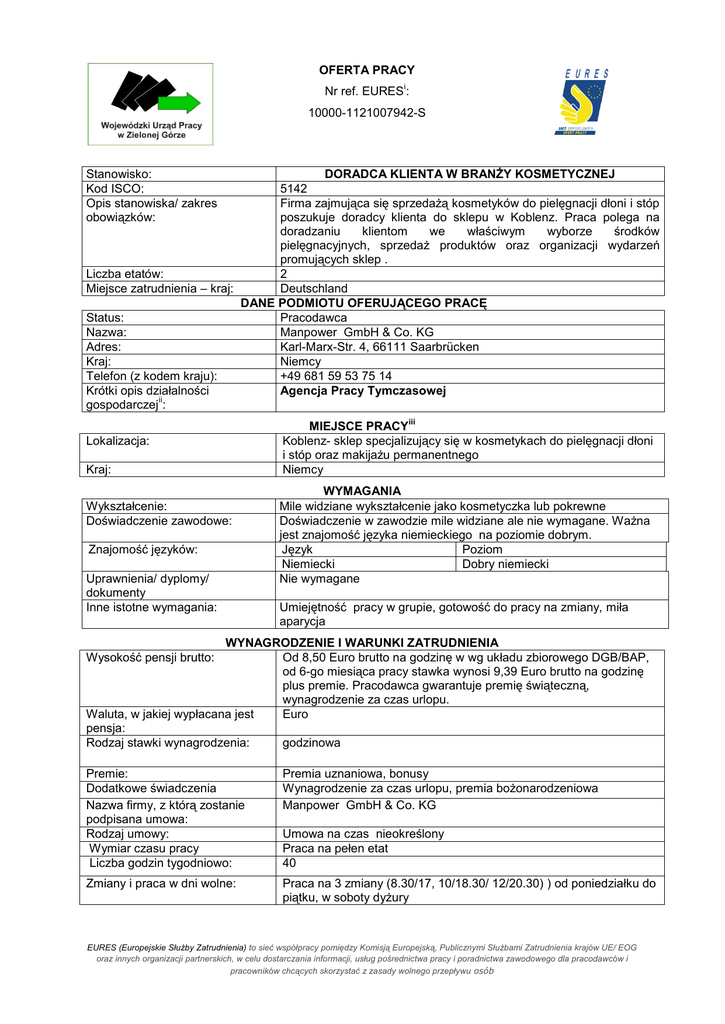 OFERTA PRACY i Nr ref. EURES : 10000-1121007942-S DORADCA KLIENTA W BRANŻY KOSMETYCZNEJ 5142 Firma zajmująca się sprzedażą kosmetyków do pielęgnacji dłoni i stóp poszukuje doradcy klienta do sklepu w Koblenz. Praca polega na doradzaniu klientom we właściwym wyborze środków pielęgnacyjnych, sprzedaż produktów oraz organizacji wydarzeń promujących sklep . Liczba etatów: 2 Miejsce zatrudnienia – kraj: Deutschland DANE PODMIOTU OFERUJĄCEGO PRACĘ Status: Pracodawca Nazwa: Manpower GmbH & Co. KG Adres: Karl-Marx-Str. 4, 66111 Saarbrücken Kraj: Niemcy Telefon (z kodem kraju): +49 681 59 53 75 14 Agencja Pracy Tymczasowej Krótki opis działalności ii gospodarczej : Stanowisko: Kod ISCO: Opis stanowiska/ zakres obowiązków: iii Lokalizacja: Kraj: Wykształcenie: Doświadczenie zawodowe: Znajomość języków: Uprawnienia/ dyplomy/ dokumenty Inne istotne wymagania: MIEJSCE PRACY Koblenz- sklep specjalizujący się w kosmetykach do pielęgnacji dłoni i stóp oraz makijażu permanentnego Niemcy WYMAGANIA Mile widziane wykształcenie jako kosmetyczka lub pokrewne Doświadczenie w zawodzie mile widziane ale nie wymagane. Ważna jest znajomość języka niemieckiego na poziomie dobrym. Język Poziom Niemiecki Dobry niemiecki Nie wymagane Umiejętność pracy w grupie, gotowość do pracy na zmiany, miła aparycja WYNAGRODZENIE I WARUNKI ZATRUDNIENIA Od 8,50 Euro brutto na godzinę w wg układu zbiorowego DGB/BAP, od 6-go miesiąca pracy stawka wynosi 9,39 Euro brutto na godzinę plus premie. Pracodawca gwarantuje premię świąteczną, wynagrodzenie za czas urlopu. Waluta, w jakiej wypłacana jest Euro pensja: Rodzaj stawki wynagrodzenia: godzinowa Wysokość pensji brutto: Premie: Dodatkowe świadczenia Nazwa firmy, z którą zostanie podpisana umowa: Rodzaj umowy: Wymiar czasu pracy Liczba godzin tygodniowo: Premia uznaniowa, bonusy Wynagrodzenie za czas urlopu, premia bożonarodzeniowa Manpower GmbH & Co. KG Zmiany i praca w dni wolne: Praca na 3 zmiany (8.30/17, 10/18.30/ 12/20.30) ) od poniedziałku do piątku, w soboty dyżury Umowa na czas nieokreślony Praca na pełen etat 40 EURES (Europejskie Służby Zatrudnienia) to sieć współpracy pomiędzy Komisją Europejską, Publicznymi Służbami Zatrudnienia krajów UE/ EOG oraz innych organizacji partnerskich, w celu dostarczania informacji, usług pośrednictwa pracy i poradnictwa zawodowego dla pracodawców i pracowników chcących skorzystać z zasady wolnego przepływu osób Data rozpoczęcia Wymagane dokumenty (list motywacyjny, CV itp.): 01.01.2015 SPOSÓB SKŁADANIA WNIOSKU CV w języku niemieckim należy kierować na adres mailowy: [email protected] W tytule maila należy napisać stanowisko pracy: „ Stylista paznokci”. Osobą do kontaktów jest Pani Marta ManiarskaWolska, tel. +49 1726522876. WAŻNOŚĆ Data publikacji: 02.12.2014 Oferta ważna do: odwołania Agencja Pracy Tymczasowej Manpower GmbH & co. KG Personaldiensteistungen oświadczyła, , że prowadzi działalność zgodnie z przepisami obowiązującymi na terenie Niemiec. UWAGA: Umowa z zagranicznym pracodawcą zostanie zawarta zgodnie z prawem kraju zatrudnienia. Oznacza to, że wszystkie roszczenia odnośnie do warunków, które obejmuje umowa, można kierować wyłącznie do odpowiedniego sądu w kraju zatrudnienia. Publiczne służby zatrudnienia (EURES) nie mogą pośredniczyć ani reprezentować pracownika w sądzie kraju zatrudnienia w przypadku sporu z pracodawcą. Publiczne służby zatrudnienia (EURES) dokładają wszelkich starań, aby zapewnić rzetelność i wiarygodność ofert pracy zgłoszonych w lokalnym urzędzie pracy. Należy wyjaśnić, że oferta pracy została zgłoszona przez stronę trzecią i EURES nie odpowiada za ewentualne rozbieżności między warunkami pracy określonymi w ofercie pracy i warunkami oferowanymi przez potencjalnego pracodawcę. Publiczne służby zatrudnienia (EURES) informują, że będą zbierać, przetwarzać i przekazywać potencjalnym pracodawcom zgodnie z przepisami dotyczącymi ochrony danych osobowych wszystkie dane osobowe dostarczone przez osoby poszukujące pracy. i Nr ref. na portalu EURES www.eures.europa.eu . Dotyczy ofert pracy publicznych służb zatrudnienia, których bazy danych ofert pracy nie są połączone z portalem EURES. ii Informacje o firmie, takie jak: status prawny, sektor, typ działalności, rodzaj produktów lub świadczonych usług, data rozpoczęcia działalności gospodarczej, liczba pracowników itp. iii Miejsce, w którym będzie wykonywana praca. Należy wypełnić w przypadku gdy: 1) miejsce wykonywania pracy jest inne niż siedziba podmiotu oferującego pracę, 2) pracę oferuje agencja pośrednictwa pracy/ agencja pracy tymczasowej. EURES (Europejskie Służby Zatrudnienia) to sieć współpracy pomiędzy Komisją Europejską, Publicznymi Służbami Zatrudnienia krajów UE/ EOG oraz innych organizacji partnerskich, w celu dostarczania informacji, usług pośrednictwa pracy i poradnictwa zawodowego dla pracodawców i pracowników chcących skorzystać z zasady wolnego przepływu osób