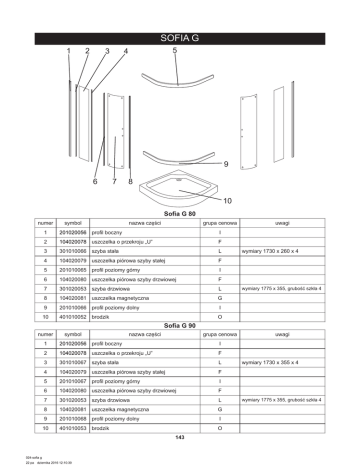 SOFIA G 1 2 3 5 4 9 6 7 8 10 Sofia G 80 numer symbol nazwa części grupa cenowa 1 201020056 profil boczny I 2 104020078 uszczelka o przekroju „U” F 3 301010066 szyba stała L 4 104020079 uszczelka piórowa szyby stałej F 5 201010065 profil poziomy górny I 6 104020080 uszczelka piórowa szyby drzwiowej F 7 301020053 szyba drzwiowa L 8 104020081 uszczelka magnetyczna G 9 201010066 profil poziomy dolny I 10 401010052 brodzik O uwagi wymiary 1730 x 260 x 4 wymiary 1775 x 355, grubość szkła 4 Sofia G 90 numer symbol nazwa części grupa cenowa 1 201020056 profil boczny I 2 104020078 uszczelka o przekroju „U” F 3 301010067 szyba stała L 4 104020079 uszczelka piórowa szyby stałej F 5 201010067 profil poziomy górny I 6 104020080 uszczelka piórowa szyby drzwiowej F 7 301020053 szyba drzwiowa L 8 104020081 uszczelka magnetyczna G 9 201010068 profil poziomy dolny I 10 401010053 brodzik O 143 024-sofia g 22 pa dziernika 2016 12:10:39 uwagi wymiary 1730 x 355 x 4 wymiary 1775 x 355, grubość szkła 4 Sofia G 1 2 3 4 5 6 7 8 9 10 11 12 13 14 15 16 17 18 19 20 numer symbol nazwa części grupa cenowa 1 701010024 zestaw wkrętów do montażu kabiny G 2 702010074 odbojnik B 3 702020002 uchwyt szyby stałej A 4 105050007 drenaż H 5 702010001 rolka górna E średnica kółka 23 6 702010002 rolka dolna E średnica kółka 23 7 702020051 uchwyt drzwi E rozstaw otworów 140 8 902010022 zestaw montażowy kabiny M rysunek poglądowy 9 10 11 12 13 14 15 16 17 18 19 20 144 024-sofia g 22 pa uwagi dziernika 2016 12:10:39 Sofia G 80 - paczki - wymaga potwierdzenia dostępności symbol nazwa części grupa cenowa uwagi 8006059075481047930102 paczka 1/2 Sofia G 80 R brodzik, profile poziome, drenaż 8006059075481047930202 paczka 2/2 Sofia G 80 S szyby, profile pionowe, uszczelki, zestaw montażowy Sofia G 90 - paczki - wymaga potwierdzenia dostępności symbol nazwa części grupa cenowa 8006059075481047860102 paczka 1/2 Sofia G 90 R brodzik, profile poziome, drenaż 8006059075481047860202 paczka 2/2 Sofia G 90 S szyby, profile pionowe, uszczelki, zestaw montażowy 145 024-sofia g 22 pa uwagi dziernika 2016 12:10:39
