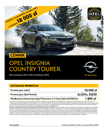 y daż e z r wyp w nia g i s In tem a b z ra 4 201 a k zni roc ł z 0 0 0 18 Cennik OPEL INSIGNIA COUNTRY TOURER. Rok produkcji 2014 / Rok modelowy 2014. AKTUALNA PROMOCJA 18 000 zł Promocyjny Opel Kredyt 3x33%; 50/50 Wydłużona Gwarancja Opel FlexCare 2+2 lata / limit 60 000 km 1 899 zł * Promocyjny rabat *Program ochrony pogwarancyjnej pojazdu oferowany i obsługiwany przez Dealerów marki Opel po wygaśnięciu okresu gwarancji o zakresie tożsamym z gwarancją, oferowany odpłatnie na okres podany w Certyfikacie Wydłużonej Gwarancji Opel FlexCare lub do osiągnięcia przebiegu maksymalnego podanego w Certyfikacie Wydłużonej Gwarancji Opel FlexCare, zależnie od tego, co nastąpi jako pierwsze. Szczegóły programu i inne warianty okresu ochrony przedstawiamy na stronie www.opel.pl / Usługi serwisowe / Wydłużona Gwarancja Opel FlexCare. Promocja współfinansowana przez Dealerów marki Opel biorących w niej udział. Liczba modeli w promocji ograniczona. Promocja dostępna do wyczerpania zapasów. Samochody na składzie dealerskim mogą zawierać dodatkowe, płatne wyposażenie. Prosimy o potwierdzenie dostępności poszukiwanego modelu u Dealera marki Opel. Dokładny opis całej oferty promocyjnej znajduje się na stronie www.opel.pl w sekcji promocje lub dostępny jest u Dealerów marki Opel. Ceny promocyjne (rekomendowane ceny detaliczne brutto pomniejszone o rabat wymieniony na pierwszej stronie cennika) dotyczą klientów indywidualnych (detalicznych). Klientów flotowych (firmy i przedsiębiorstwa prowadzące działalność gospodarczą bądź instytucje prowadzące działalność społeczną, zarejestrowane w Polsce i rejestrujące auto na terenie Polski) w sprawie zapytań ofertowych prosimy o kontakt z wybranym Dealerem marki Opel. www.opel.pl Cennik nr 03/2014 z dnia 1 stycznia 2015, GMPL Cennik – Nowy Opel Insignia Country Tourer 4x4 Rok produkcji 2014, rok modelowy 2014* Ceny promocyjne** Country Tourer 2.0 Turbo Ecotec (250 KM) Start/Stop 4x4 M6 140 100 2.0 Turbo Ecotec (250 KM) 4x4 A6 145 200 2.0 CDTI Ecotec (163 KM) Start/Stop 4x4 M6 126 900 2.0 CDTI Ecotec (163 KM) 4x4 A6 132 000 2.0 CDTI BiTurbo Ecotec (195 KM) 4x4 A6 141 500 * Dotyczy samochodów ze składów dealerskich wyprodukowanych przed 5 maja 2014 roku. ** Promocja współfinansowana przez Dealerów marki Opel biorących w niej udział. Liczba modeli w promocji ograniczona. Promocja dostępna do wyczerpania zapasów. Samochody na składzie dealerskim mogą zawierać dodatkowe, płatne wyposażenie. Prosimy o potwierdzenie dostępności poszukiwanego modelu u Dealera marki Opel. Dokładny opis całej oferty promocyjnej znajduje się na stronie www.opel.pl w sekcji promocje lub dostępny jest u Dealerów marki Opel. Ceny promocyjne (rekomendowane ceny detaliczne brutto pomniejszone o rabat wymieniony na pierwszej stronie cennika) dotyczą klientów indywidualnych (detalicznych). Klientów flotowych (firmy i przedsiębiorstwa prowadzące działalność gospodarczą bądź instytucje prowadzące działalność społeczną, zarejestrowane w Polsce i rejestrujące auto na terenie Polski) w sprawie zapytań ofertowych prosimy o kontakt z wybranym Dealerem marki Opel. Ceny katalogowe Country Tourer 2.0 Turbo Ecotec (250 KM) Start/Stop 4x4 M6 158 100 2.0 Turbo Ecotec (250 KM) 4x4 A6 163 200 2.0 CDTI Ecotec (163 KM) Start/Stop 4x4 M6 144 900 2.0 CDTI Ecotec (163 KM) 4x4 A6 150 000 2.0 CDTI BiTurbo Ecotec (195 KM) 4x4 A6 159500 Wyposażenie standardowe System stabilizacji toru jazdy ESP® Poduszki powietrzne przednie, boczne i kurtynowe Zdalnie sterowany zamek centralny Elektrycznie sterowane szyby z przodu i z tyłu Elektrycznie sterowane i podgrzewane lusterka zewnętrzne Relingi dachowe, srebrne Chromowana listwa ozdobna wokół okien bocznych Dwie widoczne chromowane końcówki układu wydechowego (niedostępne z silnikiem 2.0 CDTI 163 KM) Klimatyzacja dwustrefowa sterowana elektronicznie System multimedialny IntelliLink R700 Touch z 2xUSB i Bluetooth® (zestaw głośnomówiący), podwójny tuner radiowy, kolorowy ekran dotykowy 8,0”, czytnik kart SD, sterowanie komendami głosowymi (tylko jęz. ang./niem.), 7 głośników, antena typu „płetwa rekina”. Wyświetlacz wskaźników kierowcy DIC 4,2” Tempomat z funkcją ogranicznika prędkości Hamulec postojowy sterowany elektrycznie, w wersjach ze skrzynią manualną z układem wspomagania ruszania na pochyłościach Kierownica pokryta skórą z przyciskami sterowania systemami multimedialnymi i komputerem pokładowym Tapicerka materiałowa Quantum/Atlantis, czarna z elementami ze skóry sztucznej Morrocana. Zawiera: komfortowe fotele przednie. Elektryczna regulacja wysokości i podparcia lędźwiowego fotela kierowcy Podgrzewane fotele przednie Podłokietnik tylny z otworem na długie przedmioty Gniazdko 12V w konsoli centralnej / z tyłu konsoli środkowej Zestaw „Dobrej Widoczności”. Zawiera: automatyczne sterowanie światłami z czujnikiem oświetlenia, czujnik deszczu, światłoczułe lusterko wewnętrzne. Pakiet Bezpieczeństwa. Zawiera: aktywne zagłówki foteli przednich, system przypominania o zapięciu pasów bezpieczeństwa z przodu. Obręcze kół ze stopów lekkich 8,0Jx18" z oponami 245/45 R18 96W Podwyższone zawieszenie z adaptacyjnym układem jezdnym FlexRide Kolumny HiPerStrut w zawieszeniu przednim (tylko w wersjach z silnikiem 2.0 Turbo 250 KM) Układ napędowy 4x4 z elektronicznie sterowanym mechanizmem różnicowym o podwyższonym tarciu wewnętrznym eLSD Dolna osłona ochronna silnika Światła do jazdy dziennej LED Reflektory przeciwmgielne Elektrycznie sterowane drzwi bagażnika Wyposażenie dodatkowe NADWOZIE Lakier metaliczny / perłowy Elektrycznie sterowane, składane i podgrzewane lusterka zewnętrzne, światłoczułe lusterko kierowcy Panoramiczne okno dachowe sterowane elektrycznie Przyciemniane szyby boczne tylne oraz szyba tylna Izotermiczna szyba przednia odbijająca promienie słoneczne Hak holowniczy – skł