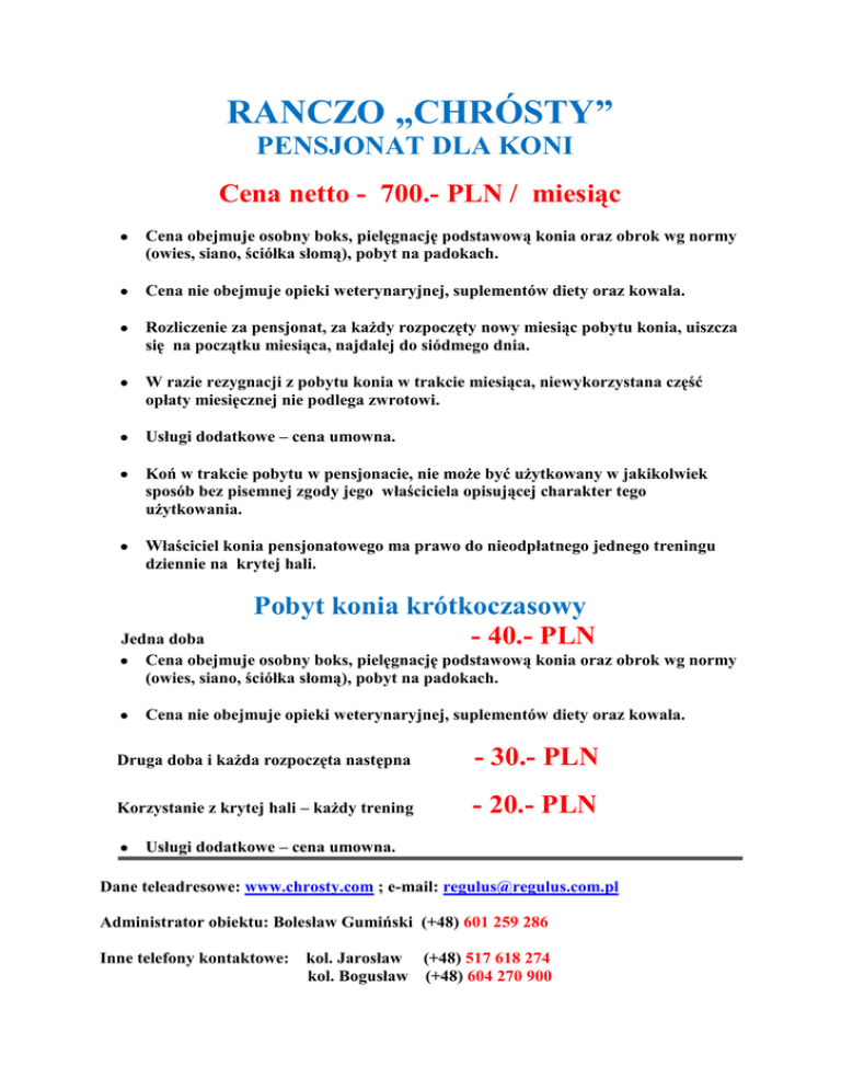 RANCZO „CHRÓSTY” PENSJONAT DLA KONI Cena netto - 700.- PLN / miesiąc Cena obejmuje osobny boks, pielęgnację podstawową konia oraz obrok wg normy (owies, siano, ściółka słomą), pobyt na padokach. Cena nie obejmuje opieki weterynaryjnej, suplementów diety oraz kowala. Rozliczenie za pensjonat, za każdy rozpoczęty nowy miesiąc pobytu konia, uiszcza się na początku miesiąca, najdalej do siódmego dnia. W razie rezygnacji z pobytu konia w trakcie miesiąca, niewykorzystana część opłaty miesięcznej nie podlega zwrotowi. Usługi dodatkowe – cena umowna. Koń w trakcie pobytu w pensjonacie, nie może być użytkowany w jakikolwiek sposób bez pisemnej zgody jego właściciela opisującej charakter tego użytkowania. Właściciel konia pensjonatowego ma prawo do nieodpłatnego jednego treningu dziennie na krytej hali. Pobyt konia krótkoczasowy - 40.- PLN Jedna doba Cena obejmuje osobny boks, pielęgnację podstawową konia oraz obrok wg normy (owies, siano, ściółka słomą), pobyt na padokach. Cena nie obejmuje opieki weterynaryjnej, suplementów diety oraz kowala. Druga doba i każda rozpoczęta następna - 30.- PLN Korzystanie z krytej hali – każdy trening - 20.- PLN Usługi dodatkowe – cena umowna. Dane teleadresowe: www.chrosty.com ; e-mail: [email protected] Administrator obiektu: Bolesław Gumiński (+48) 601 259 286 Inne telefony kontaktowe: kol. Jarosław (+48) 517 618 274 kol. Bogusław (+48) 604 270 900