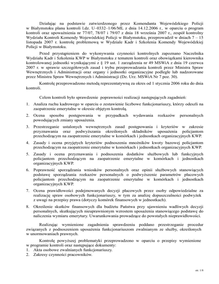 Działając na podstawie zatwierdzonego przez Komendanta Wojewódzkiego Policji w Białymstoku planu kontroli l.dz. U–0332–1/06/ML z dnia 14.12.2006 r., w oparciu o program kontroli oraz upoważnienia nr 77/07, 78/07 i 79/07 z dnia 18 września 2007 r., zespół kontrolny Wydziału Kontroli Komendy Wojewódzkiej Policji w Białymstoku, przeprowadził w dniach 7 – 15 listopada 2007 r. kontrolę problemową w Wydziale Kadr i Szkolenia Komendy Wojewódzkiej Policji w Białymstoku. Przed przystąpieniem do wykonywania czynności kontrolnych zapoznano Naczelnika Wydziału Kadr i Szkolenia KWP w Białymstoku z tematem kontroli oraz obowiązkami kierownika kontrolowanej jednostki wynikającymi z § 19 ust. 1 zarządzenia nr 49 MSWiA z dnia 19 czerwca 2007 r. w sprawie szczegółowych zasad i trybu przeprowadzania kontroli przez Ministra Spraw Wewnętrznych i Administracji oraz organy i jednostki organizacyjne podległe lub nadzorowane przez Ministra Spraw Wewnętrznych i Administracji (Dz. Urz. MSWiA Nr 7 poz. 30). Kontrolę przeprowadzono metodą reprezentatywną za okres od 1 stycznia 2006 roku do dnia kontroli. Celem kontroli było sprawdzenie poprawności realizacji następujących zagadnień: 1. Analiza ruchu kadrowego w oparciu o zestawienie liczbowe funkcjonariuszy, którzy odeszli na zaopatrzenie emerytalne w okresie objętym kontrolą. 2. Ocena sposobu postępowania w powodujących zmiany uposażenia. przypadkach wydawania rozkazów personalnych 3. Przestrzeganie ustalonych wewnętrznych zasad postępowania i kryteriów w zakresie przyznawania oraz podwyższania określonych składników uposażenia policjantom przechodzącym na zaopatrzenie emerytalne w komórkach i jednostkach organizacyjnych KWP. 4. Zasady i ocena przyjętych kryteriów podnoszenia mnożników kwoty bazowej policjantom przechodzącym na zaopatrzenie emerytalne w komórkach i jednostkach organizacyjnych KWP. 5. Zasady i ocena przyznawania i podnoszenia dodatków służbowych lub funkcyjnych policjantom przechodzącym na zaopatrzenie emerytalne w komórkach i jednostkach organizacyjnych KWP. 6. Poprawność sporządzania wniosków personalnych oraz opinii służbowych stanowiących podstawę sporządzania rozkazów personalnych o podwyższenie parametrów płacowych policjantom przechodzącym na zaopatrzenie emerytalne w komórkach i jednostkach organizacyjnych KWP. 7. Ocena prawidłowości podejmowanych decyzji płacowych przez osoby odpowiedzialne za realizację spraw osobowych funkcjonariuszy, w tym za analizę dopuszczalności podwyżek z uwagi na przepisy prawa (dotyczy komórek finansowych w jednostkach). 8. Określenie skutków finansowych dla budżetu Państwa przy ujawnieniu wadliwych decyzji personalnych, skutkujących nieuprawnionym wzrostem uposażenia stanowiącego podstawę do naliczenia wymiaru emerytury. Uwarunkowania prowadzące do powstałych nieprawidłowości. Realizując wymienione zagadnienia sprawdzeniu poddano przestrzeganie procedur związanych z podnoszeniem uposażenia funkcjonariuszom zwalnianym ze służby, określonych w unormowaniach prawnych. Kontrolę powyższej problematyki przeprowadzono w oparciu o przepisy wymienione w programie kontroli oraz następujące dokumenty: 1. Akta osobowe zwalnianych funkcjonariuszy. 2. Zakresy czynności pracowników. str. 1/8 I. USTALENIA KONTROLNE 1. Analiza ruchu kadrowego w oparciu o zestawienie liczbowe funkcjonariuszy, którzy odeszli na zaopatrzenie emerytalne w okresie objętym kontrolą. Na podstawie danych uzyskanych z Wydziału Kadr i Szkolenia KWP w Białymstoku ustalono, że w 2006 r. na zaopatrzenie emerytalne w Komendzie Wojewódzkiej Policji przeszło 39 policjantów, a w roku 2007 – 41. Stanowiło to łącznie około 18,5 % funkcjonariuszy pełniących służbę w jednostce, wg stanu etatowego na dzień 01.09.2007 r. Zwolnienia nastąpiły z tytułu: a) orzeczenia trwałej niezdolności do służby przez komisję lekarską (art. 41 ust.1 pkt 1 ustawy z dnia 6 kwietnia 1990 r. o Policji) – 15 osób, tj. 18,8 % zwolnionych, b) nabycia prawa do emerytury z tytułu osiągnięcia 30 lat wysługi emerytalnej (art. 41 ust. 2 pkt 4 ustawy z dnia 6 kwietnia 1990 r. o Policji) – 36 osób, tj. 45,0 % zwolnionych, c) zgłoszenia przez policjanta wystąpienia ze służby (art. 41 ust. 3 ustawy z dnia 6 kwietnia 1990 r. o Policji) – 28 osób, tj. 35,0 % zwolnionych, d) powołania do innej służby państwowej (art. 41 ust. 2 pkt 3 ustawy z dnia 6 kwietnia 1990r. o Policji) – 1 osoba, tj. 1,3 % zwolnionych. Na podstawie przeprowadzonej analizy stwierdzono, że w kontrolowanym okresie proces zwalniania policjantów ze służby przedstawiał się następująco: a) styczeń 2006 – 7 osób (8,8 % zwolnionych), w tym: − 4 osoby w związku z nabyciem prawa do emerytury z tytułu osiągnięcia 30 lat wysługi emerytalnej, − 2 osoby z tytułu orzeczenia przez komisję lekarską trwałej niezdolności do służby; − 1 osoba z tytułu orzeczenia trwałej niezdolności do służby przez komisję lekarską; b) luty 2006 r. – 24 osoby (30,0 % zwolnionych), w tym: − 13 osób w związku z nabyciem prawa do emerytury z tytułu osiągnięcia 30 lat wysługi emerytalnej, − 6 osób z tytułu orzeczenia przez komisję lekarską trwałej niezdolności do służby, − 5 osób z tytułu zgłoszenia przez policjanta wystąpienia ze służby; c) kwiecień 2006 r. – 3 osoby (3,8 % zwolnionych), w tym: − 2 osoby w związku z nabyciem prawa do emerytury z tytułu osiągnięcia 30 lat wysługi emerytalnej, − 1 osoba z tytułu orzeczenia przez komisję lekarską trwałej niezdolności do służby; d) maj 2006 r. – 3 osoby (3,8 % zwolnionych), w tym: − 1 osoba z tytułu orzeczenia przez komisję lekarską trwałej niezdolności do służby, − 1 osoba w związku z nabyciem prawa do emerytury z tytułu osiągnięcia 30 lat wysługi emerytalnej, − 1 osoba z tytułu zgłoszenia przez policjanta wystąpienia ze służby; e) czerwiec 2006 r. 