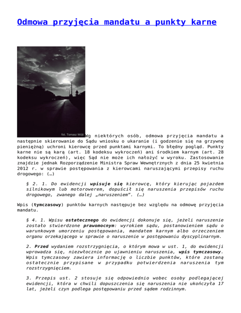 Odmowa przyjęcia mandatu a punkty karne Wg niektórych osób, odmowa przyjęcia mandatu a następnie skierowanie do Sądu wniosku o ukaranie (i godzenie się na grzywnę pieniężną) uchroni kierowcę przed punktami karnymi. To błędny pogląd. Punkty karne nie są karą (art. 18 kodeksu wykroczeń) ani środkiem karnym (art. 28 kodeksu wykroczeń), więc Sąd nie może ich nałożyć w wyroku. Zastosowanie znajdzie jednak Rozporządzenie Ministra Spraw Wewnętrznych z dnia 25 kwietnia 2012 r. w sprawie postępowania z kierowcami naruszającymi przepisy ruchu drogowego: (…) § 2. 1. Do ewidencji wpisuje się kierowcę, który kierując pojazdem silnikowym lub motorowerem, dopuścił się naruszenia przepisów ruchu drogowego, zwanego dalej „naruszeniem”. (…) Wpis (tymczasowy) punktów karnych następuje bez względu na odmowę przyjęcia mandatu. § 4. 1. Wpisu ostatecznego do ewidencji dokonuje się, jeżeli naruszenie zostało stwierdzone prawomocnym: wyrokiem sądu, postanowieniem sądu o warunkowym umorzeniu postępowania, mandatem karnym albo orzeczeniem organu orzekającego w sprawie o naruszenie w postępowaniu dyscyplinarnym. 2. Przed wydaniem rozstrzygnięcia, o którym mowa w ust. 1, do ewidencji wprowadza się, niezwłocznie po ujawnieniu naruszenia, wpis tymczasowy. Wpis tymczasowy zawiera informację o liczbie punktów, które zostaną ostatecznie przypisane w przypadku potwierdzenia naruszenia tym rozstrzygnięciem. 3. Przepis ust. 2 stosuje się odpowiednio wobec osoby podlegającej ewidencji, która w chwili dopuszczenia się naruszenia nie ukończyła 17 lat, jeżeli czyn podlega postępowaniu przed sądem rodzinnym. 4. Wpis tymczasowy staje się wpisem ostatecznym po stwierdzeniu naruszenia rozstrzygnięciem, o którym mowa w ust. 1. (…) § 5. 1. Organ prowadzący ewidencję usuwa z ewidencji wpis tymczasowy, o którym mowa w § 4 ust. 2, jeżeli w postępowaniu w sprawie o naruszenie prowadzonym przez właściwy organ: 1) zastosowano art. 41 ustawy z dnia 20 maja 1971 r. – Kodeks wykroczeń W stosunku do sprawcy czynu można poprzestać na zastosowaniu pouczenia, zwróceniu uwagi, ostrzeżeniu lub na zastosowaniu innych środków oddziaływania wychowawczego. 2) osoba, której dotyczy wpis, została uniewinniona od zarzutu popełnienia naruszenia prawomocnym orzeczeniem; 3) stwierdzono, że: a) czynu nie popełniono albo brak jest danych dostatecznie uzasadniających podejrzenie jego popełnienia, b) czyn nie zawiera znamion czynu zabronionego, c) nastąpiło przedawnienie karalności, d) osoba, której dotyczył wpis, zmarła. 2. Organ prowadzący ewidencję usuwa z ewidencji wpis ostateczny, jeżeli nastąpiło zatarcie ukarania (skazania) lub osoba wpisana do ewidencji zmarła. 3. Organ wydający postanowienie o odmowie wszczęcia lub umorzeniu postępowania powiadamia o tym fakcie jednostkę organizacyjną Policji, o której mowa w § 4 ust. 8. (..) W omawianym Rozporządzeniu znajduje się przepisów ruchu drogowego i liczba punktów nim podstawa prawna z ustawy prawo o ruchu liczba punktów karnych za załącznik nr 1 – wykaz naruszeń odpowiadająca tym naruszeniom, a w drogowym i kodeksu wykroczeń oraz dane wykroczenie. [email protected] *stan prawny: 7 marca 2014 r. Przedawnienie karalności wykroczenia Ustawa z dnia 20 maja 1971 r. Kodeks wykroczeń: Art. 45. § 1. Karalność wykroczenia ustaje, jeżeli od czasu jego popełnienia upłynął rok; jeżeli w tym okresie wszczęto postępowanie, karalność wykroczenia ustaje z upływem 2 lat od popełnienia czynu. § 2. W razie uchylenia prawomocnego rozstrzygnięcia, przedawnienie biegnie od daty uchylenia rozstrzygnięcia. § 2a. W wypadku wszczęcia postępowania mediacyjnego czasu jego trwania nie wlicza się do okresu przedawnienia. – termin roczny z art. 45 par. 1 k.w. liczony jest od popełnienia czynu. Data popełnienia czynu nie zawsze będzie tożsama z datą jego ujawnienia; – prowadzenie czynności wyjaśniających w trybie art. 54 § 1 kodeksu postępowania w sprawach o wykroczenia (k.p.s.w.) nie powoduje wydłużenia okresu przedawnienia ścigania do 2 lat. Ten skutek ma tylko wszczęcie postępowania w sprawach o wykroczenie (art. 45 § 1 in fine k.w.), które następuje z chwilą wydania przez prezesa sądu (przewodniczącego wydziału, upoważnionego sędziego) zarządzenia o wszczęciu takiego postępowania (art. 59 § 2 k.p.s.w.) [Wyrok Sądu Najwyższego z dnia 7 marca 2012 r. II KK 39/12, OSNKW 2012/6/67]; Art. 54. § 1 k.p.s.w. W celu ustalenia, czy istnieją podstawy do wystąpienia z wnioskiem o ukaranie oraz zebrania danych niezbędnych do sporządzenia wniosku o ukaranie, Policja przeprowadza czynności wyjaśniające. Czynności te w miarę możności należy podjąć w miejscu popełnienia czynu bezpośrednio po jego ujawnieniu i zakończyć w ciągu miesiąca. Art. 59 § 2 k.p.s.w. Jeżeli wniosek o ukaranie odpowiada warunkom formalnym, prezes sądu, wszczynając postępowanie zarządzeniem, kieruje sprawę do rozpoznania na rozprawie lub na posiedzeniu albo - w razie stwierdzenia okoliczności wyłączających postępowanie lub wskazanych w art. 61 § 1 - orzekając jednoosobowo, odmawia wszczęcia postępowania. Na postanowienie o odmowie wszczęcia postępowania służy zażalenie osobie, która złożyła zawiadomienie o popełnieniu wykroczenia, ujawnionemu pokrzywdzonemu oraz organowi, który wniósł wniosek o ukaranie. – Jeżeli sąd doszedł do przekonania, iż zebrany w sprawie materiał dowodowy nie pozwala przypisać oskarżonemu przestępstwa, a w grę wchodzi jedynie odpowiedzialność za wykroczenie, za datę wszczęcia postępowania należy uznać dzień, w którym przesłuchano go w charakterze podejrzanego na okoliczność postawionego zarzutu [Wyrok Sądu Najwyższego z dnia 6 czerwca 2011 r. V KK 127/11, LEX nr 817561]; – wszczęcie postępowania (art. 59 par. 2 k.p.s.w.) w sprawie o wykroczenie (wyżej opisane) wydłuża okres przedawn