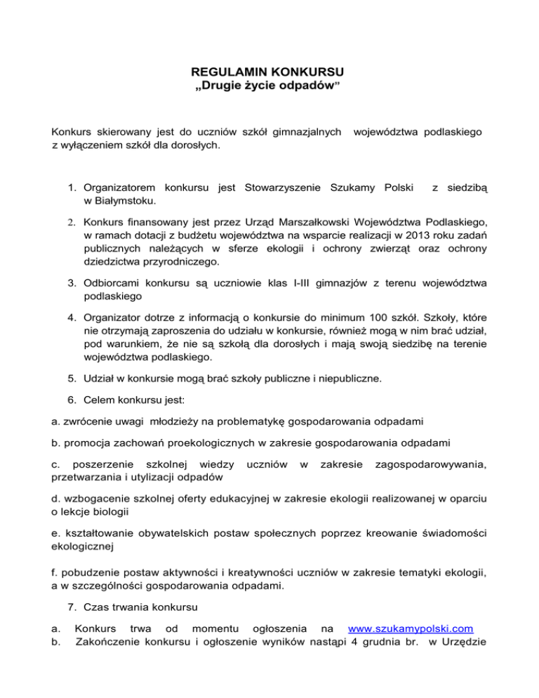 REGULAMIN KONKURSU „Drugie życie odpadów” Konkurs skierowany jest do uczniów szkół gimnazjalnych z wyłączeniem szkół dla dorosłych. województwa podlaskiego 1. Organizatorem konkursu jest Stowarzyszenie Szukamy Polski w Białymstoku. z siedzibą 2. Konkurs finansowany jest przez Urząd Marszałkowski Województwa Podlaskiego, w ramach dotacji z budżetu województwa na wsparcie realizacji w 2013 roku zadań publicznych należących w sferze ekologii i ochrony zwierząt oraz ochrony dziedzictwa przyrodniczego. 3. Odbiorcami konkursu są uczniowie klas I-III gimnazjów z terenu województwa podlaskiego 4. Organizator dotrze z informacją o konkursie do minimum 100 szkół. Szkoły, które nie otrzymają zaproszenia do udziału w konkursie, również mogą w nim brać udział, pod warunkiem, że nie są szkołą dla dorosłych i mają swoją siedzibę na terenie województwa podlaskiego. 5. Udział w konkursie mogą brać szkoły publiczne i niepubliczne. 6. Celem konkursu jest: a. zwrócenie uwagi młodzieży na problematykę gospodarowania odpadami b. promocja zachowań proekologicznych w zakresie gospodarowania odpadami c. poszerzenie szkolnej wiedzy przetwarzania i utylizacji odpadów uczniów w zakresie zagospodarowywania, d. wzbogacenie szkolnej oferty edukacyjnej w zakresie ekologii realizowanej w oparciu o lekcje biologii e. kształtowanie obywatelskich postaw społecznych poprzez kreowanie świadomości ekologicznej f. pobudzenie postaw aktywności i kreatywności uczniów w zakresie tematyki ekologii, a w szczególności gospodarowania odpadami. 7. Czas trwania konkursu a. b. Konkurs trwa od momentu ogłoszenia na www.szukamypolski.com Zakończenie konkursu i ogłoszenie wyników nastąpi 4 grudnia br. w Urzędzie Marszałkowskim Województwa Podlaskiego w Białymstoku, ul. Kard. S. Wyszyńskiego 8. Organizator zastrzega sobie prawo do zmiany terminu zakończenia konkursu. 9. Konkurs polega na przygotowaniu pracy obrazującej drugie życie odpadów, czyli formy i możliwości wykorzystania i zagospodarowania odpadów. 10.Praca konkursowa może mieć formę: A. merytoryczną (opisową) - np. opowiadanie, rozprawka, wywiad, inne na temat zagospodarowania i nadania drugiego życia odpadom. Taka praca powinna być przygotowana w postaci: a.a prezentacji w programie Power Point (lub podobnym w innym systemie operacyjnym- możliwym do odtworzenia w systemie Windows). Prezentacja nie może być dłuższa niż niż 15 slajdów. a.b. filmu o czasie max: 4 minuty w jednym z formatów takich jak: MPG, AVI. MP4 B. rzeczową – praca plastyczna, przestrzenna, inna z wykorzystaniem odpadów. Wielkość takiej pracy nie może przekroczyć wymiarów 1mx0,5mx0,5m. Dodatkowo taka praca powinna zostać zobrazowana w postaci prezentacji w programie Power Point (lub podobnym w innym systemie operacyjnym- możliwym do odtworzenia w systemie Windows) ukazującej ideę, pomysł, przebieg powstawania, kolejne etapy pracy oraz wyjaśnienia i opis dotyczący pracy. Prezentacja nie może być dłuższa niż 10 slajdów. 11.W konkursie honorowane są prace indywidualne oraz grupowe, z tym że wielkość grupy nie może przekroczyć 5 osób. 12.Jedna szkoła może zgłosić do konkursu nieograniczoną liczbę prac. 13.Termin nadsyłania prac upływa 21 listopada 2013 włącznie – liczy się termin wpłynięcia pracy do siedziby Organizatora konkursu. 14.Prace należy składać osobiście lub przesyłać na adres siedziby Stowarzyszenia Szukamy Polski: ul. Młynowa 17, 15-404 Białystok (III piętro) z dopiskiem: Konkurs „Drugie życie odpadów”. 15.Prace, które wpłynęły po terminie nie będą podlegały ocenie konkursowej. 16.Prace oceniane będą przez 3-osobową kapitułę Konkursu powołaną przez Organizatora. W skład kapituły wchodzić będzie jeden przedstawiciel Urzędu Marszałkowskiego Województwa Podlaskiego, jeden przedstawiciel Organizatora oraz jedna osoba powołana przez Organizatora – specjalista z zakresu ekologii, ochrony środowiska, lub dziedziny pokrewnej. 17.Zgłoszenie do konkursu powinno zawierać: a. Imię i nazwisko autora pracy lub autorów w przypadku pracy grupowej b. nazwa i pełen adres szkoły c. numer kontaktowy telefonu oraz e-mail do nauczyciela (opiekuna ucznia lub grupy uczniów). 18.Zgłoszenie do konkursu pracy bez podania danych zawartych w pkt. 17 Regulaminu będzie skutkowało wykluczeniem pracy z Konkursu. 19.Kapituła Konkursu wyłoni po trzech laureatów konkursu (I, II, III miejsce) w każdej z kategorii- tj. praca merytoryczna i praca plastyczna (przestrzenna). 20.Organizator zastrzega sobie prawo do wyłonienia nagród równorzędnych oraz wyróżnień. 21.Nagrodami w Konkursie są nagrody rzeczowe, puchary oraz dyplomy. 22.Ogłoszenie wyników i wręczenia nagród odbędzie się 4 grudnia br. w Urzędzie Marszałkowskim Województwa Podlaskiego w Białymstoku, ul. Kard. S. Wyszyńskiego 1 na specjalnej gali, podczas której zorganizowana zostanie wystawa najciekawszych prac, uczniowie zaprezentują wybrane prace konkursowe, zostaną ogłoszone wyniki konkursu oraz wręczone nagrody. 23.Podczas gali zaprezentowane zostaną (przestrzenne) oraz merytoryczne. najciekawsze prace plastyczne 24.Organizator na co najmniej 5 dni przed galą zaprosi do udziału w niej wybranych autorów prac wraz z opiekunami. 25.Autorzy wybranych przez Organizatora prac zostaną zaproszeni do dokonania podczas gali prezentacji swoich prac w oparciu o wcześniej przygotowane prezentacje konkursowe. 26.Organizator nie pokrywa kosztów dojazdu na galę. 27. Szkoła zobowiązana jest do zapewnienia opieki nieletnim uczestnikom konkursu podczas dojazdu na galę i powrotu z niej. 28.Organizator zastrzega sobie prawo do zmiany terminu gali, o czym powiadomi uczestników z co najmniej 7-dniowym wyprzedzeniem. 29.Organizator nie zwraca prac konkursowych ich autorom. 30.Organizator dopuszcza możliwość zwrotu pracy na prośbę Autora. Pisemna prośba o zwrot pracy po