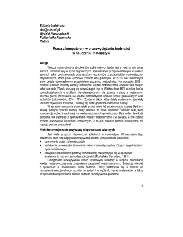 Elżbieta Lodzińska [email protected] Wydział Nauczycielski Politechnika Radomska Radom Praca z komputerem w przezwyciężaniu trudności w nauczaniu matematyki Wstęp Wiedza matematyczna absolwentów szkół różnych typów jest z roku na rok coraz słabsza. Potwierdzają to wyniki tegorocznych sprawdzianów przeprowadzonych w klasach szóstych szkół podstawowych oraz rezultaty egzaminów z przedmiotów matematycznoprzyrodniczych, które pisali uczniowie trzecich klas gimnazjów. W 2010 roku matematyka znów będzie obowiązkowym przedmiotem egzaminu maturalnego. Na początku 2009 r. niektóre kuratoria oświaty zaczęły sprawdzać wiedzę matematyczną uczniów klas drugich szkół średnich. Wyniki okazują się zatrważające. Np. w Wielkopolsce 46% uczniów liceów ogólnokształcących o profilach niematematycznych nie zdałoby matury z matematyki. Jeszcze gorzej przedstawia się wiedza matematyczna uczniów liceów profilowanych oraz techników (odpowiednio 83% i 76%). Zbadano także, które działy matematyki sprawiały uczniom największe trudności – okazały się nimi: geometria i własności funkcji. W sprawie nauczania matematyki przez wiele lat podejmowano szereg błędnych decyzji. Kolejne reformy oświaty miały sprawić, że nowe pokolenia Polaków będą dużą konkurencją wobec innych nacji na międzynarodowych rynkach pracy. Dziś widać, że młode pokolenie ma trudności z opanowaniem wiedzy matematycznej i w związku z tym rzadko wybiera studiowanie kierunków technicznych. A to jest zjawisko bardzo niekorzystne dla rozwoju polskiej gospodarki. Niektóre emocjonalne przyczyny niepowodzeń szkolnych Jest wiele przyczyn niepowodzeń szkolnych w matematyce. W nauczaniu tego przedmiotu dużą rolę odgrywa rozwiązywanie zadań. Umiejętność ta umożliwia: • opanowanie pojęć matematycznych, • kształcenie umiejętności stosowania metod matematycznych w różnych zagadnieniach życia codziennego, • rozwijanie odpowiedniej postawy intelektualnej przejawiającej się w sprawnym analizowaniu różnych zachodzących zjawisk [Puchalska, Semadeni, 1981]. Umiejętność rozwiązywania zadań tekstowych świadczy o stopniu opanowania wiedzy matematycznej oraz zrozumieniu zagadnień matematycznych. Świadczy również o sprawności w analizowaniu treści zadania. Efekty kształcenia są tu zależne od nastawienia emocjonalnego uczniów do zadań i w ogóle do samej matematyki, a także od sposobu funkcjonowania dziecka podczas rozwiązywania problemu. 11 Według E. Gruszczyk-Kolczyńskiej dzieci, które miały nadmierne trudności w uczeniu się matematyki, postrzegały sytuację trudną intelektualnie jako nieznośną emocjonalnie. Oprócz reakcji obronnych stwierdzono u tych uczniów obniżoną odporność emocjonalną i zbytnie poddawanie się frustracji. W konsekwencji uczniowie nie rozwiązywali zadań matematycznych i zaczęła powstawać blokada procesu uczenia się matematyki [Gruszczyk-Kolczyńska, 2008]. Największym problemem dla uczniów wszystkich szczebli edukacji są zadania tekstowe, do rozwiązania których niezbędne są następujące czynności: • przeczytanie tekstu zadania z tzw. zrozumieniem, • dokonanie analizy zadania – określenie danych i niewiadomych oraz ustalenie zachodzących między nimi zależności, • przełożenie treści zadania na język matematyczny. Te złożone czynności intelektualne przebiegają na podłożu procesów emocjonalnych. Czy uczeń podejmie próbę rozwiązywania zadania czy też nie – o tym w dużej mierze zadecydują emocje [Gruszczyk-Kolczyńska, 2008]. Odczuwanie trudności występujących w trakcie prób rozwiązywania zadania jest bardzo subiektywne. Decydującą rolę odgrywają tu indywidualne doświadczenia ucznia [Kozielecki, 1996]. Ale na to, czy dziecko zacznie rozwiązywać zadanie, duży wpływ mają warunki, w jakich ma to robić – czy będzie to czyniło wspólnie z rówieśnikami czy indywidualnie, czy nie grozi mu ośmieszenie w przypadku niepowodzenia. E. Gruszczyk-Kolczyńska przeprowadziła szereg badań wśród dzieci mających trudności w opanowaniu wiedzy matematycznej. Zaobserwowała następujące reakcje: • gwałtowne narastanie napięcia i emocji ujemnych (np. opuszczanie głowy, kulenie się, zaciskanie rąk), • silną regresję zachowań (np. wielokrotne powtarzanie nieskutecznych czynności, przepisywanie zadania, zgadywanie wyniku), • dążenie do możliwie szybkiego przerwania zajmowania się zadaniem. Moje długoletnie doświadczenia w pracy nauczyciela matematyki potwierdzają powyższe wyniki badań. Można powiedzieć, że dziecko znacznie więcej energii poświęcało na to, jak uwolnić się od konieczności rozwiązywania zadania, niż na czynności intelektualne pozwalające przeanalizować treść zadania. Zdaniem K. Obuchowskiego emocje stanowią subiektywny składnik odzwierciedlania rzeczywistości, a wartościowanie emocjonalne faktów i zjawisk jest integralnym składnikiem obrazu świata, jaki tworzy sobie każdy człowiek [Obuchowski, 1982; Obuchowski, 2004]. Dlatego, aby pomóc dziecku w przezwyciężaniu trudności w nauce, konieczne jest uwzględnienie w procesie dydaktycznym indywidualizacji nauczania. Nie jest to łatwe przy przeładowanych programach nauczania w stosunku do liczby przeznaczonych na ich realizację godzin i ciągle jeszcze przy zbyt licznych zespołach klasowych. Komputer i Internet – narzędzia ułatwiające nauczanie matematyki. Aby wspomóc dzieci, u których występują trudności w opanowaniu wiedzy matematycznej, głównie spowodowane negatywnymi emocjami, nauczyciele stosują 12 odpowiednie metody nauczania. Obecnie jedną z najbardziej pomocnych jest praca z komputerem, która powoduje: • zwiększenie atrakcyjności zajęć, • zwiększenie skuteczności przyswajania wiedzy, • umożliwienie wielokrotnego powtarzania materiału [Molga, 2001]. Dla większości dzieci komputer jest ciągle fascynującym urz