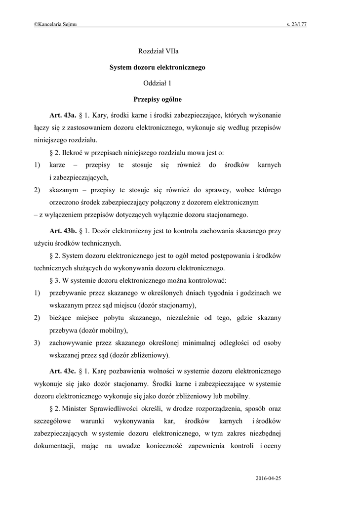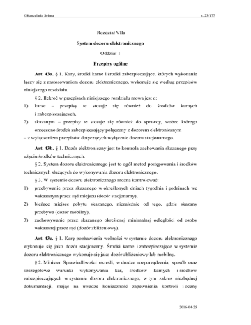 ©Kancelaria Sejmu s. 23/177 Rozdział VIIa System dozoru elektronicznego Oddział 1 Przepisy ogólne Art. 43a. § 1. Kary, środki karne i środki zabezpieczające, których wykonanie łączy się z zastosowaniem dozoru elektronicznego, wykonuje się według przepisów niniejszego rozdziału. § 2. Ilekroć w przepisach niniejszego rozdziału mowa jest o: 1) karze – przepisy te stosuje się również do środków karnych i zabezpieczających, 2) skazanym – przepisy te stosuje się również do sprawcy, wobec którego orzeczono środek zabezpieczający połączony z dozorem elektronicznym – z wyłączeniem przepisów dotyczących wyłącznie dozoru stacjonarnego. Art. 43b. § 1. Dozór elektroniczny jest to kontrola zachowania skazanego przy użyciu środków technicznych. § 2. System dozoru elektronicznego jest to ogół metod postępowania i środków technicznych służących do wykonywania dozoru elektronicznego. § 3. W systemie dozoru elektronicznego można kontrolować: 1) przebywanie przez skazanego w określonych dniach tygodnia i godzinach we wskazanym przez sąd miejscu (dozór stacjonarny), 2) bieżące miejsce pobytu skazanego, niezależnie od tego, gdzie skazany przebywa (dozór mobilny), 3) zachowywanie przez skazanego określonej minimalnej odległości od osoby wskazanej przez sąd (dozór zbliżeniowy). Art. 43c. § 1. Karę pozbawienia wolności w systemie dozoru elektronicznego wykonuje się jako dozór stacjonarny. Środki karne i zabezpieczające w systemie dozoru elektronicznego wykonuje się jako dozór zbliżeniowy lub mobilny. § 2. Minister Sprawiedliwości określi, w drodze rozporządzenia, sposób oraz szczegółowe warunki wykonywania kar, środków karnych i środków zabezpieczających w systemie dozoru elektronicznego, w tym zakres niezbędnej dokumentacji, mając na uwadze konieczność zapewnienia kontroli i oceny 2016-04-25 ©Kancelaria Sejmu s. 24/177 zachowania osób, wobec których orzeczono te kary, środki karne lub środki zabezpieczające. Art. 43d. § 1. Nadzór nad wykonywaniem kar z zastosowaniem dozoru elektronicznego oraz orzekanie w sprawach dotyczących wykonania tych kar należą do sądu, o którym mowa w art. 43e. § 2. Nadzór, o którym mowa w § 1, obejmuje kontrolę i ocenę: 1) legalności i prawidłowości wykonywania orzeczonej kary, 2) prawidłowości obliczania okresów wykonywania orzeczonej kary w systemie dozoru elektronicznego, 3) wykonywania zadań probacyjnych i działalności wychowawczej sądowego kuratora zawodowego oraz przebiegu procesu resocjalizacji skazanego, 4) działalności upoważnionego podmiotu dozorującego w zakresie wykonywania obowiązków przez skazanego, 5) kolejności wykonywania orzeczeń, jak również prawidłowości zawiadamiania o wystąpieniu warunków technicznych pozwalających na niezwłoczne rozpoczęcie wykonania orzeczonej kary lub o dacie, od której będzie to możliwe. § 3. Czynności związane z organizowaniem i kontrolowaniem wykonywania kar z zastosowaniem dozoru elektronicznego oraz nałożonych w związku z nimi obowiązków wykonuje sądowy kurator zawodowy. Przepisy o dozorze i kuratorze sądowym stosuje się odpowiednio. Art. 43e. § 1. W sprawach związanych z udzieleniem zezwolenia na odbycie kary pozbawienia wolności w systemie dozoru elektronicznego właściwy jest sąd penitencjarny, w którego okręgu skazany przebywa. § 2. W sprawach zezwolenia na związanych odbycie kary z wykonaniem pozbawienia postanowienia wolności o udzieleniu w systemie dozoru elektronicznego i jego uchyleniem właściwy jest sąd penitencjarny, w którego okręgu kara jest wykonywana, z wyjątkiem uchylenia zezwolenia z powodów, o których mowa w art. 43zaa § 1 pkt 1, kiedy to właściwy jest sąd penitencjarny, który zezwolenia udzielił. § 3. W sprawach wykonywania dozoru zbliżeniowego i mobilnego właściwy jest sąd, w którego okręgu skazany ma miejsce stałego pobytu, a jeżeli skazany nie 2016-04-25 ©Kancelaria Sejmu s. 25/177 posiada takiego miejsca – sąd, w którego okręgu orzeczono środek karny lub zabezpieczający wykonywany w systemie dozoru elektronicznego. Art. 43f. § 1. Środkami technicznymi służącymi do wykonywania dozoru elektronicznego są: 1) centrala monitorowania, 2) system teleinformatyczny, za pomocą którego podmiot prowadzący centralę monitorowania, podmiot dozorujący, sądy, sądowi kuratorzy zawodowi i inne uprawnione podmioty przetwarzają informacje związane z organizowaniem i kontrolowaniem wykonywania kar w systemie dozoru elektronicznego (system komunikacyjno-monitorujący), 3) nadajniki, 4) rejestratory stacjonarne i przenośne. § 2. Minister Sprawiedliwości określi, w drodze rozporządzenia, szczegółowe warunki techniczne i wymagania funkcjonalne, jakie powinny spełniać środki techniczne służące do wykonywania dozoru elektronicznego, a także sposób funkcjonowania systemu komunikacyjno-monitorującego, w tym sposób przekazywania danych wewnątrz tego systemu, mając na względzie konieczność zapewnienia prawidłowego działania systemu dozoru elektronicznego oraz zabezpieczenia danych osobowych i informacji związanych z działaniem tego systemu przed ich nieuprawnionym ujawnieniem. Art. 43g. § 1. Dozór elektroniczny wykonywany jest przez: 1) podmiot prowadzący centralę monitorowania – w zakresie czynności związanych z obsługą tej centrali, 2) podmiot dozorujący – w zakresie pozostałych czynności. § 2. Podmiotem prowadzącym centralę monitorowania jest podmiot dozorujący lub jednostka organizacyjna podległa Ministrowi Sprawiedliwości. § 3. Podmiotem dozorującym może być przedsiębiorca, instytucja państwowa lub podmiot zagraniczny będący przedsiębiorcą w rozumieniu prawa kraju rejestracji i spełniający warunki do wykonywania w Rzeczypospolitej Polskiej działalności gospodarczej. § 4. Minister Sprawiedliwości dokonuje wyboru podmiotu dozorującego, o którym mowa w § 3, w trybie ok