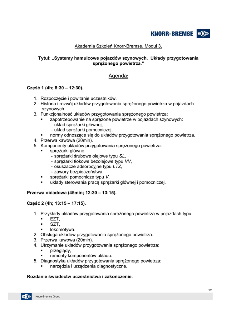 Akademia Szkoleń Knorr-Bremse. Moduł 3. Tytuł: „Systemy hamulcowe pojazdów szynowych. Układy przygotowania sprężonego powietrza.” Agenda: Część 1 (4h; 8:30 – 12:30). 1. Rozpoczęcie i powitanie uczestników. 2. Historia i rozwój układów przygotowania sprężonego powietrza w pojazdach szynowych. 3. Funkcjonalność układów przygotowania sprężonego powietrza: zapotrzebowanie na sprężone powietrze w pojazdach szynowych: - układ sprężarki głównej, - układ sprężarki pomocniczej, normy odnoszące się do układów przygotowania sprężonego powietrza. 4. Przerwa kawowa (20min). 5. Komponenty układów przygotowania sprężonego powietrza: sprężarki główne: - sprężarki śrubowe olejowe typu SL, - sprężarki tłokowe bezolejowe typu VV, - osuszacze adsorpcyjne typu LTZ, - zawory bezpieczeństwa, sprężarki pomocnicze typu V. układy sterowania pracą sprężarki głównej i pomocniczej. Przerwa obiadowa (45min; 12:30 – 13:15). Część 2 (4h; 13:15 – 17:15). 1. Przykłady układów przygotowania sprężonego powietrza w pojazdach typu: EZT, SZT, lokomotywa. 2. Obsługa układów przygotowania sprężonego powietrza. 3. Przerwa kawowa (20min). 4. Utrzymanie układów przygotowania sprężonego powietrza: przeglądy, remonty komponentów układu. 5. Diagnostyka układów przygotowania sprężonego powietrza: narzędzia i urządzenia diagnostyczne. Rozdanie świadectw uczestnictwa i zakończenie. 1/1 Knorr-Bremse Group