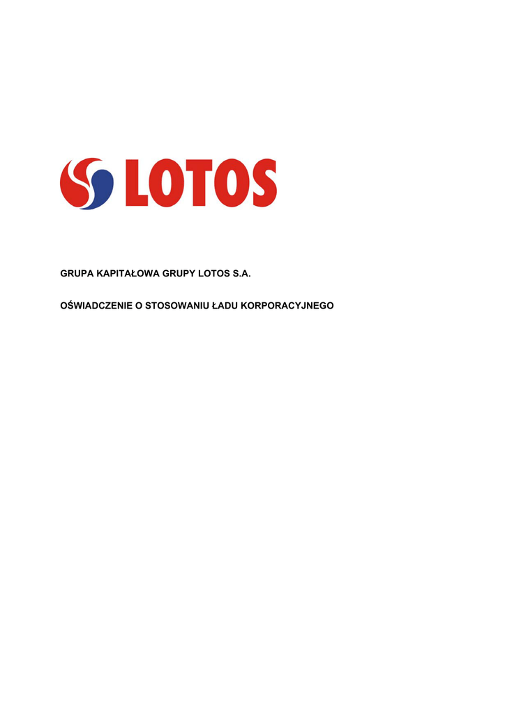 GRUPA KAPITAŁOWA GRUPY LOTOS S.A. OŚWIADCZENIE O STOSOWANIU ŁADU KORPORACYJNEGO GRUPA KAPITAŁOWA GRUPY LOTOS S.A. OŚWIADCZENIE O STOSOWANIU ŁADU KORPORACYJNEGO Spis treści: 1. Zbiór zasad ładu korporacyjnego, któremu podlega Grupa LOTOS S.A.......................................... 3 2. Systemy kontroli wewnętrznej i zarządzania ryzykiem ..................................................................... 5 3. Akcjonariusze posiadających znaczne pakiety akcji......................................................................... 6 4. Posiadacze wszelkich papierów wartościowych, które dają specjalne uprawnienia kontrolne, wraz z opisem tych uprawnień .................................................................................................................. 7 5. Ograniczenia odnośnie wykonywania prawa głosu .......................................................................... 7 6. Ograniczenia dotyczące przenoszenia prawa własności papierów wartościowych ......................... 7 7. Zasady zmiany statutu Grupy LOTOS S.A. ...................................................................................... 7 8. Zgromadzenie Akcjonariuszy Grupy LOTOS S.A............................................................................. 8 9. Rada Nadzorcza Grupy LOTOS S.A. ............................................................................................. 12 10. Zarząd Grupy LOTOS S.A. oraz zasady powoływania i odwoływania osób zarządzających ........ 19 11. Podpisy Członków Zarządu ............................................................................................................ 26 2 GRUPA KAPITAŁOWA GRUPY LOTOS S.A. OŚWIADCZENIE O STOSOWANIU ŁADU KORPORACYJNEGO 1. Zbiór zasad ładu korporacyjnego, któremu podlega Grupa LOTOS S.A. Grupa LOTOS S.A. podlega zbiorowi zasad ładu korporacyjnego pod nazwą „Dobre praktyki spółek notowanych na GPW”, który został przyjęty przez Radę Nadzorczą Giełdy Papierów Wartościowych w dniu 4 lipca 2007 roku. Pełen tekst zbioru zasad jest dostępny publicznie na stronie internetowej Giełdy Papierów Wartościowych S.A. w Warszawie w sekcji poświęconej Zasadom Ładu Korporacyjnego http://www.corp-gov.gpw.pl/assets/library/polish/dobrepraktyki2007.pdf W 2008 roku Grupa LOTOS S.A. wydała dwa komunikaty związane z nieprzestrzeganiem zasad zawartych w zbiorze „Dobre praktyki spółek notowanych na GPW”. W dniu 1 stycznia 2008 r. Zarząd Grupy LOTOS S.A. w związku z wejściem w życie zasad ładu korporacyjnego "Dobre Praktyki Spółek Notowanych na GPW" oraz na podstawie §29 pkt.3 Regulaminu Giełdy Papierów Wartościowych w Warszawie S.A. poinformował w komunikacie, iż Grupa LOTOS S.A. nie stosuje następujących zasad: - Zasady nr 1.11 z działu II "Spółka prowadzi korporacyjną stronę internetową i zamieszcza na niej: […] powzięte przez zarząd, na podstawie oświadczenia członka rady nadzorczej, informacje o powiązaniach członka rady nadzorczej z akcjonariuszem dysponującym akcjami reprezentującymi nie mniej niż 5% ogólnej liczby głosów na walnym zgromadzeniu spółki." Powyższa zasada nie jest stosowana ze względu na fakt, że Grupa LOTOS S.A. nie posiada informacji o powiązaniach członków rady nadzorczej z akcjonariuszem dysponującym akcjami reprezentującymi nie mniej niż 5% ogólnej liczby głosów na walnym zgromadzeniu. Spółka planuje wprowadzenie procedury pozyskiwania ww. informacji, która umożliwi wypełnianie powyższej zasady. - Zasady nr 6 z działu III "Przynajmniej dwóch członków rady nadzorczej powinno spełniać kryteria niezależności od spółki i podmiotów pozostających w istotnym powiązaniu ze spółką. W zakresie kryteriów niezależności członków rady nadzorczej powinien być stosowany Załącznik II do Zalecenia Komisji Europejskiej z dnia 15 lutego 2005 r. dotyczącego roli dyrektorów niewykonawczych lub będących członkami rady nadzorczej spółek giełdowych i komisji rady (nadzorczej). Niezależnie od postanowień pkt b) wyżej wymienionego Załącznika osoba będąca pracownikiem spółki, podmiotu zależnego lub podmiotu stowarzyszonego nie może być uznana za spełniającą kryteria niezależności, o których mowa w tym Załączniku. Ponadto za powiązanie z akcjonariuszem wykluczające przymiot niezależności członka rady nadzorczej w rozumieniu niniejszej zasady rozumie się rzeczywiste i istotne powiązanie z akcjonariuszem 3 GRUPA KAPITAŁOWA GRUPY LOTOS S.A. OŚWIADCZENIE O STOSOWANIU ŁADU KORPORACYJNEGO mającym prawo do wykonywania 5 % i więcej ogólnej liczby głosów na walnym zgromadzeniu." Powyższa zasada nie jest stosowana ze względu na fakt, że Grupa LOTOS S.A. nie posiada informacji dotyczących niezależności członków rady nadzorczej oraz fakt, iż dotychczas, ze względu na obecny akcjonariat oraz jej rolę w polskim sektorze paliwowym, nie funkcjonowała instytucja członków niezależnych rady nadzorczej. Spółka rozpocznie stosowanie powyższej zasady po otrzymaniu informacji dotyczącej powołania lub uznania co najmniej dwóch członków rady nadzorczej za członków niezależnych zgodnie z załącznikiem II do Zalecenia Komisji Europejskiej z dnia 15 lutego 2005 r. dotyczącego roli dyrektorów niewykonawczych lub będących członkami rady nadzorczej spółek giełdowych i komisji rady (nadzorczej). - Zasady nr 7 z działu III "W ramach rady nadzorczej powinien funkcjonować co najmniej komitet audytu. W skład tego komitetu powinien wchodzić co najmniej jeden członek niezależny od spółki i podmiotów pozostających w istotnym powiązaniu ze spółką, posiadający kompetencje w dziedzinie rachunkowości i finansów. W spółkach, w których rada nadzorcza składa się z minimalnej wymaganej przez prawo liczby członków, zadania komitetu mogą być wykonywane przez radę nadzorczą." Powyższa zasada nie jest stosowana ze względu na brak niezależnych