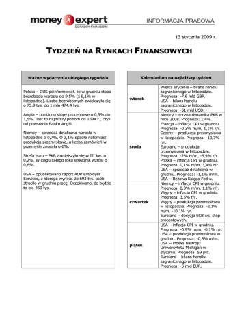 13 stycznia 2009 r. TYDZIEŃ NA RYNKACH FINANSOWYCH WaŜne wydarzenia ubiegłego tygodnia Polska – GUS poinformował, Ŝe w grudniu stopa bezrobocia wzrosła do 9,5% (z 9,1% w listopadzie). Liczba bezrobotnych zwiększyła się o 75,9 tys. do 1 mln 474,4 tys. Kalendarium na najbliŜszy tydzień wtorek Anglia – obniŜono stopy procentowe o 0,5% do 1,5%. Jest to najniŜszy poziom od 1694 r., czyli od powstania Banku Anglii. Niemcy – sprzedaŜ detaliczna wzrosła w listopadzie o 0,7%. O 3,1% spadła natomiast produkcja przemysłowa, a liczba zamówień w przemyśle zmalała o 6%. środa Strefa euro – PKB zmniejszyło się w III kw. o 0,2%. W ciągu całego roku wskaźnik wzrósł o 0,6%. USA – opublikowano raport ADP Employer Services, z którego wynika, Ŝe 693 tys. osób straciło w grudniu pracę. Oczekiwano, Ŝe będzie to ok. 450 tys. czwartek piątek Wielka Brytania – bilans handlu zagranicznego w listopadzie. Prognoza: -7,6 mld GBP. USA – bilans handlu zagranicznego w listopadzie. Prognoza: -51 mld USD. Niemcy – roczna dynamika PKB w roku 2008. Prognoza: 1,4%. Francja – inflacja CPI w grudniu. Prognoza: -0,3% m/m, 1,1% r/r. Czechy – produkcja przemysłowa w listopadzie. Prognoza: -10,7% r/r. Euroland – produkcja przemysłowa w listopadzie. Prognoza: -2% m/m, -5,9% r/r. Polska – inflacja CPI w grudniu. Prognoza: 0,1% m/m, 3,4% r/r. USA – sprzedaŜ detaliczna w grudniu. Prognoza: -1,1% m/m. USA – BeŜowa Księga Fed-u. Niemcy – inflacja CPI w grudniu. Prognoza: 0,3% m/m, 1,1% r/r. Węgry – inflacja CPI w grudniu. Prognoza: 3,5% r/r. Węgry – produkcja przemysłowa w listopadzie. Prognoza: -2,1% m/m, -10,1% r/r. Euroland – decyzja ECB ws. stóp procentowych. USA – inflacja CPI w grudniu. Prognoza: -0,9% m/m, -0,1% r/r. USA – produkcja przemysłowa w grudniu. Prognoza: -0,8% m/m. USA – indeks nastroju Uniwersytetu Michigan w styczniu. Prognoza: 59 pkt. Euroland – bilans handlu zagranicznego w listopadzie. Prognoza: -5 mld EUR. Podsumowanie tygodnia – POLSKA Rynek akcji Pierwszy tydzień 2009 roku rozpoczął się od konkretnego ruchu w górę. Euforia noworoczna najwyraźniej rozlała się po krajowym parkiecie. Jeszcze przed południem główne indeksy były o 3,5% wyŜsze niŜ na koniec 2008 r. Wzrost udało się utrzymać do zamknięcia notowań. Ostatecznie WIG finiszował z wynikiem +4,05%, a WIG20 +4,95%. W przypadku tego ostatniego indeksu najbardziej wzrósł Bioton, bo aŜ o 10%. Wzrost lub spadek tego waloru o kilka groszy powoduje ogromne wahania. Bardzo ładnie zachowywał się KGHM (+8,46%), choć cena miedzi nie uległa większym zmianom. O 8,78% wzrosła wartość akcji Cersanitu, po blisko 7% zyskały Pekao SA i TP SA. Najsłabiej tego dnia wypadły obroty, których wartość nieznacznie przekroczyła 700 mln zł. Wtorek nie był juŜ tak pełen emocji, ale nadal wzrostowy. Po niewielkim porannym spadku do końca dnia utrzymał się poniedziałkowy trend. WIG20 osiągnął poziom 1920 pkt. (+2,29%) i tym samym znalazł się najwyŜej od października ubiegłego roku. O 4 gr podroŜały walory Biotonu, ale to wystarczyło, by wartość spółki, bez Ŝadnej konkretnej przyczyny, wzrosła o 18%. Akcjom KGHM-u udało się utrzymać 8-procentowy wzrost, nieźle radziły sobie takŜe Getin (+7,21%) oraz Polnord (+4,8%). Indeks szerokiego rynku, WIG, zakończył dzień o 2,12% powyŜej poniedziałkowego zamknięcia. Co waŜniejsze, obroty przekroczyły 1 mld zł. W środę niewiele zostało z optymizmu z dwóch poprzednich dni, choć jeszcze na samym początku sesji byki twardo walczyły. Jednak przed południem do głosu doszli sprzedający. Podobny scenariusz miały notowania na parkietach całego świata. WIG oraz WIG20 straciły ostatecznie odpowiednio 1,44% i 1,7%. W gronie blue chipów na niewielkim plusie zakończyły dzień PGNiG oraz KGHM. Czwartkowe notowania przypominały te z poprzedniej sesji. Po raz pierwszy w tym tygodniu niewielki spadek wartości odnotował KGHM. O 2,5% wzrosła cena akcji PKN Orlen, pomimo Ŝe cena ropy za baryłkę spadała (we wtorek był to nawet spadek na poziomie 12%). Ostatecznie barometr blue chipów stracił 1,3%, a indeks całego rynku WIG – 1,11%. Niestety w piątek niewiele się zmieniło. Choć z samego rana to kupujący mieli głos, później oddali inicjatywę (gdyby sesja potrwała godzinę dłuŜej, moŜna by oczekiwać, Ŝe to jednak oni byliby górą). Dzień na giełdzie WIG20 kończył ze spadkiem o 2,46%, a WIG o 1,84%. WIG – 5 dni Źródło: www.stooq.pl WIG20 – 5 dni sWIG80 – 5 dni indeks 9 stycznia 2009 r. 5 stycznia 2009 r. WIG 27680,04 28331,88 zmiana tygodniowa [%] -2,301 WIG20 1817,37 1877,44 -3,200 sWIG80 mWIG40 6918,75 1550,28 6986,18 1547,75 -0,965 0,163 Podsumowanie tygodnia – ZAGRANICA kraj nazwa 9 stycznia 2009 r. 5 stycznia 2009 r. zmiana tygodniowa [%] USA Dow Jones Industrial 8599,18 8952,89 -3,951 USA NASDAQ 1571,59 1628,03 -3,467 USA S&P 500 890,35 927,45 -4,000 Niemcy DAX 4783,89 4983,99 -4,015 Wlk. Brytania FTSE 250 6653,88 6745,17 -1,353 Węgry BUX 12538,80 12818,73 -2,184 Czechy PX 876,70 883,90 -0,815 Chiny Shanghai Composite 1904,86 1880,72 1,284 Indie BSE 30 9406,47 10275,60 -8,458 Japonia Nikkei 225 8836,80 9043,12 -2,282 Singapur Strait Times 1806,02 1924,87 -6,174 Brazylia Bovespa 41582,94 41518,66 0,155 Argentyna MerVal 1179,55 1151,80 2,409 Meksyk IPC 21741,29 23238,86 -6,444 Fundusze inwestycyjne rodzaj funduszu najlepszy fundusz – rok wynik najlepszy fundusz – 3 lata wynik akcji SKOK Akcji -35,61% Legg Mason Akcji 2,52% papierów dłuŜnych PKO/CS Obligacji Długoterm. 21,38% PKO/CS Obligacji Długoterm. 30,96% rynku pienięŜnego Idea Premium SFIO 6,54% Idea Premium SFIO 16,11% stabilnego wzrostu UniStabilny Wzrost 6,06% Idea Stabilnego Wzrostu 14,26% zrównowaŜone PZU Optymalnej Alokacji -7,52% PZU ZrównowaŜony FIO -4,04% rodzaj funduszu najlepszy fundusz – ostatni tydzień wynik wynik – 12 miesięcy akcji Allianz Akcji Plu