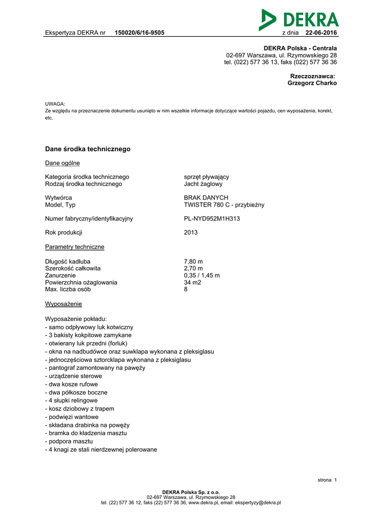 Ekspertyza DEKRA nr 150020/6/16-9505 z dnia 22-06-2016 DEKRA Polska - Centrala 02-697 Warszawa, ul. Rzymowskiego 28 tel. (022) 577 36 13, faks (022) 577 36 36 Rzeczoznawca: Grzegorz Charko UWAGA: Ze względu na przeznaczenie dokumentu usunięto w nim wszelkie informacje dotyczące wartości pojazdu, cen wyposażenia, korekt, etc. Dane środka technicznego Dane ogólne Kategoria środka technicznego Rodzaj środka technicznego sprzęt pływający Jacht żaglowy Wytwórca Model, Typ BRAK DANYCH TWISTER 780 C - przybieżny Numer fabryczny/identyfikacyjny PL-NYD952M1H313 Rok produkcji 2013 Parametry techniczne Długość kadłuba Szerokość całkowita Zanurzenie Powierzchnia ożaglowania Max. liczba osób 7,80 m 2,70 m 0,35 / 1,45 m 34 m2 8 Wyposażenie Wyposażenie pokładu: - samo odpływowy luk kotwiczny - 3 bakisty kokpitowe zamykane - otwierany luk przedni (forluk) - okna na nadbudówce oraz suwklapa wykonana z pleksiglasu - jednoczęściowa sztorcklapa wykonana z pleksiglasu - pantograf zamontowany na pawęży - urządzenie sterowe - dwa kosze rufowe - dwa półkosze boczne - 4 słupki relingowe - kosz dziobowy z trapem - podwięzi wantowe - składana drabinka na powęży - bramka do kładzenia masztu - podpora masztu - 4 knagi ze stali nierdzewnej polerowane strona 1 DEKRA Polska Sp. z o.o. 02-697 Warszawa, ul. Rzymowskiego 28 tel. (22) 577 36 12, faks (22) 577 36 36, www.dekra.pl, email: [email protected] Ekspertyza DEKRA nr 150020/6/16-9505 z dnia 22-06-2016 Osprzęt pokładu: - 2 kabestany ze stolikami i szczękami zaciskowymi - 2 szyny szotów foka z wózkami szotowymi - 2 potrójne bloki zwrotne - 2 stopery fałowe Takielunek stały, ruchomy i ożaglowanie: - maszt i bom aluminiowy anodowany firmy TRIMET - komplet olinowania stałego - sztywny sztag z rolerem foka TRIMET - 3 bloki fałowe - talia grota - miecz - talia achtersztagu - komplet olinowania ruchomego Ożaglowanie: - grot pełnolistwowy na pełzaczach z systemem lazy Jack materiał Sumbrella - fok z listwą ochronną UV Wyposażenie oraz opis wnętrza: - zabudowa ze sklejki szkutniczej - sześć koi stałych z możliwością rozłożenia do ośmiu - komplet materacy - kabina sanitarna MODUŁOWA wykonana z laminatu z umywalką i kranem - stół wewnętrzny mocowany do skrzyni mieczowej - kambuz ze zlewem - podsufitka wykonana z laminatu - 6 szafek części mesy - 1 szafka z półkami w części dziobowej - półka w części rufowej - szafka podwójna nad kambuzem Rok produkcji zgodnie z okazaną fakturą zakupu nowego jachtu - 2013. Opis działania, przeznaczenie środka technicznego Jacht żaglowy przybrzeżny dedykowany do pływania po jeziorach. strona 2 DEKRA Polska Sp. z o.o. 02-697 Warszawa, ul. Rzymowskiego 28 tel. (22) 577 36 12, faks (22) 577 36 36, www.dekra.pl, email: [email protected] Ekspertyza DEKRA nr 150020/6/16-9505 z dnia 22-06-2016 Stan techniczny obiektu Jacht wyjęty ze zbiornika wodnego i zdeponowany na magazynie depozytowym. Oględziny stanu jachtów, kompletności wyposażenia, braków dokonała firma zajmująca się budową i doposażeniem jachtów. Na podstawie ich protokołów stwierdzono: okna na nadbudówce oraz suwklapa wykonana z pleksiglasu - suwklapa z laminatu; jednoczęsciowa sztorcklapa wykonana z pleksiglasu - stwierdzono klapę dwuczęściową; urządzenie sterowe - brak płetwy; dwa półkosze boczne - brak; podpora masztu odpięta - jest w kokpicie maszt i bom aluminiowy anodowany firmy TRIMET - brak bomu; komplet olinowania stałego - do sprawdzenia przy stawianiu masztu czy jest większość elementów; talia grota - brak; miecz - brak miecza; talia achtersztagu - brak bloczka; komplet olinowania ruchomego - cześć do sprawdzenia grot pełnolistwowy na pełzaczach z systemem lazy Jack materiał Sumbrella - brak; fok z listwą ochronną UV - brak komplet materacy - brak pokrowców, sama gąbka; kabina sanitarna MODUŁOWA wykonana z laminatu z umywalką i kranem - brak, 6 szafek części mesy - brak frontów; szafka podwójna nad kambuzem - brak frontu; instalacja wody pitnej czystej, ze zbiornikiem wyjmowanym i stałym 40 litrów - brak stałego zbiornika; lampy oświetlenia pokładu w systemie led - brak, 7 punktów świetlnych - jest 6 punktów, brak jednego; butla gazowa w części dziobowej w bakista dziobowa z wietrzeniem - brak butli; bakista w części rufowej; instalacja elektryczna 12V/230V - konieczne sprawdzenie ciągłości instalacji, instalacja niekompletna. Może zajść potrzeba wymiany całej instalacji (zamiast naprawiać i kleić istniejącą). Podstawa metodologiczna wyceny Aby spełnić zadanie wyceny określone potrzebą zleceniodawcy oszacowana zostanie wartość rynkowa środka technicznego, zdefiniowana w następujący sposób. Wartość rynkowa - jest to racjonalnie określona ilość pieniędzy, którą kupujący będzie skłonny zaoferować chętnemu sprzedającemu w zamian za przedmiot transakcji, przy założeniu równości stron, bez istnienia żadnego przymusu wpływającego na decyzję o zakupie i sprzedaży, przy pełnej znajomości przedmiotu i okoliczności transakcji oraz przy zachowaniu odpowiednio długiego czasu wyeksponowania przedmiotu sprzedaży na wolnym rynku. Powyższa wartość uwzględnia m.in. wytwórcę, rodzaj i zastosowanie maszyny, jej konstrukcję, kompletność, stan techniczny, wiek środka technicznego, okres i sposób eksploatacji, pozostały do dyspozycji przewidywany okres i sposób eksploatacji. Podstawą działań w wyżej wymienionym celu jest: - szczegółowa identyfikacja przedmiotu wyceny, - ustalenia dotyczące kompletności i sprawności technicznej, - ustalenia dotyczące eksploatacji (warunki, czas), - ustalenia dotyczące rynku pierwotnego strona 3 DEKRA Polska Sp. z o.o. 02-697 Warszawa, ul. Rzymowskiego 28 tel. (22) 577 36 12, faks (22) 577 36 36, www.dekra.pl, email: [email protected] Ekspertyza DEKRA nr 150020/6/16-9505 z dnia 22-06-2016 Uwagi Pochodzenie środka technicznego środek techniczny zakupiony