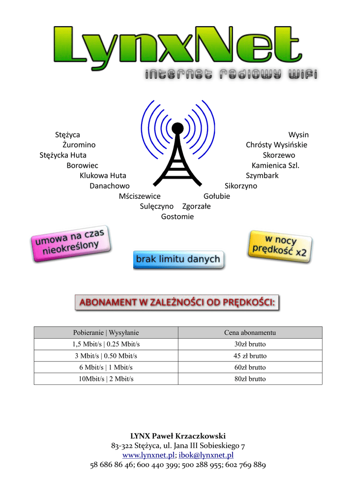Stężyca Wysin Żuromino Chrósty Wysińskie Stężycka Huta Skorzewo Borowiec Kamienica Szl. Klukowa Huta Szymbark Danachowo Sikorzyno Mściszewice Gołubie Sulęczyno Zgorzałe Gostomie Pobieranie | Wysyłanie Cena abonamentu 1,5 Mbit/s | 0.25 Mbit/s 30zł brutto 3 Mbit/s | 0.50 Mbit/s 45 zł brutto 6 Mbit/s | 1 Mbit/s 60zł brutto 10Mbit/s | 2 Mbit/s 80zł brutto LYNX Paweł Krzaczkowski 83-322 Stężyca, ul. Jana III Sobieskiego 7 www.lynxnet.pl; [email protected] 58 686 86 46; 600 440 399; 500 288 955; 602 769 889 Orientacyjne koszty montażu urządzeń odbiorczych u klienta: 1. Zestaw instalacyjne podstawowy: 300 zł z VAT 2. Zestaw instalacyjny zaawansowany: 400 zł z VAT (przy bardzo dużych odległościach od nadajnika lub słabym sygnale) 3. Bezprzewodowy router typu 802.11 b/g/n dla domowej sieci WiFi – 80 zł z VAT Dlaczego warto skorzystać z naszych usług: bezpłatny pomiar sygnału - sprawdzenie warunków technicznych umowa pisemna na czas nieokreślony /okres wypowiedzenia-30dni/ internet dostępny 24h/dobę brak limitu danych w porze nocnej 0:00 – 7:00 prędkość Internetu jest podwojona możliwość podłączenia dowolnej ilości urządzeń poprzez zakupiony u nas router (notebook, tel. komórkowy, smartfon, tablet, drukarka itp.) Koszt instalacji obejmuje: antena, uchwyt, kabel, skonfigurowane urządzenie odbiorcze montaż anteno-routera na uchwycie z przeprowadzeniem kabla kategorii 5e do miejsca instalacji routera wi-fi bądź komputera instalacja programu antywirusowego na komputerze klienta
