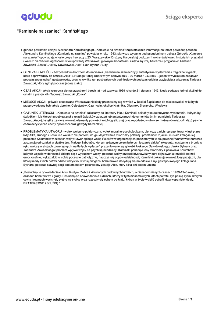 Ściąga eksperta "Kamienie na szaniec" Kamińskiego geneza powstania książki Aleksandra Kamińskiego pt. „Kamienie na szaniec”; najistotniejsze informacje na temat powieści; powieść Aleksandra Kamińskiego „Kamienie na szaniec” powstała w roku 1943; pierwsze wydanie pod pseudonimem Juliusz Górecki; „Kamienie na szaniec” opowiadają o losie grupy harcerzy z 23. Warszawskiej Drużyny Harcerskiej podczas II wojny światowej; historia ich przyjaźni i walki z niemieckim agresorem w okupowanej Warszawie; głównymi bohaterami książki są trzej harcerze i przyjaciele: Tadeusz Zawadzki „Zośka”, Aleksy Dawidowski „Alek” i Jan Bytnar „Rudy” GENEZA POWIEŚCI - bezpośrednim bodźcem do napisania „Kamieni na szaniec" były autentyczne wydarzenia i tragiczne wypadki, które doprowadziły do śmierci „Alka” i „Rudego”; obaj zmarli w tym samym dniu - 30 marca 1943 roku – jeden w wyniku ran zadanych podczas przesłuchań gestapowców, drugi w wyniku ran postrzałowych podniesionych podczas odbicia przyjaciela z wiezienia; Tadeusz Zawadzki, który zginął podczas jednej z akcji CZAS AKCJI - akcja rozgrywa się na przestrzeni trzech lat - od czerwca 1939 roku do 21 sierpnia 1943, kiedy podczas jednej akcji ginie ostatni z przyjaciół - Tadeusz Zawadzki „Zośka” MIEJSCE AKCJI - głównie okupowana Warszawa; niekiedy przenosimy się również w Beskid Śląski oraz do miejscowości, w których przeprowadzone były akcje zbrojne: Celestynów, Czarnocin, okolice Kraśnika, Olesinek, Sieczychy, Włodawa GATUNEK LITERACKI - „Kamienie na szaniec" zaliczamy do literatury faktu; Kamiński opisał tylko autentyczne wydarzenia, których był świadkiem lub których przebieg znał z relacji świadków zdarzeń lub autentycznych dokumentów (m.in. pamiętnik Tadeusza Zawadzkiego); książka zawiera również elementy powieści autobiograficznej oraz reportażu; w utworze można również odnaleźć pewne charakterystyczne cechy opowieści oraz gawędy harcerskiej PROBLEMATYKA UTWORU - wątek wojenno-patriotyczny; wątek moralno-psychologiczny; pierwszy z nich reprezentowany jest przez losy Alka, Rudego i Zośki, ich walka z okupantem; drugi - dojrzewanie młodzieży polskiej i problemów, z jakimi musiało zmagać się pokolenie Kolumbów w czasach wojny; utwór opisuje walkę Polaków w organizacjach podziemnych w okupowanej Warszawie; harcerze zaczynają od działań w służbie tzw. Małego Sabotażu, których głównym celem było ośmieszanie działań okupanta; następnie z bronią w ręku walczą w akcjach dywersyjnych; na tle tych wydarzeń prezentowane są sylwetki Aleksego Dawidowskiego, Janka Bytnara oraz Tadeusza Zawadzkiego; problem wpływu wojny na psychikę młodzieży; Kamiński pokazuje losy młodzieży z pokolenia Kolumbów, których wejście w dorosłość zbiegło się z wybuchem wojny; podczas wojny przeszli błyskawiczny kurs dojrzewania; musieli dojrzeć emocjonalnie, wykształcić w sobie poczucie patriotyzmu, nauczyć się odpowiedzialności; Kamiński pokazuje również losy przyjaźni, dla której każdy z nich potrafi oddać wszystko; w imię przyjaźni bohaterowie decydują się na odbicie z rąk gestapo swojego kolegi Jana Bytnara; podczas sławnej akcji pod arsenałem postrzelony zostaje Alek, który kilka dni potem umiera „Posłuchajcie opowiadania o Alku, Rudym, Zośce i kilku innych cudownych ludziach, o niezapomnianych czasach 1939-1943 roku, o czasach bohaterstwa i grozy. Posłuchajcie opowiadania o ludziach, którzy w tych niesamowitych latach potrafili żyć pełnią życia, których czyny i rozmach wycisnęły piętno na stolicy oraz rozeszły się echem po kraju, którzy w życie wcielić potrafili dwa wspaniałe ideały: BRATERSTWO i SŁUŻBĘ.” www.edudu.pl - filmy edukacyjne on-line Powered by TCPDF (www.tcpdf.org) Strona 1/1