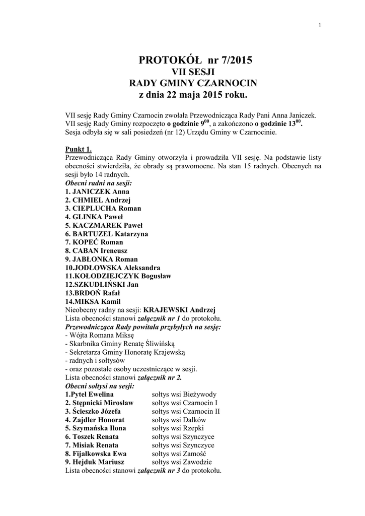 1 PROTOKÓŁ nr 7/2015 VII SESJI RADY GMINY CZARNOCIN z dnia 22 maja 2015 roku. VII sesję Rady Gminy Czarnocin zwołała Przewodnicząca Rady Pani Anna Janiczek. VII sesję Rady Gminy rozpoczęto o godzinie 900, a zakończono o godzinie 1300. Sesja odbyła się w sali posiedzeń (nr 12) Urzędu Gminy w Czarnocinie. Punkt 1. Przewodnicząca Rady Gminy otworzyła i prowadziła VII sesję. Na podstawie listy obecności stwierdziła, że obrady są prawomocne. Na stan 15 radnych. Obecnych na sesji było 14 radnych. Obecni radni na sesji: 1. JANICZEK Anna 2. CHMIEL Andrzej 3. CIEPLUCHA Roman 4. GLINKA Paweł 5. KACZMAREK Paweł 6. BARTUZEL Katarzyna 7. KOPEĆ Roman 8. CABAN Ireneusz 9. JABŁONKA Roman 10.JODŁOWSKA Aleksandra 11.KOŁODZIEJCZYK Bogusław 12.SZKUDLIŃSKI Jan 13.BRDOŃ Rafał 14.MIKSA Kamil Nieobecny radny na sesji: KRAJEWSKI Andrzej Lista obecności stanowi załącznik nr 1 do protokołu. Przewodnicząca Rady powitała przybyłych na sesję: - Wójta Romana Miksę - Skarbnika Gminy Renatę Śliwińską - Sekretarza Gminy Honoratę Krajewską - radnych i sołtysów - oraz pozostałe osoby uczestniczące w sesji. Lista obecności stanowi załącznik nr 2. Obecni sołtysi na sesji: 1.Pytel Ewelina sołtys wsi Bieżywody 2. Stępnicki Mirosław sołtys wsi Czarnocin I 3. Ścieszko Józefa sołtys wsi Czarnocin II 4. Zajdler Honorat sołtys wsi Dalków 5. Szymańska Ilona sołtys wsi Rzepki 6. Toszek Renata sołtys wsi Szynczyce 7. Misiak Renata sołtys wsi Szynczyce 8. Fijałkowska Ewa sołtys wsi Zamość 9. Hejduk Mariusz sołtys wsi Zawodzie Lista obecności stanowi załącznik nr 3 do protokołu. 2 Punkt 2. Przewodnicząca Rady Gminy zwróciła się z pytaniem czy Radni mają uwagi do protokołu z VI sesji odbytej w dniu 16 kwietnia 2015 roku. - Wiceprzewodniczący Rady Gminy Andrzej Chmiel zwrócił się do radnych przed głosowaniem nad przyjęciem protokołu, czy czytali protokół z VI sesji, bo była mowa o odwołaniu mieszkańca na bezczynność wójta gminy i na stronie 14. protokołu jest zapis: „Po przestawieniu treści skargi przez Przewodniczącą Rady Gminy – głos zabrała A. Bełdowska, która udzieliła szczegółowych wyjaśnień odnośnie stawianych zarzutów przez skarżącego w skardze” i czy wszyscy Radni pamiętają o czym mówiła Pani Ania, bo to jest dosyć istotna sprawa, bo tam była wskazana osoba, która jest za tą rzecz odpowiedzialna. Czy można odsłuchać, co było powiedziane. Radni przeszli do biura Rady Gminy i po odtworzeniu nagrania wysłuchano fragment wypowiedzi Anny Bełdowskiej w punkcie 10. Protokołu VI Sesji. Po odsłuchaniu nagrania z VI sesji Przewodnicząca Rady Gminy zwróciła się z pytaniem, czy ma ktoś poprawki i uzupełnienia do protokołu. - Wiceprzewodniczący Rady Andrzej Chmiel – po wysłuchaniu nagrania z VI sesji z wypowiedzi wynika, że nie Pani Ania przyjmowała pismo a osoba będąca na stażu, będzie można to później zweryfikować i wyjaśnić jak to się stało. Zwrócił się także z pytaniem, jak to się dzieje, że w Gminie tak ważne pisma przyjmowane są przez osobę będącą na stażu. Pani Ania powiedziała, że pisma zawsze przekazywane są do wójta lub sekretarza i czemu to się tak nie stało? Przewodnicząca zwróciła się z pytaniem czy ktoś z radnych ma jeszcze jakieś uwagi. Uwag nie było. Przewodnicząca Rady Gminy Anna Janiczek poddała przyjęcie protokołu z VI sesji pod głosowanie. Na stan 15 radnych. Obecnych było 14 radnych. W głosowaniu brało udział 14 radnych. Za przyjęciem protokołu głosowało 9 radnych. Głosów przeciwnych był 1. Głosów wstrzymujących się były 4. Protokół z VI sesji Rady Gminy Czarnocin z dnia 16 kwietnia 2015 roku został przyjęty. Punkt 3. Przewodnicząca Rady Gminy zapytała czy radni mają propozycje zmian do porządku obrad i przedstawiła wniosek o wprowadzenie projektu uchwały „w sprawie wyrażenia zgody na wydzierżawienie części nieruchomości stanowiącej mienie komunalne Gminy Czarnocin na okres dłuższy niż 3 lata”, jako punkt 5.9 porządku obrad. - Wiceprzewodniczący Rady Andrzej Chmiel zaproponował aby przesunąć punkt 6. „Interpelacje, zapytania i wolne wnioski” jako punkt 5. porządku obrad. Przewodnicząca Rady Gminy zwróciła się z pytaniem do radnych: Kto jest za wprowadzeniem do porządku obrad punktu, jako 6.9 o treści: „Podjęcie uchwały w sprawie wyrażenia zgody na wydzierżawienie części nieruchomości stanowiącej mienie komunalne Gminy Czarnocin na okres dłuższy niż 3 lata” i poddała wniosek pod głosowanie. Na stan 15 radnych. Obecnych było 14 radnych. W głosowaniu brało udział 14 radnych. 3 Za przyjęciem wniosku głosowało 14 radny. Przeciwko głosowało 0 radnych. Wstrzymujących się od głosu było 0 radnych. Wniosek został przyjęty. Przewodnicząca Rady Gminy zwróciła się z pytaniem do radnych: Kto jest za zmianą w porządku obrad i przesunięcie punktu 6. „Interpelacje, zapytania i wolne wnioski” jako punktu 5. porządku obrad i poddała wniosek pod głosowanie. Na stan 15 radnych. Obecnych było 14 radnych. W głosowaniu brało udział 14 radnych. Za przyjęciem wniosku głosowało 12 radny. Przeciwko głosowało 0 radnych. Wstrzymujących się od głosu było 2 radnych. Wniosek został przyjęty. Przewodnicząca Rady Gminy poddała proponowany porządek obrad po zmianach pod głosowanie. Na stan 15 radnych. Obecnych było 14 radnych. W głosowaniu brało udział 14 radnych. Za przyjęciem porządku obrad głosowało 14 radnych. Głosów przeciwnych nie było. Głosów wstrzymujących się nie było. Porządek obrad po zmianach, przedstawiał się następująco: 1. Otwarcie sesji i stwierdzenie kworum. 2. Przyjęcie protokołu z poprzedniej sesji. 3. Przyjęcie porządku obrad. 4. Informacja Wójta z działalności między sesjami. 5. Interpelacje, zapytania i wolne wnioski. 6. Podjęcie uchwał: 6.1. w sprawie zmian Wieloletniej Prognozy Finansowej na lat
