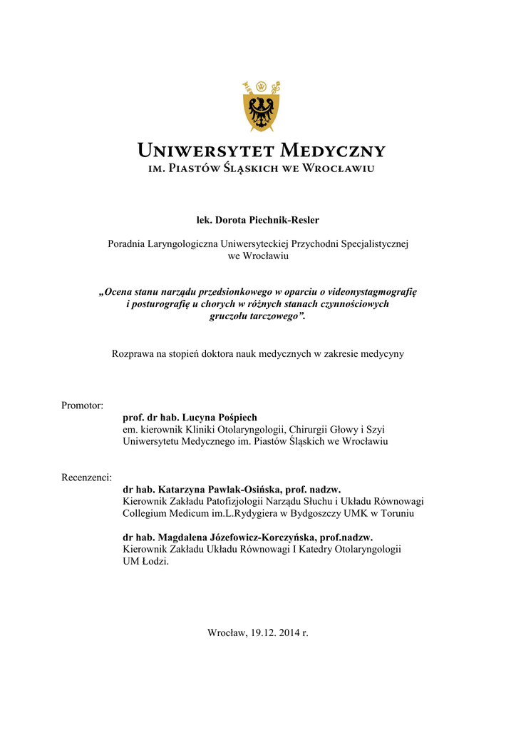 lek. Dorota Piechnik-Resler Poradnia Laryngologiczna Uniwersyteckiej Przychodni Specjalistycznej we Wrocławiu „Ocena stanu narządu przedsionkowego w oparciu o videonystagmografię i posturografię u chorych w różnych stanach czynnościowych gruczołu tarczowego”. Rozprawa na stopień doktora nauk medycznych w zakresie medycyny Promotor: prof. dr hab. Lucyna Pośpiech em. kierownik Kliniki Otolaryngologii, Chirurgii Głowy i Szyi Uniwersytetu Medycznego im. Piastów Śląskich we Wrocławiu Recenzenci: dr hab. Katarzyna Pawlak-Osińska, prof. nadzw. Kierownik Zakładu Patofizjologii Narządu Słuchu i Układu Równowagi Collegium Medicum im.L.Rydygiera w Bydgoszczy UMK w Toruniu dr hab. Magdalena Józefowicz-Korczyńska, prof.nadzw. Kierownik Zakładu Układu Równowagi I Katedry Otolaryngologii UM Łodzi. Wrocław, 19.12. 2014 r. ŻYCIORYS Data urodzenia: 1960-10-31 Miejsce urodzenia: Wrocław Wykształcenie 1980 – 1986 Studia na Wydziale Lekarskim 1990 Pierwszy stopień specjalizacji w zakresie otolaryngologii 1994 Drugi stopień specjalizacji w zakresie otolaryngologii Doświadczenie zawodowe 1986-1988 Staż podyplomowy w Wojewódzkim Szpitalu Zespolonym im. J. Babińskiego we Wrocławiu 1988-2004 Zatrudniona w charakterze starszego asystenta na Oddziale Laryngologicznym Wojewódzkiego Szpitala Zespolonego im. J. Babińskiego we Wrocławiu 2001-2004 Konsultant laryngologiczny w Dolnośląskim Centrum Chorób Płuc we Wrocławiu Od 2004 Zatrudniona w Poradni Laryngologicznej Uniwersyteckiej Przychodni Specjalistycznej we Wrocławiu w charakterze starszego asystenta Członek Polskiego Towarzystwa Otolaryngologicznego Dorobek naukowy współautor 2 publikacji wydanych w Otolaryngologii Polskiej i Wiadomościach Lekarskich autor i współautor 10 referatów wygłoszonych na Zjazdach PTOL i Sympozjum Polsko – Czeskim Inne 2012 r. Srebrny Medal za długoletnią służbę nadany przez Prezydenta Rzeczypospolitej Polskiej Bronisława Komorowskiego Streszczenie Merytoryczne uzasadnienie podjęcia badań: Choroby tarczycy należą do schorzeń ogólnoustrojowych. Towarzyszą im objawy ze strony wielu narządów. Wiadomo, że hormony tarczycy zarówno ich niedobór jak i nadmiar wywołują zmiany biochemiczne i morfologiczne w uchu wewnętrznym i ośrodkowym układzie nerwowym. W literaturze istnieją doniesienia dotyczące związku pomiędzy schorzeniem gruczołu tarczowego oraz zaburzeniami w obrębie narządu słuchu. Znikoma jak dotąd jest ilość prac wskazujących na wpływ nad- lub niedoczynności tarczycy na narząd przedsionkowy, jak również brak jest doniesień dotyczących oceny jego funkcjonalnego stanu w fazie wyrównania i niewyrównania czynności gruczołu tarczowego. Cel pracy: Obiektywizacja czynności narządu przedsionkowego w różnych stanach czynnościowych gruczołu tarczowego w oparciu o badania videonystagmograficzne i posturograficzne. Próba odpowiedzi na pytania: 1. Czy w różnych stanach czynnościowych chorób tarczycy występują zaburzenia w zakresie odruchów wzrokowo-okoruchowych, przedsionkowo-okoruchowych i przedsionkowo-rdzeniowych i czy różnią się od parametrów tych odruchów w grupie osób zdrowych? 2. Czy nieprawidłowości w narządzie przedsionkowym korespondują ze stanem wyrównania hormonalnego w chorobach gruczołu tarczowego? 3. Czy są testy diagnostyczne wchodzące w skład badania VNG lub posturografii wykazujące większą niż inne przydatność w diagnostyce zaburzeń narządu przedsionkowego w chorobach tarczycy? Materiał i metody: Badaniami objęto 107 pacjentów z rozpoznaną chorobą tarczycy w wieku od 24 do 78 lat, w tym 99 kobiet i 8 mężczyzn rekrutujących się z Poradni Endokrynologicznej Uniwersyteckiej Przychodni Specjalistycznej i Pracowni Medycyny Nuklearnej Samodzielnego Publicznego Szpitala Klinicznego we Wrocławiu. Grupę kontrolną stanowiło 26 osób w przedziale wiekowym 28–78 lat (13 kobiet i 13 mężczyzn). Pacjentów z chorobą tarczycy podzielono na 7 grup w zależności od stanu funkcjonalnego tarczycy, wyrażonego w wartościach TSH (zgodnie z zakwalifikowaniem w Poradni Endokrynologicznej) oraz od stanu wyrównania hormonalnego (zgodnie z założonym celem pracy): Wydzielone grupy badano według wprowadzonego V-etapowego programu badań, uwzględniając zarówno wyniki badań w całej grupie chorych w porównaniu do grupy kontrolnej, jak również w zależności od stanu funkcjonalnego i stopnia wyrównania hormonalnego, wieku badanych i czasu trwania choroby. Wszystkich pacjentów z chorobą tarczycy i w grupie kontrolnej poddano szczegółowemu badaniu otoneurologicznemu. Stan narządu przedsionkowego oceniono przy zastosowaniu videonystagmografii i posturografii statycznej. Badanie odruchów przedsionkowo-okoruchowych i wzrokowo-okoruchowych przeprowadzono przy użyciu dwukanałowego elektronystagmografu firmy Hortmann z analizatorem VNG. Badania obejmowały rejestrację oczopląsu samoistnego, optokinetycznego, sinusoidalne i skokowe śledzenie celu, próby położeniowe, próbę kaloryczną. Odruchy przedsionkowo-rdzeniowe oceniano wykonując test statokinezjometryczny. Do badania wykorzystano posturograf PE62 Model 04. Wyniki W grupie badanej 107 osób z chorobą tarczycy 56% pacjentów zgłaszało zawroty głowy i/lub zaburzenia równowagi, w tym o typie układowym7 % chorych i 93% o charakterze nieukładowym. 42% osób stanowili chorzy z niedoczynnością tarczycy, 35% z nadczynnością tarczycy i 23% z wolem obojętnym. Analizując wyniki badań I-go etapu stwierdzono występowanie oczopląsu samoistnego przy oczach otwartych u 14% pacjentów w całej grupie chorych i u 2,8% chorych po wyłączeniu fiksacji. W zakresie odruchów wzrokowo-okoruchowych po przeprowadzeniu oceny jakościowej testów śledzenia i sakadowych oraz ilościowej testu optokinetycznego wykazano znamiennie większe nieprawidłowości w grupie chorych w porównaniu z grupą kontrolną. Rozpatrując zależność 