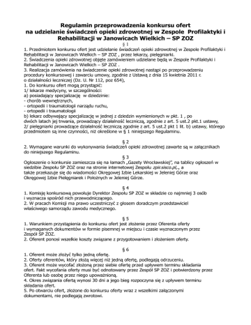 Regulamin przeprowadzenia konkursu ofert na udzielanie świadczeń opieki zdrowotnej w Zespole Profilaktyki i Rehabilitacji w Janowicach Wielkich – SP ZOZ §1 1. Przedmiotem konkursu ofert jest udzielanie świadczeń opieki zdrowotnej w Zespole Profilaktyki i Rehabilitacji w Janowicach Wielkich – SP ZOZ , przez lekarzy, pielęgniarki. 2. Świadczenia opieki zdrowotnej objęte zamówieniem udzielane będą w Zespole Profilaktyki i Rehabilitacji w Janowicach Wielkich – SP ZOZ . 3. Realizacja zamówienia na świadczenie opieki zdrowotnej nastąpi po przeprowadzeniu procedury konkursowej i zawarciu umowy, zgodnie z Ustawą z dnia 15 kwietnia 2011 r. o działalności leczniczej (Dz. U. Nr 112, poz 654), 1. Do konkursu ofert mogą przystąpić: 1/ lekarze medycyny, w szczególności: a) posiadający specjalizację w dziedzinie: - chorób wewnętrznych, - ortopedii i traumatologii narządu ruchu, - ortopedii i traumatologii b) lekarz odbywający specjalizację w jednej z dziedzin wymienionych w pkt. 1 , po dwóch latach jej trwania, prowadzący działalność leczniczą, zgodnie z art. 5 ust.2 pkt.1 ustawy, 2/ pielęgniarki prowadzące działalność leczniczą zgodnie z art. 5 ust.2 pkt 1 lit. b) ustawy, którego przedmiotem są inne czynności, niż określone w § 1 niniejszego Regulaminu. §2 2. Wymagane warunki do wykonywania świadczeń opieki zdrowotnej zawarte są w załącznikach do niniejszego Regulaminu. §3 Ogłoszenie o konkursie zamieszcza się na łamach „Gazety Wrocławskiej”, na tablicy ogłoszeń w siedzibie Zespołu SP ZOZ oraz na stronie internetowej Zespołu zpir.sisco.pl,., a także przekazuje się do wiadomości Okręgowej Izbie Lekarskiej w Jeleniej Górze oraz Okręgowej Izbie Pielęgniarek i Położnych w Jeleniej Górze. §4 1. Komisję konkursową powołuje Dyrektor Zespołu SP ZOZ w składzie co najmniej 3 osób i wyznacza spośród nich przewodniczącego. 2. W pracach Komisji ma prawo uczestniczyć z głosem doradczym przedstawiciel właściwego samorządu zawodu medycznego. §5 1. Warunkiem przystąpienia do konkursu ofert jest złożenie przez Oferenta oferty i wymaganych dokumentów w formie pisemnej w miejscu i czasie wyznaczonym przez Zespół SP ZOZ. 2. Oferent ponosi wszelkie koszty związane z przygotowaniem i złożeniem oferty. §6 1. Oferent może złożyć tylko jedną ofertę. 2. Oferty oferentów, który złożą więcej niż jedną ofertę, podlegają odrzuceniu. 3. Oferent może wycofać złożoną przez siebie ofertę przed upływem terminu składania ofert. Fakt wycofania oferty musi być odnotowany przez Zespół SP ZOZ i potwierdzony przez Oferenta lub osobę przez niego upoważnioną. 4. Okres związania ofertą wynosi 30 dni a jego bieg rozpoczyna się z upływem terminu składania ofert. 5. Po otwarciu ofert, złożone do konkursu oferty wraz z wszelkimi załączonymi dokumentami, nie podlegają zwrotowi. §7 1. Oferta powinna być sporządzona na drukach udostępnionych przez Zespół SP ZOZ. 2. Oferta winna być podpisana przez Oferenta. 3. Wszelkie miejsca, w których oferent naniósł zmiany, winny być parafowane przez Oferenta. 4. Zwalnia się oferenta z obowiązku składania dokumentów, wymienionych w ofercie pod warunkiem, że oferent w ostatnim roku przed ogłoszeniem konkursu wykonywał świadczenia opieki zdrowotnej w Zespole SP ZOZ. Warunek ten zostanie spełniony, jeżeli nie nastąpiły okoliczności wpływające na zmianę treści dokumentów, złożonych uprzednio. §8 Oferta winna zawierać : 1/ dane o oferencie: a) imię i nazwisko, b) adres zamieszkania i do korespondencji, jeżeli jest inny, c) numer telefonu, d) adres poczty- e-mail. 2/ kopię zaświadczenia o wpisie do właściwego rejestru (rejestr podmiotów wykonujących działalność leczniczą; rejestr działalności gospodarczej), 3/ kopię dyplomu ukończenia studiów wyższych i innych szkół (średnie, policealne, studia licencjackie i inne), 4/ kopię prawa wykonywania zawodu (dotyczy lekarzy i pielęgniarek), 5/ kopię dyplomu lub zaświadczeń o posiadanych specjalizacjach (dotyczy lekarzy i pielęgniarek), 6/ oferowany rodzaj udzielanych świadczeń, 7/ oferowaną stawkę za jedną godzinę udzielanego świadczenia zdrowotnego nie wyższą, niż określona w warunkach wymaganych od świadczeniodawców, 8/ polisę ubezpieczeniową OC na okres udzielania świadczeń opieki zdrowotnej na kwotę: a) lekarze 100.000 euro, b) pielęgniarki 25 000 euro, 9/ zaświadczenie o nadaniu nr REGON. §9 1. Oferta może zawierać inne elementy niż wskazane w § 8 niniejszego Regulaminu, w szczególności zaoferowanie wykonywania obowiązków konsultanta medycznego (dotyczy lekarzy). 2. Oferent składa oświadczenie o zapoznaniu się: 1/ z treścią ogłoszenia, 2/ z Regulaminem przeprowadzania konkursu ofert, 3/ ze wzorem umowy. § 10 Informacje, o których mowa w § 8 pkt 1 lit. a), b) c) i d), pkt 6 i pkt 7 niniejszego Regulaminu oraz oświadczenie, o którym mowa w § 9 ust. 2, oferent składa na formularzu ofertowym, udostępnionym przez Zespół SP ZOZ. § 11 1. Członek komisji konkursowej oraz przedstawiciel Izby Lekarskiej i Izby Pielęgniarek i Położnych podlega wyłączeniu od udziału w komisji, gdy oferentem jest: 1) jego małżonek oraz krewny i powinowaty do drugiego stopnia, 2) osoba związana z nim z tytułu przysposobienia, opieki lub kurateli. 2. Członek komisji konkursowej oraz przedstawiciele Izby Lekarskiej oraz Izby Pielęgniarek i Położnych składają oświadczenie do niniejszego Regulaminu. 3. Dyrektor Zespołu SP ZOZ w sytuacji, o której mowa w ust. 1, dokonuje wyłączenia i powołuje nowego członka komisji konkursowej lub występuje do Izby Lekarskiej (Izby Pielęgniarek i Położnych) o zmianę przedstawiciela. § 12 1. Komisja konkursowa, przystępując do rozstrzygnięcia konkursu ofert, dokonuje kolejno następujących czynności: 1) stwierdza prawidłowość ogłoszenia konkursu oraz liczbę otrzymanych ofert, 2) otwiera k