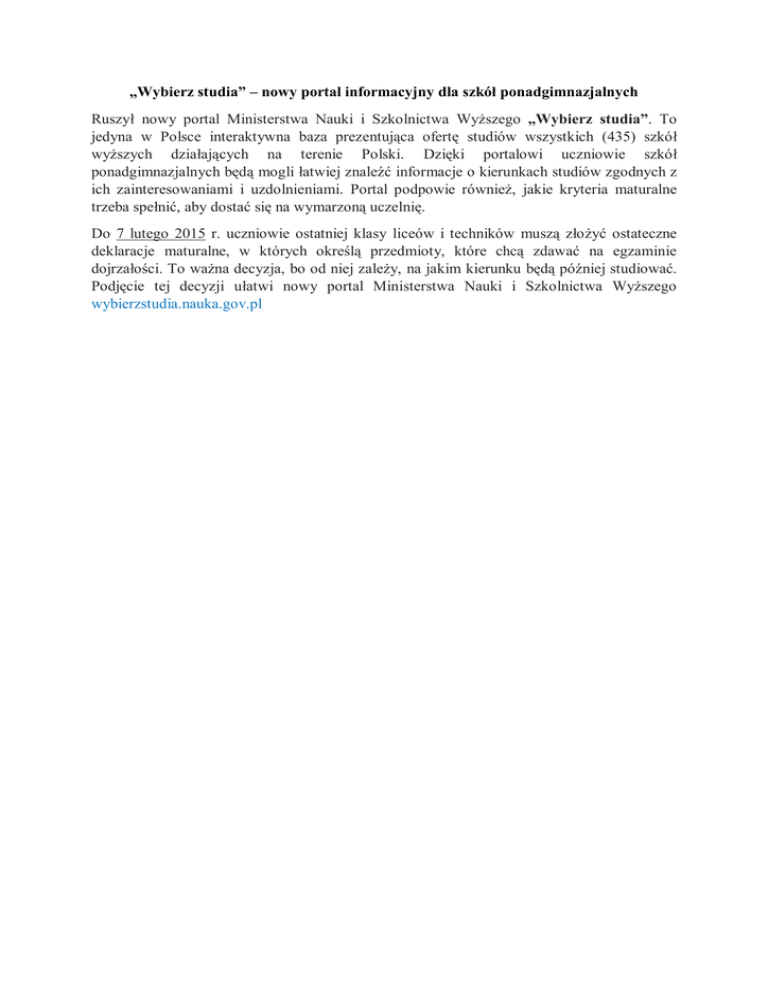 „Wybierz studia” – nowy portal informacyjny dla szkół ponadgimnazjalnych Ruszył nowy portal Ministerstwa Nauki i Szkolnictwa Wyższego „Wybierz studia”. To jedyna w Polsce interaktywna baza prezentująca ofertę studiów wszystkich (435) szkół wyższych działających na terenie Polski. Dzięki portalowi uczniowie szkół ponadgimnazjalnych będą mogli łatwiej znaleźć informacje o kierunkach studiów zgodnych z ich zainteresowaniami i uzdolnieniami. Portal podpowie również, jakie kryteria maturalne trzeba spełnić, aby dostać się na wymarzoną uczelnię. Do 7 lutego 2015 r. uczniowie ostatniej klasy liceów i techników muszą złożyć ostateczne deklaracje maturalne, w których określą przedmioty, które chcą zdawać na egzaminie dojrzałości. To ważna decyzja, bo od niej zależy, na jakim kierunku będą później studiować. Podjęcie tej decyzji ułatwi nowy portal Ministerstwa Nauki i Szkolnictwa Wyższego wybierzstudia.nauka.gov.pl