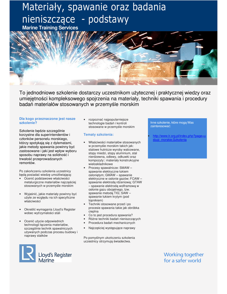 Materiały, spawanie oraz badania nieniszczące - podstawy Marine Training Services To jednodniowe szkolenie dostarczy uczestnikom użytecznej i praktycznej wiedzy oraz umiejętności kompleksowego spojrzenia na materiały, techniki spawania i procedury badań materiałów stosowanych w przemyśle morskim Dla kogo przeznaczone jest nasze szkolenie? Szkolenie będzie szczególnie korzystne dla superintendentów i członków personelu morskiego, którzy spotykają się z dylematami, jakie metody spawania powinny być zastosowane i jaki jest wpływ wyboru sposobu naprawy na solidność i trwałość przeprowadzanych remontów. Po zakończeniu szkolenia uczestnicy będą posiadać wiedzę umożliwiającą: • Ocenić podstawowe właściwości metalurgiczne materiałów najczęściej stosowanych w przemyśle morskim • Wyjaśnić, jakie materiały powinny być użyte ze względu na ich specyficzne właściwości • Określić wymagania Lloyd’s Register wobec wytrzymałości stali • Tematy szkolenia: • • • Właściwości materiałów stosowanych w przemyśle morskim takich jak: stalowe hutnicze wyroby walcowane, stopy miedzi, stopy aluminium, stal nierdzewna, odlewy, odkuwki oraz kompozyty:: materiały konstrukcyjne wieloskładnikowe Procesy spawalnicze: SMAW – spawanie elektryczne łukiem osłoniętym; GMAW – spawanie elektryczne w osłonie gazów; FCAW – spawanie elektrodą rdzeniową; GTAW – spawanie elektrodą wolframową w osłonie gazu obojętnego, tzw. spawanie metodą TIG; SAW – spawanie łukiem krytym (pod topnikiem) Techniki stosowane przed i po procesie spawania takie jak obróbka cieplna Co to jest procedura spawania? Różne techniki badań nieniszczących Procedura badań mechanicznych • Najczęściej występujące naprawy • • • • Ocenić użycie odpowiednich technologii łączenia materiałów, szczególnie technik spawalniczych używanych podczas procesu budowy i naprawy statków rozpoznać najpopularniejsze technologie badań i kontroli stosowane w przemyśle morskim Inne szkolenie, które mogą Was zainteresować: • http://www.lr.org.pl/index.php?page=u slugi_morskie;Szkolenia Po pomyślnym ukończeniu szkolenia uczestnicy otrzymują świadectwa. Working together for a safer world This course has been granted official IMarEST CPD recognition. To find out more about how we can help you please visit us at: www.lr.org/training or contact us at [email protected] www.lr.org December 2013 Lloyd’s Register and variants of it are trading names of Lloyd’s Register Group Limited, its subsidiaries and affiliates. Copyright © Lloyd’s Register EMEA 2013. A member of the Lloyd’s Register group.