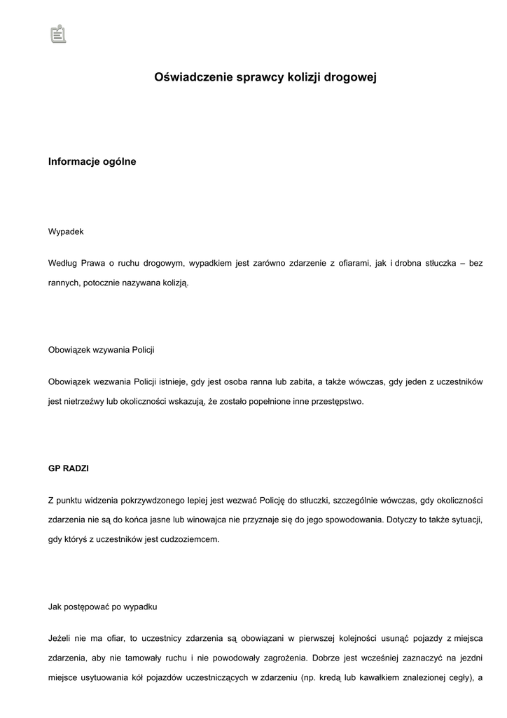 Oświadczenie sprawcy kolizji drogowej Informacje ogólne Wypadek Według Prawa o ruchu drogowym, wypadkiem jest zarówno zdarzenie z ofiarami, jak i drobna stłuczka – bez rannych, potocznie nazywana kolizją. Obowiązek wzywania Policji Obowiązek wezwania Policji istnieje, gdy jest osoba ranna lub zabita, a także wówczas, gdy jeden z uczestników jest nietrzeźwy lub okoliczności wskazują, że zostało popełnione inne przestępstwo. GP RADZI Z punktu widzenia pokrzywdzonego lepiej jest wezwać Policję do stłuczki, szczególnie wówczas, gdy okoliczności zdarzenia nie są do końca jasne lub winowajca nie przyznaje się do jego spowodowania. Dotyczy to także sytuacji, gdy któryś z uczestników jest cudzoziemcem. Jak postępować po wypadku Jeżeli nie ma ofiar, to uczestnicy zdarzenia są obowiązani w pierwszej kolejności usunąć pojazdy z miejsca zdarzenia, aby nie tamowały ruchu i nie powodowały zagrożenia. Dobrze jest wcześniej zaznaczyć na jezdni miejsce usytuowania kół pojazdów uczestniczących w zdarzeniu (np. kredą lub kawałkiem znalezionej cegły), a jeszcze lepiej byłoby zrobić zdjęcia uwidaczniające położenie pojazdów po zdarzeniu. Dopiero wtedy przystępujemy do spisywania oświadczenia. PUŁAPKI Jeżeli na miejsce wezwano Policję, która zdecydowała, że nałoży na nas mandat, a nie jesteśmy przekonani co do naszej winy, to powinniśmy odmówić jego przyjęcia. Policjanci sporządzą wtedy dokumentację ze zdarzenia i sprawa trafi do rozstrzygnięcia przez sąd. Podobnie w sytuacjach wątpliwych nie powinniśmy się zgadzać na pisanie oświadczenia i wezwać Policję. Kto i kiedy pisze oświadczenie Jeżeli nie ma ofiar, to uczestnicy zdarzenia są obowiązani w pierwszej kolejności usunąć pojazdy z miejsca zdarzenia, aby nie tamowały ruchu i nie powodowały zagrożenia. Dobrze jest wcześniej zaznaczyć na jezdni miejsce usytuowania kół pojazdów uczestniczących w zdarzeniu (np. kredą lub kawałkiem znalezionej cegły), a jeszcze lepiej byłoby zrobić zdjęcia uwidaczniające położenie pojazdów po zdarzeniu. Dopiero wtedy przystępujemy do spisywania oświadczenia. Jeżeli przy stłuczce (bez rannych) okoliczności zdarzenia są jasne i nikt ich nie kwestionuje, to można nie wzywając Policji poprzestać na spisaniu tzw. oświadczenia. Najlepiej będzie, gdy oświadczenie napisze własnoręcznie sprawca. Jeżeli dokument zostanie sporządzony przez inną osobę, należy zadbać, aby podpis sprawcy zdarzenia pod tekstem był czytelny. ZAPAMIĘTAJ Udzielenie przez uczestnika na żądanie innego uczestnika informacji o osobach i pojazdach uczestniczących w zdarzeniu jest obowiązkiem prawnym, a odmowa może skutkować grzywną. Wypadek za granicą Jeżeli do wypadku (kolizji) z udziałem pojazdu zarejestrowanego w jednym z krajów EOG (kraje UE, Islandia, Liechtenstein i Norwegia) dojdzie za granicą, to istnieje możliwość dochodzenia swoich roszczeń w Polsce. W tym celu należy po powrocie do Polski skontaktować się z Polskim Biurem Ubezpieczycieli Komunikacyjnych, które na podstawie danych dotyczących sprawcy szkody (imię i nazwisko, nr rejestracyjny pojazdu) przekaże informację, w jakim zakładzie ubezpieczeń sprawca zdarzenia był ubezpieczony oraz kto jest jego reprezentantem ds. roszczeń działającym w Polsce. GP RADZI Żaden z uczestników nie ma prawnego obowiązku pisania oświadczenia; jest to działanie dobrowolne, znacznie ułatwiające późniejsze dochodzenie odszkodowania, musi jednak,na żądanie uczestnika zdarzenia, podać swoje dane i dane pojazdu. Napisanie oświadczenia nie przesądza o tym, że na tej podstawie ubezpieczyciel wypłaci odszkodowanie. Jest to informacja o zdarzeniu i o tym, że jeden z jego uczestników przyznał się do jego spowodowania. Jak wypełnić formularz oświadczenia Najlepiej napisać oświadczenie w dwóch egzemplarzach. ZAPAMIĘTAJ Precyzyjne wypełnienie oświadczenia ułatwi dochodzenie roszczeń. Krok 1 DANE KIEROWCÓW I WŁAŚCICIELI POJAZDÓW. Wypełniając oświadczenie, należy pamiętać, że w rubrykach powinny się znaleźć obowiązkowo dane osoby kierującej i właściciela każdego pojazdu uczestniczącego w kolizji. Jeżeli właścicielem pojazdu wg dowodu rejestracyjnego jest ktoś inny niż faktyczny właściciel (np. gdy po kupnie pojazd jeszcze nie został przerejestrowany w Wydziale Komunikacji), to należy odnotować dane zarówno z umowy kupna sprzedaży, jak i z dowodu rejestracyjnego. Krok 2 DANE POJAZDÓW. Obowiązkowo należy zamieścić dane pojazdów – numery rejestracyjne, firmy ubezpieczeniowe i numery polis. Krok 3 DATA I MIEJSCE. Bardzo ważne jest precyzyjne określenie w oświadczeniu daty, miejsca oraz czasu zdarzenia. Krok 4 USZKODZENIA. Koniecznie trzeba wpisać, co zostało uszkodzone w pojazdach, np. przedni prawy błotnik, drzwi prawe, przednia prawa lampa. Należy też na sylwetce pojazdu zaznaczyć strzałką kierunek uderzenia, do którego doszło podczas wypadku. Krok 5 OKOLICZNOŚCI. W tej rubryce opisujemy dokładnie, jak doszło do wypadku, np. „Do kolizji doszło w wyniku wjazdu przez sprawcę na skrzyżowanie na czerwonym świetle dla jego kierunku ruchu”. Krok 6 INNE SZKODY. Wymieniamy np., gdy uszkodzeniu uległ ładunek przewożony pojazdem pokrzywdzonego (wyszczególnić należy, jaki i ile) lub zaparkowany inny pojazd (warto również podać jego właściciela). Krok 7 ŚWIADKOWIE ZDARZENIA. Jeżeli byli świadkowie wypadku, wpisujemy ich personalia, adres zamieszkania, kontakt telefoniczny. Dobrze będzie, gdy świadkowie potwierdzą te dane własnoręcznym podpisem. Warto zanotować też numery rejestracyjne pojazdów, których kierujący mogli widzieć przebieg zdarzenia. Krok 8 PODPIS. Poszkodowany i sprawca wypadku powinni własnoręcznie podpisać się pod oświadczeniem. Warto pamiętać, że najlepiej, jeśli będzie to podpis czytelny, bo autentyczność takiego podpisu łatwiej będzie potwie