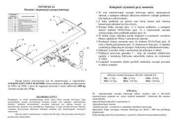 INSTRUKCJA MontaŜu i eksploatacji zaczepu kulowego Oznaczenie zacisku wg ISO PN 1 L 2 + 3 31 4 R 5 58R 6 54 7 58L Kolejność czynności przy montaŜu 8 Łączenie przewodów Kierunkowskazy lewe Tylne światła przeciwmgłowe Masa Kierunkowskazy prawe Światła pozycyjne prawe Światła hamowania Światła pozycyjne lewe 5 5 8 1 5 4 8 13 5 6 3 1. W celu zamontowania zaczepu kulowego naleŜy zdemontować zderzak, a następnie odkręcić fabryczne metalowe zaślepki podłuŜnic (nie będą juŜ wykorzystane). 2. Z boku podłuŜnic po prawej oraz lewej stronie pod warstwą konserwacji odszukać po dwa otwory. 3. Wsunąć belkę zaczepu (poz. 1) w otwory podłuŜnic, a następnie skręcić śrubami M10x35mm (poz. 5) z wyposaŜenia zaczepu wykorzystując duŜe podkładki płaskie (poz. 8). 4. W dolnej części zderzaka wyciąć fragment o wymiarach: szerokość 80mm i głębokość 50mm i zamontować zderzak.. 5. Przykręcić korpus automatu (poz. 6) śrubami M12x25mm (poz. 4) wraz z blachą pod gniazdo (poz. 3). Zamocować kulę (poz. 2) zgodnie z instrukcją dołączaną do zaczepu z końcówką szybkodemontowalną. 6. Dokręcić wszystkie śruby z momentem jak pokazano w tabeli. 7. Podłączyć przewody gniazdka 7 – bieg. do instalacji elektrycznej zgodnie z instrukcją fabryczną samochodu (zaleca się wykonanie w ASO). 8. Uzupełnić ewentualne ubytki powłoki malarskiej zaczepu powstałe w trakcie montaŜu 2 Zaczep kulowy przeznaczony jest do zamontowania w samochodzie: VOLKSWAGEN GOLF III KOMBI, numer katalogowy K16A, produkowanym od 1993r. do 1998r. i słuŜy do ciągnięcia przyczep o masie całkowitej 1500 kg i nacisku na kulę max 75 kg. OD PRODUCENTA Dziękujemy za wybór produkowanego przez naszą firmę zaczepu kulowego. Jego niezawodność została potwierdzona licznymi testami oraz opiniami zadowolonych klientów. JednakŜe niezawodność zaczepów kulowych jest zaleŜna równieŜ od prawidłowego montaŜu oraz prawidłowej eksploatacji. Z tego powodu prosimy Państwa o staranne przeczytanie niniejszej instrukcji montaŜu oraz przestrzeganie zawartych wskazówek. Zaczep naleŜy zamontować w miejscach do tego celu przeznaczonych przez producenta samochodu. Zalecany moment skręcający dla śrub i nakrętek 8,8: M6 - 11 Nm M8 - 25 Nm M10 - 50 Nm M12 - 87 Nm M14 - 138 Nm M16 - 210 Nm UWAGA Po zamontowaniu zaczepu kulowego naleŜy uzyskać wpis w dowodzie rejestracyjnym pojazdu na „stacji kontroli pojazdów” właściwej dla miejsca zamieszkania. Samochód powinien być wyposaŜony w : -kierunkowskazy boczne -lusterka boczne o rozstawie co najmniej szerokości przyczepy Sprawdzać śruby mocujące zaczepu kulowego po około 1 000 km przebiegu eksploatacji. Kula zaczepu musi być utrzymana w czystości i konserwowana smarem stałym PPUH AUTO-HAK Sp.J. WyposaŜenie zaczepu: Produkcja Zaczepów kulowych Henryk & Zbigniew Nejman 76-200 SŁUPSK ul. Słoneczna 16K tel/fax (059) 8-414-414; 8-414-413 E-mail: [email protected] www. autohak.com.pl Zaczep kulowy bez wyposaŜenia elektrycznego K16A Klasa: A50-X Nr kat. Przeznaczony do zamontowania w samochodzie: Producent: VOLKSWAGEN Model: GOLF III Typ: KOMBI produkowanego od 1993 do 1998 Dane techniczne: Wartość siły D : 7,8 kN maksymalna masa przyczepy: 1500 kg maksymalny nacisk na kulę: 75 kg Numer homologacji zgodnie z Dyrektywą 94/20/WE: e20*94/20*1157*00 KARTA GWARANCYJNA Producent udziela gwarancji niniejszą kartą gwarancyjną na okres 24 miesięcy licząc od dnia zakupu zaczepu kulowego do samochodu: VOLKSWAGEN GOLF III KOMBI produkowanego od 1993r. do 1998r. Data produkcji .............................. Data zakupu....................................... Zakres gwarancji obejmuje wyłącznie wady jakościowe wynikające z winy producenta. Gwarancja nie obejmuje natomiast uszkodzeń zawinionych przez nabywcę, wynikających z niewłaściwego montaŜu, uŜytkowania lub konserwacji, uszkodzeń mechanicznych, normalnego zuŜycia podczas eksploatacji itp. Gwarancja udzielona na zakupiony towar nie wyłącza, nie ogranicza ani nie zawiesza uprawnień kupującego wynikających z niezgodności towaru z umową. Reklamacje naleŜy zgłaszać w punkcie sprzedaŜy, składając jednocześnie kartę gwarancyjną. Usunięcie "wady" następuje po stwierdzeniu przez punkt sprzedaŜy wspólnie z producentem słuszności złoŜonej reklamacji. Reklamacja powinna być załatwiona w ciągu 14 dni od dnia uznania reklamacji. Karta gwarancyjna jest niewaŜna jeŜeli nie jest wypełniona i podpisana. Data zgłoszenia reklamacji: ................................................................... INFORMACJA WSTĘPNA Zaczep kulowy jest skonstruowany zgodnie z zasadami bezpieczeństwa ruchu drogowego. Zaczep kulowy jest elementem wpływającym na bezpieczeństwo jazdy i moŜe zostać zainstalowany wyłącznie przez personel wyspecjalizowany. Niedopuszczalne jest dokonywanie jakichkolwiek zmian w konstrukcji zaczepu. Powoduje to wygaśniecie dopuszczenia do stosowania. W przypadku obecności masy izolacyjnej lub osłony podwozia w miejscu przylegania zaczepu, naleŜy ją usunąć. Nieosłonięte miejsca karoserii oraz wywiercone otwory naleŜy pomalować farbą antykorozyjną. Informacjami wiąŜącymi odnośnie wartości obciąŜeń są dane podawane przez producenta samochodu, względnie wartości maksymalnej masy przyczepy oraz maksymalnego nacisku na kulę, przy czym wartości parametrów zaczepu kulowego nie mogą być przekroczone. Wzór do obliczania wartości siły D: Maks. masa przyczepy [kg] x Maks. masa samochodu [kg] Maks. masa przyczepy [kg] + Maks. masa samochodu [kg] X 9,81 = 1000 D [kN]