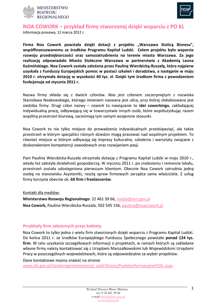NOA COWORK – przykład firmy stworzonej dzięki wsparciu z PO KL Informacja prasowa, 12 marca 2012 r. Firma Noa Cowork powstała dzięki dotacji z projektu „Warszawa Stolicą Biznesu”, współfinansowanemu ze środków Programu Kapitał Ludzki. Celem projektu było wsparcie rozwoju przedsiębiorczości oraz samozatrudnienia na terenie miasta Warszawa. Za jego realizację odpowiadało Miasto Stołeczne Warszawa w partnerstwie z Akademią Leona Koźmińskiego. Noa Cowork została założona przez Paulinę Wierzbicką-Ruszałę, która najpierw uzyskała z Funduszy Europejskich pomoc w postaci szkoleń i doradztwa, a następnie w maju 2010 r. otrzymała dotację w wysokości 40 tys. zł. Dzięki tym środkom firma z powodzeniem funkcjonuje od stycznia 2011 r. Nazwa firmy składa się z dwóch członów. Noa jest członem zaczerpniętym z nazwiska Stanisława Noakowskiego, którego imieniem nazwana jest ulica, przy której zlokalizowana jest siedziba firmy. Drugi człon nazwy – cowork to nawiązanie to idei coworkingu, zakładającej indywidualną pracę, odbywającą się w towarzystwie innych osób, które współużytkując razem wspólną przestrzeń biurową, zacieśniają tym samym wzajemne stosunki. Noa Cowork to nie tylko miejsce do prowadzenia indywidualnych przedsięwzięć, ale także przestrzeń w którym specjaliści różnych dziedzin mogą pracować nad wspólnym projektem. To również miejsce w którym odbywają się imprezy kulturalne, szkolenia i warsztaty związane z doskonaleniem kompetencji zawodowych oraz rozwijaniem pasji. Pani Paulina Wierzbicka-Ruszała otrzymała dotację z Programu Kapitał Ludzki w maju 2010 r., wtedy też założyła działalność gospodarczą. W styczniu 2011 r. po znalezieniu i remoncie lokalu, przestrzeń została udostępniona pierwszym klientom. Obecnie Noa Cowork zatrudnia jedną osobę na stanowisku Asystentki, resztą spraw firmowych zarządza sama właściciela. Z usług firmy korzysta obecnie ok. 60 firm i freelancerów. Kontakt dla mediów: Ministerstwo Rozwoju Regionalnego: 22 461 39 66, [email protected] Noa Cowork, Paulina Wierzbicka-Ruszała, 502 545 156, [email protected] Przykłady firm założonych przez kobiety Noa Cowork to tylko jedna z wielu firm stworzonych dzięki wsparciu z Programu Kapitał Ludzki. Do końca 2011 r. ze środków Europejskiego Funduszu Społecznego powstało ponad 124 tys. firm. W celu uzyskania szczegółowych informacji o projektach, w ramach których są zakładane własne firmy należy kontaktować się z Urzędami Marszałkowskimi lub Wojewódzkimi Urzędami Pracy w poszczególnych województwach, które są odpowiedzialne za wybór projektów. Dane kontaktowe można znaleźć na stronie www.efs.gov.pl/dzialaniapromocyjne/pi_pokl/Strony/PunktyinformacyjnePOKL.aspx Wydział Prasowy Biuro Ministra tel.: 0 22 461 39 66 e-mail: [email protected] www.mrr.gov.pl 1 W ramach projektu „Inicjatywa jest kobietą. ABC przedsiębiorczości dla kobiet”, realizowanego w Lublinie od 2006 r. powstało już prawie dwieście firm, które otrzymały wsparcie z Europejskiego Funduszu Społecznego, m.in.: 1. Firma „Clear House” usługi sprzątania. Działalność prowadzona przez Panią Katarzynę Skowronek. Firma świadczy usługi w zakresie sprzątania, a usługi są wykonywane przy użyciu nowoczesnych technologii i profesjonalnych środków czystości. Pani Katarzyna po tym jak straciła pracę na poczcie została sama z trójką dzieci. Postanowiła nie poddawać się i wziąć sprawy w swoje ręce. Pani Katarzyna dostała 32 tysiące na założenie własnej firmy świadczącej usługi sprzątania. Obecnie w firmie pracuje kilkanaście osób, głównie kobiety a interes idzie bardzo dobrze. Firma „Clear house” sprząta biurowce, zakłady pracy oraz mieszkania. Z jej oferty korzysta już ponad 40 dużych kontrahentów, a Pani Katarzyna wciąż rozwija swoje przedsięwzięcie. Strona internetowa firmy: www.clear-house.pl 2. Firma „ Miasto kobiet” – klub fitness. Działalność prowadzona przez Panią Magdalenę Wójcik. Jest to pierwszy w Lublinie klub fitness stworzony przez kobietę i dla kobiet. Oferta klubu jest bardzo szeroka, są w niej również specjalne zajęcia dla młodych matek. Do klubu mogą przychodzić razem z dzieckiem, bo popołudniami czeka opiekunka zajmująca się dziećmi. Klub działa już kilka lat i nadal się rozwija. Pani Magdalena podkreśla, że wsparcie finansowe z Europejskiego Funduszu Społecznego było nieocenione, ale dla niej równie ważne było to, że zaoferowano jej wsparcie szkoleniowe oraz psychologiczne. Dzięki temu uwierzyła, że da radę założyć i prowadzić własną firmę. Strona internetowa firmy: www.miastokobiet.net 3. Firma „Żegluj. Szkoła żeglarstwa regatowego”. Działalność prowadzona przez Panią Annę Rakowską Szkoła świadczy usługi edukacyjno-szkoleniowe z zakresu nauki żeglarstwa sportowego dla dzieci i młodzieży w wieku 7-12 lat. Miłość do żagli i wody był impulsem dla Pani Anny do założenia własnej szkoły żeglarstwa. Jej szkoła regatowa jest pierwszą, która zagospodarowała akwen w Zemborzycach i pierwszym klubem profesjonalnie szkolącym dzieci i młodzież. Na założenie szkoły otrzymała 38,5 tys. zł dotacji z Europejskiego Funduszu Społecznego, co starczyło na 10 łódek i dodatkowe wyposażenie. Strona internetowa firmy: www.zegluj.lublin.pl Wydział Prasowy Biuro Ministra tel.: 0 22 461 39 66 e-mail: [email protected] www.mrr.gov.pl 2