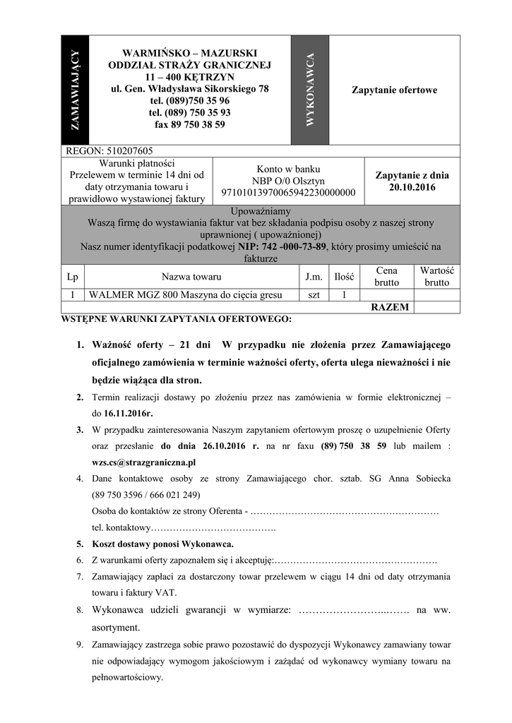 REGON: 510207605 Warunki płatności Przelewem w terminie 14 dni od daty otrzymania towaru i prawidłowo wystawionej faktury WYKONAWCA ZAMAWIAJĄCY WARMIŃSKO – MAZURSKI ODDZIAŁ STRAŻY GRANICZNEJ 11 – 400 KĘTRZYN ul. Gen. Władysława Sikorskiego 78 tel. (089)750 35 96 tel. (089) 750 35 93 fax 89 750 38 59 Zapytanie ofertowe Konto w banku NBP O/0 Olsztyn 97101013970065942230000000 Zapytanie z dnia 20.10.2016 Upoważniamy Waszą firmę do wystawiania faktur vat bez składania podpisu osoby z naszej strony uprawnionej ( upoważnionej) Nasz numer identyfikacji podatkowej NIP: 742 -000-73-89, który prosimy umieścić na fakturze Cena Wartość Lp Nazwa towaru J.m. Ilość brutto brutto 1 WALMER MGZ 800 Maszyna do cięcia gresu szt 1 RAZEM WSTĘPNE WARUNKI ZAPYTANIA OFERTOWEGO: 1. Ważność oferty – 21 dni W przypadku nie złożenia przez Zamawiającego oficjalnego zamówienia w terminie ważności oferty, oferta ulega nieważności i nie będzie wiążąca dla stron. 2. Termin realizacji dostawy po złożeniu przez nas zamówienia w formie elektronicznej – do 16.11.2016r. 3. W przypadku zainteresowania Naszym zapytaniem ofertowym proszę o uzupełnienie Oferty oraz przesłanie do dnia 26.10.2016 r. na nr faxu (89) 750 38 59 lub mailem : [email protected] 4. Dane kontaktowe osoby ze strony Zamawiającego chor. sztab. SG Anna Sobiecka (89 750 3596 / 666 021 249) Osoba do kontaktów ze strony Oferenta - …………………………………………………… tel. kontaktowy…………………………………. 5. Koszt dostawy ponosi Wykonawca. 6. Z warunkami oferty zapoznałem się i akceptuję:……………………………………………. 7. Zamawiający zapłaci za dostarczony towar przelewem w ciągu 14 dni od daty otrzymania towaru i faktury VAT. 8. Wykonawca udzieli gwarancji w wymiarze: ……………………..……. na ww. asortyment. 9. Zamawiający zastrzega sobie prawo pozostawić do dyspozycji Wykonawcy zamawiany towar nie odpowiadający wymogom jakościowym i zażądać od wykonawcy wymiany towaru na pełnowartościowy. 10. Ilość przedmiotów ujęta w kolumnie „ ilość” może ulec zmianie w zależności od wartości całkowitej oferty. 11. Informacje dodatkowe – uzupełniające do Oferty ze strony Oferenta. ………………………………………………………………………………………………… ………………………………………………………………………………………………… ………………………………………………….. Data, podpis i pieczęć oferenta ( Wykonawcy) -
