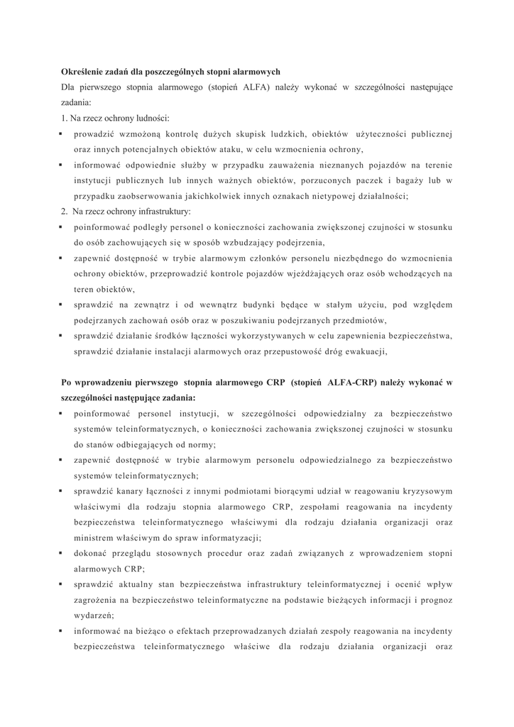 Określenie zadań dla poszczególnych stopni alarmowych Dla pierwszego stopnia alarmowego (stopień ALFA) należy wykonać w szczególności następujące zadania: 1. Na rzecz ochrony ludności: prowadzić wzmożoną kontrolę dużych skupisk ludzkich, obiektów użyteczności publicznej oraz innych potencjalnych obiektów ataku, w celu wzmocnienia ochrony, informować odpowiednie służby w przypadku zauważenia nieznanych pojazdów na terenie instytucji publicznych lub innych ważnych obiektów, porzuconych paczek i bagaży lub w przypadku zaobserwowania jakichkolwiek innych oznakach nietypowej działalności; 2. Na rzecz ochrony infrastruktury: poinformować podległy personel o konieczności zachowania zwiększonej czujności w stosunku do osób zachowujących się w sposób wzbudzający podejrzenia, zapewnić dostępność w trybie alarmowym członków personelu niezbędnego do wzmocnienia ochrony obiektów, przeprowadzić kontrole pojazdów wjeżdżających oraz osób wchodzących na teren obiektów, sprawdzić na zewnątrz i od wewnątrz budynki będące w stałym użyciu, pod względem podejrzanych zachowań osób oraz w poszukiwaniu podejrzanych przedmiotów, sprawdzić działanie środków łączności wykorzystywanych w celu zapewnienia bezpieczeństwa, sprawdzić działanie instalacji alarmowych oraz przepustowość dróg ewakuacji, Po wprowadzeniu pierwszego stopnia alarmowego CRP (stopień ALFA-CRP) należy wykonać w szczególności następujące zadania: poinformować personel instytucji, w szczególności odpowiedzialny za bezpieczeństwo systemów teleinformatycznych, o konieczności zachowania zwiększonej czujności w stosunku do stanów odbiegających od normy; zapewnić dostępność w trybie alarmowym personelu odpowiedzialnego za bezpieczeństwo systemów teleinformatycznych; sprawdzić kanary łączności z innymi podmiotami biorącymi udział w reagowaniu kryzysowym właściwymi dla rodzaju stopnia alarmowego CRP, zespołami reagowania na incydenty bezpieczeństwa teleinformatycznego właściwymi dla rodzaju działania organizacji oraz ministrem właściwym do spraw informatyzacji; dokonać przeglądu stosownych procedur oraz zadań związanych z wprowadzeniem stopni alarmowych CRP; sprawdzić aktualny stan bezpieczeństwa infrastruktury teleinformatycznej i ocenić wpływ zagrożenia na bezpieczeństwo teleinformatyczne na podstawie bieżących informacji i prognoz wydarzeń; informować na bieżąco o efektach przeprowadzanych działań zespoły reagowania na incydenty bezpieczeństwa teleinformatycznego właściwe dla rodzaju działania organizacji oraz współdziałające centra zarządzania kryzysowego, a także ministra właściwego do spraw informatyzacji. Po wprowadzeniu drugiego stopnia alarmowego CRP (stopień BRAVO-CRP) należy wykonać zadania wymienione dla pierwszego stopnia alarmowego CRP oraz kontynuować lub sprawdzić wykonanie tych zadań, jeśli wcześniej był wprowadzony stopień ALFA-CRP. Ponadto należy wykonać w szczególności następujące zadania: 1. zapewnić gotowość do niezwłocznego podejmowania działań przez administratorów systemów kluczowych dla funkcjonowania organizacji; 2. wprowadzić dyżury w trybie alarmowym osób uprawnionych do podejmowania decyzji w sprawach bezpieczeństwa systemów teleinformatycznych; 3. wprowadzić wzmożone monitorowanie stanu bezpieczeństwa systemów teleinformatycznych, w tym w szczególności wykorzystując zalecenia Szefa Agencji Bezpieczeństwa Wewnętrznego lub komórek odpowiedzialnych za system reagowania, zgodnie z właściwością oraz: monitorować i weryfikować, czy nie doszło do naruszenia bezpieczeństwa komunikacji elektronicznej, sprawdzać dostępność usług elektronicznych, w razie potrzeby dokonywać zmian w dostępie do infrastruktury teleinformatycznej.