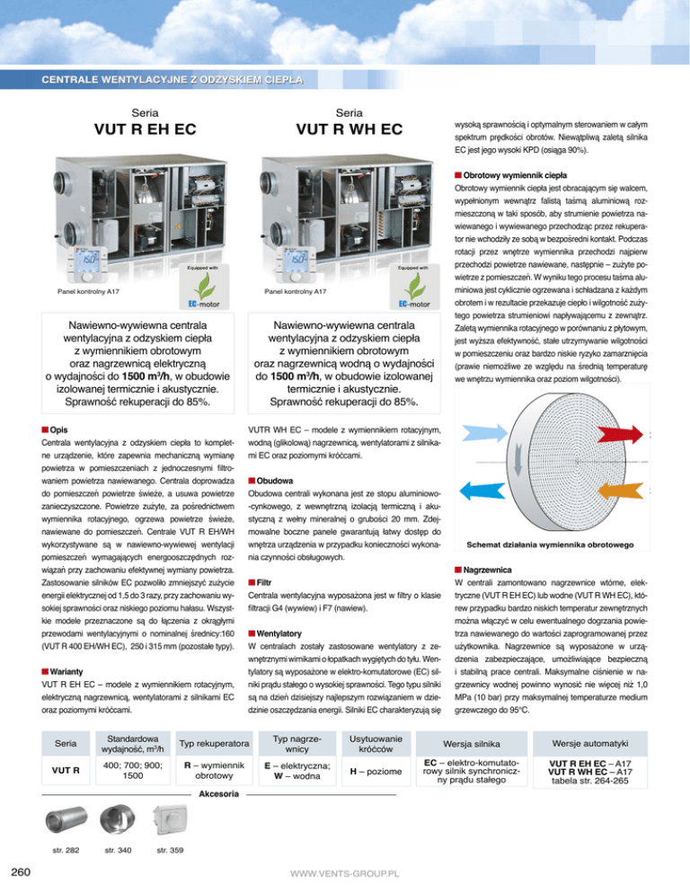 CENTRALE WENTYLACYJNE Z ODZYSKIEM CIEPŁA Seria Seria VUT R EH EC Panel kontrolny A17 Obrotowy wymiennik ciepła Obrotowy wymiennik ciepła jest obracającym się walcem, wypełnionym wewnątrz falistą taśmą aluminiową rozmieszczoną w taki sposób, aby strumienie powietrza nawiewanego i wywiewanego przechodząc przez rekuperator nie wchodziły ze sobą w bezpośredni kontakt. Podczas rotacji przez wnętrze wymiennika przechodzi najpierw przechodzi powietrze nawiewane, następnie – zużyte powietrze z pomieszczeń. W wyniku tego procesu taśma aluminiowa jest cyklicznie ogrzewana i schładzana z każdym obrotem i w rezultacie przekazuje ciepło i wilgotność zużytego powietrza strumieniowi napływającemu z zewnątrz. Zaletą wymiennika rotacyjnego w porównaniu z płytowym, jest wyższa efektywność, stałe utrzymywanie wilgotności w pomieszczeniu oraz bardzo niskie ryzyko zamarznięcia (prawie niemożliwe ze względu na średnią temperaturę we wnętrzu wymiennika oraz poziom wilgotności). Panel kontrolny A17 Nawiewno-wywiewna centrala wentylacyjna z odzyskiem ciepła z wymiennikiem obrotowym oraz nagrzewnicą elektryczną o wydajności do 1500 m3/h, w obudowie izolowanej termicznie i akustycznie. Sprawność rekuperacji do 85%. Nawiewno-wywiewna centrala wentylacyjna z odzyskiem ciepła z wymiennikiem obrotowym oraz nagrzewnicą wodną o wydajności do 1500 m3/h, w obudowie izolowanej termicznie i akustycznie. Sprawność rekuperacji do 85%. Opis Centrala wentylacyjna z odzyskiem ciepła to kompletne urządzenie, które zapewnia mechaniczną wymianę powietrza w pomieszczeniach z jednoczesnymi filtrowaniem powietrza nawiewanego. Centrala doprowadza do pomieszczeń powietrze świeże, a usuwa powietrze zanieczyszczone. Powietrze zużyte, za pośrednictwem wymiennika rotacyjnego, ogrzewa powietrze świeże, nawiewane do pomieszczeń. Centrale VUT R EH/WH wykorzystywane są w nawiewno-wywiewej wentylacji pomieszczeń wymagających energooszczędnych rozwiązań przy zachowaniu efektywnej wymiany powietrza. Zastosowanie silników EC pozwoliło zmniejszyć zużycie energii elektrycznej od 1,5 do 3 razy, przy zachowaniu wysokiej sprawności oraz niskiego poziomu hałasu. Wszystkie modele przeznaczone są do łączenia z okrągłymi przewodami wentylacyjnymi o nominalnej średnicy:160 (VUT R 400 EH/WH EC), 250 i 315 mm (pozostałe typy). VUTR WH EC – modele z wymiennikiem rotacyjnym, wodną (glikolową) nagrzewnicą, wentylatorami z silnikami EC oraz poziomymi króćcami. Warianty VUT R EH EC – modele z wymiennikiem rotacyjnym, elektryczną nagrzewnicą, wentylatorami z silnikami EC oraz poziomymi króćcami. Wlot świeżego powietrza Obudowa Obudowa centrali wykonana jest ze stopu aluminiowo-cynkowego, z wewnętrzną izolacją termiczną i akustyczną z wełny mineralnej o grubości 20 mm. Zdejmowalne boczne panele gwarantują łatwy dostęp do wnętrza urządzenia w przypadku konieczności wykonania czynności obsługowych. Nawiew świeżego powietrza do pomieszc Zużyte powietrze wyciągane z pomieszcz Wyrzut zużytego powietrza na zewnątrz Filtr Centrala wentylacyjna wyposażona jest w filtry o klasie filtracji G4 (wywiew) i F7 (nawiew). Wentylatory W centralach zostały zastosowane wentylatory z zewnętrznymi wirnikami o łopatkach wygiętych do tyłu. Wentylatory są wyposażone w elektro-komutatorowe (EC) silniki prądu stałego o wysokiej sprawności. Tego typu silniki są na dzień dzisiejszy najlepszym rozwiązaniem w dziedzinie oszczędzania energii. Silniki EC charakteryzują się Schemat działania wymiennika obrotowego Nagrzewnica W centrali zamontowano nagrzewnice wtórne, elektryczne (VUT R EH EC) lub wodne (VUT R WH EC), którew przypadku bardzo niskich temperatur zewnętrznych można włączyć w celu ewentualnego dogrzania powietrza nawiewanego do wartości zaprogramowanej przez użytkownika. Nagrzewnice są wyposażone w urządzenia zabezpieczające, umożliwiające bezpieczną i stabilną prace centrali. Maksymalne ciśnienie w nagrzewnicy wodnej powinno wynosić nie więcej niż 1,0 MPa (10 bar) przy maksymalnej temperaturze medium grzewczego do 95°C. Seria Standardowa wydajność, m3/h Typ rekuperatora Typ nagrzewnicy Usytuowanie króćców Wersja silnika Wersje automatyki VUT R 400; 700; 900; 1500 R – wymiennik obrotowy E – elektryczna; W – wodna H – poziome EC – elektro-komutatorowy silnik synchroniczny prądu stałego VUT R EH EC – A17 VUT R WH EC – A17 tabela str. 264-265 Akcesoria str. 282 260 wysoką sprawnością i optymalnym sterowaniem w całym spektrum prędkości obrotów. Niewątpliwą zaletą silnika EC jest jego wysoki KPD (osiąga 90%). VUT R WH EC str. 340 str. 359 WWW.VENTS-GROUP.PL WWW.VENTS-GROUP.PL Sterowanie i automatyka Centrala wentylacyjna posiada na wyposażeniu system automatyki sterowalny poprzez wielofunkcyjny panel kontrolny z wyświetlaczem LCD. Zestaw standardowy zawiera 10 m kabla do połączenia centrali z panelem. Montaż Centralę wentylacyjną można przymocować do podłoża lub do sufitu, za pomocą uchwytów wyposażonych w podkładki antywibracyjne. Urządzenie można zamontować zarówno w pomieszczeniach technicznych jak i w pomieszczeniach, które ono obsługuje. Rewizja serwisowa znajduje się w lewym bocznym panelu obudowy ( patrząc od strony wlotowej) W centrali typu VUT R WH EC rurki nagrzewnicy wodnej wyprowadzone są na zewnątrz po stronie lewej od wlotów powietrza Urządzenie należy zamontować w taki sposób, aby zapewnić swobodny odpływ skroplin. Podczas montażu urządzenia należy pamiętać konieczności pozostawienia niezbędnego miejsca dla obsługi serwisowej. Przyłączenie elektryczne i instalacja powinny być wykonane zgodnie z instrukcją i schematem elektrycznym znajdującym się w DTR. System automatyki jest zabezpieczony przed krótkim zanikiem napięcia. Funkcje automatyki VUT R WH EC włączenie i wyłączenie urządzenia; wybór prędkości obrotów wentylatora; ut