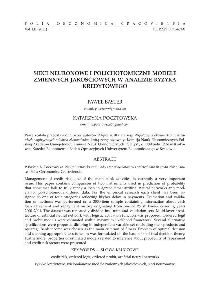 F O L I A O E C O N O M I C A C R A C O V I E N S I A Vol. LII (2011) PL ISSN 0071-674X SIECI NEURONOWE I POLICHOTOMICZNE MODELE ZMIENNYCH JAKOŚCIOWYCH W ANALIZIE RYZYKA KREDYTOWEGO PAWEŁ BASTER e-mail: [email protected] KATARZYNA POCZTOWSKA e-mail: [email protected] Praca została przedstawiona przez autorów 9 lipca 2010 r. na sesji Współczesna ekonometria w badaniach empirycznych młodych ekonomistów, którą zorganizowały: Komisja Nauk Ekonomicznych Polskiej Akademii Umiejętności, Komisja Nauk Ekonomicznych i Statystyki Oddziału PAN w Krakowie, Katedra Ekonometrii i Badań Opreacyjnych Uniwersytetu Ekonomicznego w Krakowie. ABSTRACT P. Baster, K. Pocztowska. Neural networks and models for polychotomous ordered data in credit risk analysis. Folia Oeconomica Cracoviensia Management of credit risk, one of the main bank activities, is currently a very important issue. This paper contains comparison of two instruments used in prediction of probability that consumer fails to fully repay a loan in agreed time: artificial neural networks and models for polychotomous ordered data. For the empirical research each client has been assigned to one of four categories reflecting his/her delay in payments. Estimation and validation of methods was performed on a 3000-item sample containing information about each loan agreement and repayment history originating from one of Polish banks, covering years 2000–2001. The dataset was repeatedly divided into train and validation sets. Multi-layer architecture of artificial neural network with logistic activation function was proposed. Ordered logit and probit models were estimated within maximum likelihood framework. Several alternative specifications were proposed differing in independent variable set (including their products and squares). Bank income was chosen as the main criterion of fitness. Problem of optimal decision and defining appropriate loss function was formulated on the basis of statistical decision theory. Furthermore, properties of estimated models related to inference about probability of repayment and credit risk factors were presented. KEY WORDS — SŁOWA KLUCZOWE credit risk, ordered logit, ordered probit, artificial neural networks ryzyko kredytowe, wielomianowe modele zmiennych jakościowych, sieci neuronowe 6 1. RYZYKO KREDYTOWE — WPROWADZENIE Ryzyko stanowi nieodłączny element działalności banku. W literaturze definiuje się je jako zagrożenie wynikające z nietrafnych decyzji bądź jako możliwość wystąpienia efektu niezgodnego z oczekiwaniami. W przypadku działalności kredytowej jest to niebezpieczeństwo niedotrzymania warunków umowy przez kredytobiorcę, który nie spłaca całości lub części kwoty kredytu i odsetek (Krysiak 2006). Z punktu widzenia banku niespłacanie kredytów powoduje zmniejszenie potencjalnych zysków i konieczność tworzenia rezerw celowych zabezpieczających wkłady deponentów, co w ostateczności może skutkować utratą płynności i wiarygodności, a nawet bankructwem. Dlatego też zarządzanie ryzykiem jest tak ważną sferą funkcjonowania banku. Istotą działań w tym obszarze jest identyfikacja i pomiar ryzyka. Najczęściej przyjmowaną miarą są prawdopodobieństwa spłaty kredytu przez konkretnych klientów wyznaczane za pomocą odpowiednich metod. Do najpopularniejszych należą: analiza dyskryminacyjna, modele zmiennych jakościowych, systemy eksperckie, sieci neuronowe, data mining. Banki stosują różne procedury, a ich skuteczność może stanowi o sile i konkurencyjności na rynku. Wykorzystywane narzędzia powinny pozwalać też na wyznaczenie determinant ryzyka i podjęcie decyzji kredytowej (Gruszczyński 2001). Najistotniejszym dla banku kryterium porównawczym jest jednak wielkość zysku finansowego wynikającego z zastosowania poszczególnych metod na etapie udzielania kredytów. Przedmiotem rozważań w niniejszej pracy są dwa narzędzia stosowane w analizie ryzyka kredytowego: sieci neuronowe i polichotomiczne modele zmiennych jakościowych. 2. SIECI NEURONOWE Przez sztuczne sieci neuronowe rozumiemy systemy przetwarzania danych symulujące uczące się struktury mózgu (PWN 1996). Inna definicja głosi, że sieć neuronowa to uproszczony model mózgu, składający się z pewnej liczby elementów nazywanych sztucznymi neuronami, które przetwarzają informacje. Sztuczne neurony to uproszczone modele neuronów biologicznych, których parametry (nazywane wagami) decydują o własnościach sieci i podlegają optymalizacji w trakcie procesu nazywanego uczeniem (Tadeusiewicz 1993). Z matematycznego punktu widzenia, sieci neuronowe to modele regresyjne oparte na pewnej klasie sparametryzowanych funkcji nieliniowych, których parametry szacuje się zwykle metodami nieparametrycznymi. W opisywanym badaniu wykorzystana została typowa architektura sieci wielowarstwowej jednokierunkowej z logistyczną funkcją aktywacji. Ta klasa sieci 7 jest w stanie odwzorować każdą funkcję ciągłą określoną na ograniczonym zbiorze z dowolną dokładnością (Cybenko 1989). Na rysunku 1 przedstawiony został schemat sieci tego typu. W sztucznym neuronie oblicza się ważoną sumę wejść, która jest następnie normowana przez funkcję logistyczną. Neurony ułożone są w warstwy (zwykle nie więcej niż trzy), które kolejno i równolegle przetwarzają zmienne wejściowe. Wartości generowane przez ostatnią warstwę sieci interpretowane są jako wartości wyjściowe — odpowiedź modelu. Źródło: opracowanie własne. Ryc. 1. Schemat sieci wielowarstwowej jednokierunkowej Uczenie sieci to optymalizacja wag w sensie pewnej funkcji celu (najczęściej jest to minimalizacja błędu średniokwadratowego). Ocena efektywności sieci zwykle odbywa się przez testowanie jej działania na danych nie biorących udziału w optymalizacji — tzw. zbiorze testowym, stanowiącym zazwyczaj 10–20% całego zbioru obserwacji, podczas gdy dane biorące udział w uczeniu nazyw