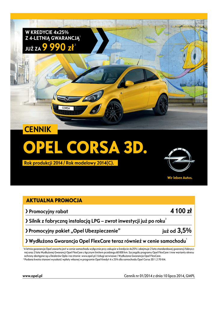 W RED C E 4 25 4 ET WARA C U A 9 990 zł 1 2 CENNIK OPEL CORSA 3D. Rok produkcji 2014 / Rok modelowy 2014(C). AKTUALNA PROMOCJA 4 100 zł Promocyjny rabat Silnik z abryczn instalacj P 3 zwrot inwestycji już po roku Promocyjny pakiet Opel Ubezpieczenie już od 3,5% 1 Wydłużona warancja Opel Fle Care teraz r wnież w cenie samochodu letnia gwarancja Opel zawarta jest w cenie samochodu wyłącznie przy zakupie w kredycie i obejmuje lata standardowej gwarancji fabrycz nej oraz lata ydłużonej warancji Opel le are z łącznym limitem przebiegu km. zczegóły programu Opel le are i inne warianty okresu ochrony dostępne są u ealerów Opla i na stronie www.opel.pl sługi serwisowe ydłużona warancja Opel le are. 2 Podana kwota stanowi wysoko wpłaty własnej w programie Opel Kredyt dla samochodu Opel orsa .2 70 K . 1 www.opel.pl Cennik nr 01/2014 z dnia 10 lipca 2014, GMPL Cennik – Opel Corsa 3-drzwiowy Rok produkcji 2014, rok modelowy 2014C Ceny promocyjne* Active Graphite Cosmo 1.2 (70 KM) M5 39 950 43 150 – 1.2 (85 KM) M5 40 600 43 800 47 250 1.2 (85 KM) Start/Stop M5 42 300 45 500 48 950 1.2 (85 KM) LPGTEC M5 42 600 45 800 49 250 1.4 (100 KM) M5 – 45 450 48 900 1.4 Turbo (120 KM) Start/Stop M5 – 50 500 53 950 1.3 CDTI (75 KM) M5 49 150 52 350 – 1.3 CDTI (95 KM) M6 – 55 450 58 900 1.3 CDTI ecoFLEX (95 KM) Start/Stop M5 53 450 56 650 60 100 3 * Dokładny opis całej oferty promocyjnej znajduje się na stronie www.opel.pl w sekcji promocje lub dostępny jest u Dealerów marki Opel. Ceny promocyjne dotyczą klientów indywidualnych (detalicznych). Klientów flotowych (firmy i przedsiębiorstwa prowadzące działalność gospodarczą bądź instytucje prowadzące działalność społeczną, zarejestrowane w Polsce i rejestrujące auto na terenie Polski) w sprawie zapytań ofertowych prosimy o kontakt z wybranym Dealerem marki Opel. 3 Zwrot kosztów instalacji fabrycznej w promocyjnej cenie 2 000 zł już po roku przy założeniach: roczny przebieg 20 000 km; średnie ceny detaliczne z dn. 26.03. 2014 r. (za www.e-petrol.pl): LPG 2,63 zł/l, Pb 95 5,58 zł/l; dla średniego spalania w cyklu mieszanym. Ceny katalogowe Active Graphite Cosmo 1.2 (70 KM) M5 44 050 47 250 – 1.2 (85 KM) M5 44 700 47 900 51 350 1.2 (85 KM) Start/Stop M5 46 400 49 600 53 050 1.2 (85 KM) LPGTEC M5 49 700 52 900 56 350 1.4 (100 KM) M5 – 49 550 53 000 1.4 Turbo (120 KM) Start/Stop M5 – 54 600 58 050 1.3 CDTI (75 KM) M5 53 250 56 450 – 1.3 CDTI (95 KM) M6 – 59 550 63 000 1.3 CDTI ecoFLEX (95 KM) Start/Stop M5 57 550 60 750 64 200 Cennik Opla Corsy 3D, rok produkcji 2014, rok modelowy 2014C, nr 01/2014 z dnia 10 lipca 2014 1/3 Wyposażenie standardowe Układ ABS Układ stabilizacji toru jazdy ESP® z systemem Traction Control System monitorowania ciśnienia w oponach z funkcją autokalibracji Wspomaganie układu kierowniczego Przednie poduszki powietrzne kierowcy i pasażera Klimatyzacja sterowana ręcznie Radioodtwarzacz CD/MP3 30, 4 głośniki (w wersji Cosmo 6 głośników), złącze AUX-in Elektrycznie sterowane szyby przednie Zdalnie sterowany centralny zamek Elektrycznie sterowane lusterka zewnętrze w kolorze nadwozia Koła stalowe 14'' Fotel kierowcy z regulacją wysokości Kolumna kierownicy regulowana w pionie i poziomie Światła do jazdy dziennej Zderzaki w kolorze nadwozia Koła stalowe 15'' Boczne poduszki powietrzne kierowcy i pasażera Elektrycznie podgrzewane lusterka zewnętrzne Tylna kanapa dzielona w proporcji 60/40 Komputer pokładowy (niedostępny z 1.2 LPG) Kierownica trójramienna pokryta skórą Przyciski sterowania na kierownicy Koła aluminiowe 15'' Koła aluminiowe 16'' (standard wyłącznie w wersji Cosmo z silnikiem 1.4 Turbo) Kurtynowe poduszki w obu rzędach siedzeń Klimatyzacja sterowana elektronicznie Reflektory przeciwmgielne Czujnik parkowania z tyłu Active Graphite Cosmo S S S S S S S S S S S S S S S – 550 400 – 900/P – 200/P 2 000 – – – 700 – S S S S S S S S S S – S S S S S S S S S S S 2 000 3 000 – 1 600/P 700/P 1 400 S S S S S – S S S S – S S S S – S S S S S S S/– S/– S S S S A14 TVi D8G RZS/QV3 QQ5 1 800 – 1 500 – – 250/P 1 800 500/P 1 500 3 200 4 000/P 250/P 1 800 500 1 500 3 200 1 000/P 250 AG6 DT4 DT3 2GB – 50 – 800 200 50 160 600 200 50 160 600 UFZ – 2 350 2 350 A88 AC4 oFB/K34 CE1 300 300 P – 300/P 300 1 000 500 300 300 1 000 500 oFB 1 350 – – oBL – 1 300 1 300 LPiH – 1 450 1 450 LPiG – 1 650 – CBY/CCF – – 1 200 oEQ – 3 300 1 500 WBP – 5 000 5 000 JM4 FX3 UJN --AK5 C60 UZU A32 AU0 D77+DP6 PA8 AH3 N33 ----QV7 AJ7 DJ8 AM9 U68 N34 W1Y QV5 QV4/NWK AY0 C68 T96 UD3 Wyposażenie dodatkowe NADWOZIE Lakier metaliczny/perłowy/brylantowy/bazowy Guacamole Przyciemniane szyby tylne Adaptacyjne reflektory halogenowe AFL Bagażnik rowerowy zintegrowany w tylnym zderzaku FlexFix ® Koła aluminiowe 17'' Zapasowe koło pełnowymiarowe WNĘTRZE Fotel pasażera z regulacją wysokości Pakiet dla palących (popielniczka i zapalniczka) Podwójna podłoga bagażnika Radioodtwarzacz CD/MP3 ze złączem USB i przyciskami sterowania na kierownicy Radioodtwarzacz CD/MP3 z nawigacją „Touch&Connect”, wyświetlaczem dotykowym, złączem USB i modułem Bluetooth® BEZPIECZEŃSTWO I UKŁADY WSPOMAGAJĄCE KIEROWCĘ Aktywne zagłówki foteli przednich Mocowanie fotelika ISOFIX na fotelu pasażera Tempomat Czujnik deszczu, automatyczny włącznik świateł, lusterko wsteczne światłoczułe PAKIETY WYPOSAŻENIA DODATKOWEGO Pakiet Techniczny Tempomat. Komputer pokładowy (niedostępny z 1.2 LPG) . Pakiet Zimowy Podgrzewana kierownica trójramienna pokryta skórą . Podgrzewane fotele przednie. Pakiet Biznesowy Alarm. Aktywne zagłówki foteli przednich. Pełnowymiarowe koło zapasowe. Środkowy zagłówek tylny. Pakiet Graphite Plus Klimatyzacja sterowana elektronicznie. Reflektory przeciwmgielne. Przyciemniane szyby tylne. Pakiet Linea Czarny/Biały Naklejane pasy ozdobne. Koła aluminiowe 17''. Do wyboru zestaw w kol