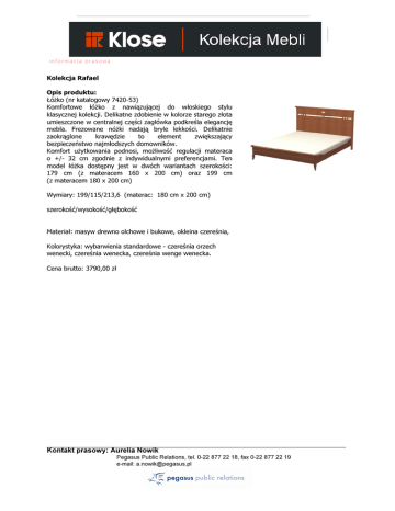 informacja prasowa Kolekcja Rafael Opis produktu: Łóżko (nr katalogowy 7420-53) Komfortowe łóżko z nawiązującej do włoskiego stylu klasycznej kolekcji. Delikatne zdobienie w kolorze starego złota umieszczone w centralnej części zagłówka podkreśla elegancję mebla. Frezowane nóżki nadają bryle lekkości. Delikatnie zaokrąglone krawędzie to element zwiększający bezpieczeństwo najmłodszych domowników. Komfort użytkowania podnosi, możliwość regulacji materaca o +/- 32 cm zgodnie z indywidualnymi preferencjami. Ten model łóżka dostępny jest w dwóch wariantach szerokości: 179 cm (z materacem 160 x 200 cm) oraz 199 cm (z materacem 180 x 200 cm) Wymiary: 199/115/213,6 (materac: 180 cm x 200 cm) szerokość/wysokość/głębokość Materiał: masyw drewno olchowe i bukowe, okleina czereśnia, Kolorystyka: wybarwienia standardowe - czereśnia orzech wenecki, czereśnia wenecka, czereśnia wenge wenecka. Cena brutto: 3790,00 zł Kontakt prasowy: Aurelia Nowik Pegasus Public Relations, tel. 0-22 877 22 18, fax 0-22 877 22 19 e-mail: [email protected] informacja prasowa Opis produktu: Taboret (nr katalogowy 7423-97) Elegancki i niezwykle funkcjonalny stylizowany taboret. Wygodne siedzisko dzięki optymalnie dobranej twardości zapewni nam komfort siedzenia, a jednocześnie doskonale zamortyzuje nasz ciężar. Z myślą o bezpieczeństwie najmłodszych użytkowników rogi taboretu są starannie zeszlifowane, a krawędzie frezowanych nóżek delikatnie zaokrąglone. To bryła prosta, a zarazem szykowna. Dzięki niewielkim wymiarom znajdzie swoje miejsce nawet w małej sypialni. Wymiary: 51,5/40/42,5 cm szerokość/wysokość/głębokość Materiał: buk Kolorystyka: wybarwienia standardowe - czereśnia orzech wenecki, czereśnia wenecka, czereśnia wenge wenecka. Cena brutto: od 495,00 do 762,00 zł (w zależności od wybranej wersji tapicerki) Kontakt prasowy: Aurelia Nowik Pegasus Public Relations, tel. 0-22 877 22 18, fax 0-22 877 22 19 e-mail: [email protected] informacja prasowa Opis produktu: Toaletka (nr katalogowy 7420-54) Funkcjonalna toaletka w eleganckim stylu. Ozdobna aplikacja umiejscowiona pomiędzy dwiema szufladkami oraz metalowe okucia w kolorze starego złota podkreślają piękno mebla stworzonego z myślą o kobietach. Wysmukła linia bryły to zasługa jej odpowiednich proporcji oraz długich, delikatnie frezowanych nóżek. Centralna część blatu toaletki skrywa rozkładane lustro, którego podniesienie ujawnia niewielką „skrytkę” wyłożoną zielonym suknem – przybornik na najpotrzebniejsze kobiece akcesoria. Funkcjonalność i estetyka łączą się z ergonomią rozwiązań konstrukcyjnych. Zaokrąglone krawędzie bryły zwiększają bezpieczeństwo najmłodszych domowników. Wymiary: 94/80/43 szerokość/wysokość/głębokość Materiał: masyw olcha, okleina czereśnia; nogi - buk Kolorystyka: wybarwienia standardowe - czereśnia orzech wenecki, czereśnia wenecka, czereśnia wenge wenecka. Cena brutto: 2450,00 zł Kontakt prasowy: Aurelia Nowik Pegasus Public Relations, tel. 0-22 877 22 18, fax 0-22 877 22 19 e-mail: [email protected] informacja prasowa Opis produktu: Stolik nocny (nr katalogowy 7420-56) Stolik nocny o prostej linii bryły i kunsztownych detalach. Delikatnie zdobione profile, dekoracyjne elementy boczne przypominające kolumny oraz subtelne wykończenia w kolorze starego złota podkreślają elegancję klasycznego mebla. Zaokrąglone brzegi bryły oraz delikatne frezowane nóżki nadają jej lekkości. Dwie otwarte półeczki idealnie pasują na niewielkie przedmioty codziennego użytku, nad nimi znajdziemy małą szufladkę skrywająca nasze „sekrety”. Wymiary: 50/70/43,4 szerokość/wysokość/głębokość Materiał: masyw olcha, okleina czereśnia. Kolorystyka: wybarwienia standardowe - czereśnia orzech wenecki, czereśnia wenecka, czereśnia wenge wenecka. Cena brutto: 1495,00 zł Kontakt prasowy: Aurelia Nowik Pegasus Public Relations, tel. 0-22 877 22 18, fax 0-22 877 22 19 e-mail: [email protected] informacja prasowa Opis produktu: Konsolka (nr katalogowy 7420-55) Wyróżniająca się ozdobnymi detalami oraz delikatnymi wykończeniami w kolorze starego złota. Wyposażona w szufladkę wyściełaną zielonym suknem. Subtelnie frezowane czoło szuflady podkreśla elegancki charakter mebla. Konsolka wsparta jest na delikatnie frezowanych nóżkach o starannie zeszlifowanych krawędziach. Dzięki nim bryła nabiera lekkości. Wymiary: 93,7/80/43,4 szerokość/wysokość/głębokość Materiał: masyw olcha, okleina czereśnia; Kolorystyka: wybarwienia standardowe - czereśnia orzech wenecki, czereśnia wenecka, czereśnia wenge wenecka. Cena brutto: 1915,00 zł Kontakt prasowy: Aurelia Nowik Pegasus Public Relations, tel. 0-22 877 22 18, fax 0-22 877 22 19 e-mail: [email protected] informacja prasowa Opis produktu: Ławka (nr katalogowy 7424-97) Stylizowana ławka z komfortowym siedziskiem. Delikatne, frezowane nóżki o starannie wyszlifowanych krawędziach nadają bryle lekkości. Wymiary: 110/43/39,5 szerokość/wysokość/głębokość Materiał: buk Kolorystyka: wybarwienia standardowe - czereśnia orzech wenecki, czereśnia wenecka, czereśnia wenge wenecka. Cena brutto: od 625,00 do 1159,00 zł (w zależności od rodzaju tapicerki) Kontakt prasowy: Aurelia Nowik Pegasus Public Relations, tel. 0-22 877 22 18, fax 0-22 877 22 19 e-mail: [email protected]