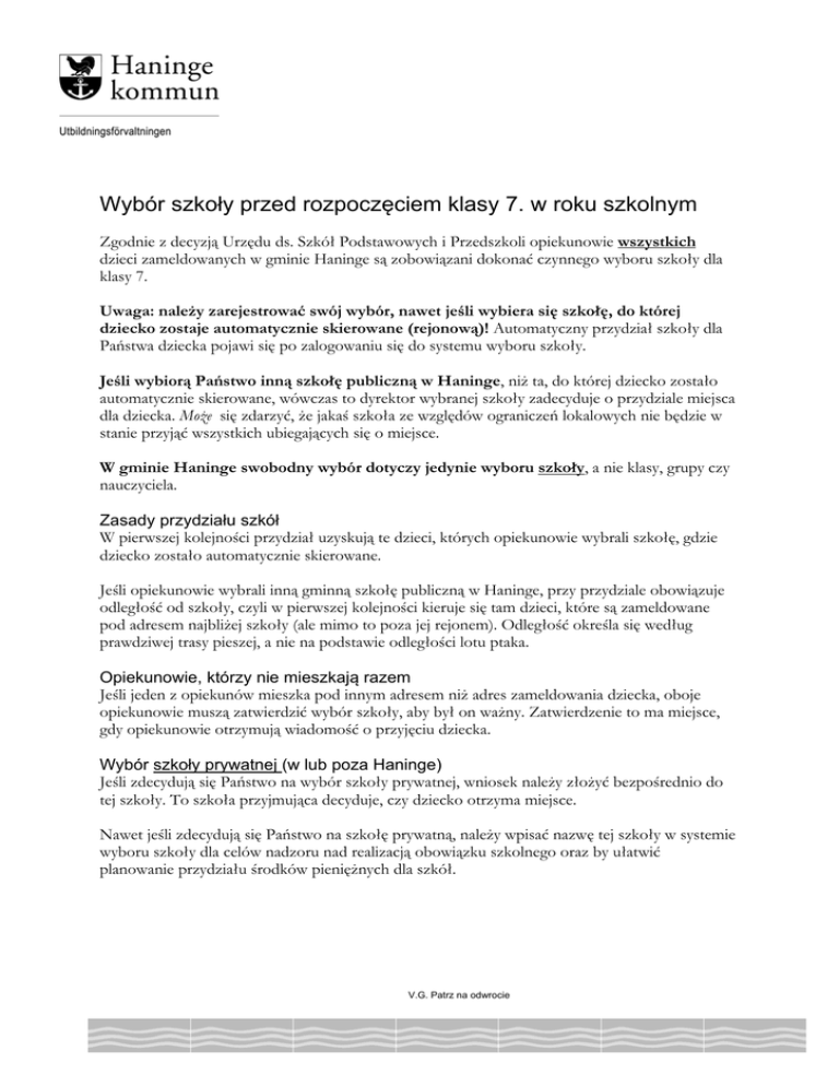 Wybór szkoły przed rozpoczęciem klasy 7. w roku szkolnym Zgodnie z decyzją Urzędu ds. Szkół Podstawowych i Przedszkoli opiekunowie wszystkich dzieci zameldowanych w gminie Haninge są zobowiązani dokonać czynnego wyboru szkoły dla klasy 7. Uwaga: należy zarejestrować swój wybór, nawet jeśli wybiera się szkołę, do której dziecko zostaje automatycznie skierowane (rejonową)! Automatyczny przydział szkoły dla Państwa dziecka pojawi się po zalogowaniu się do systemu wyboru szkoły. Jeśli wybiorą Państwo inną szkołę publiczną w Haninge, niż ta, do której dziecko zostało automatycznie skierowane, wówczas to dyrektor wybranej szkoły zadecyduje o przydziale miejsca dla dziecka. Może się zdarzyć, że jakaś szkoła ze względów ograniczeń lokalowych nie będzie w stanie przyjąć wszystkich ubiegających się o miejsce. W gminie Haninge swobodny wybór dotyczy jedynie wyboru szkoły, a nie klasy, grupy czy nauczyciela. Zasady przydziału szkół W pierwszej kolejności przydział uzyskują te dzieci, których opiekunowie wybrali szkołę, gdzie dziecko zostało automatycznie skierowane. Jeśli opiekunowie wybrali inną gminną szkołę publiczną w Haninge, przy przydziale obowiązuje odległość od szkoły, czyli w pierwszej kolejności kieruje się tam dzieci, które są zameldowane pod adresem najbliżej szkoły (ale mimo to poza jej rejonem). Odległość określa się według prawdziwej trasy pieszej, a nie na podstawie odległości lotu ptaka. Opiekunowie, którzy nie mieszkają razem Jeśli jeden z opiekunów mieszka pod innym adresem niż adres zameldowania dziecka, oboje opiekunowie muszą zatwierdzić wybór szkoły, aby był on ważny. Zatwierdzenie to ma miejsce, gdy opiekunowie otrzymują wiadomość o przyjęciu dziecka. Wybór szkoły prywatnej (w lub poza Haninge) Jeśli zdecydują się Państwo na wybór szkoły prywatnej, wniosek należy złożyć bezpośrednio do tej szkoły. To szkoła przyjmująca decyduje, czy dziecko otrzyma miejsce. Nawet jeśli zdecydują się Państwo na szkołę prywatną, należy wpisać nazwę tej szkoły w systemie wyboru szkoły dla celów nadzoru nad realizacją obowiązku szkolnego oraz by ułatwić planowanie przydziału środków pieniężnych dla szkół. V.G. Patrz na odwrocie 2 (2) Wybór szkoły publicznej w innej gminie Jeśli chcą Państwo posłać dziecko do szkoły publicznej poza gminą Haninge, wniosek należy złożyć bezpośrednio do tej szkoły. To szkoła przyjmująca decyduje, czy dziecko otrzyma miejsce. Nawet jeśli zdecydują się Państwo na szkołę w innej gminie, należy wpisać nazwę tej szkoły w systemie wyboru szkoły dla celów nadzoru nad realizacją obowiązku szkolnego oraz by ułatwić planowanie przydziału środków pieniężnych dla naszych szkół. Należy pamiętać, że gmina Haninge nie odpowiada za przyjęcia do szkół prywatnych lub szkół w innych gminach!! Język ojczysty Jeśli opiekunowie uczniów mówią innym językiem ojczystym niż język szwedzki i jeśli język ten jest używany codziennie w domu, uczniowie ci mają prawo do edukacji w języku ojczystym. Język ojczysty wybiera się z użyciem specjalnego formularza dostępnego na stronie haninge.se/forskola-och-skola/modersmal. Transport szkolny (taxi i bilet SL) Prawo do transportu szkolnego lub biletu SL regulują specjalne przepisy. Można je znaleźć na haninge.se/forskola-och-skola/skolskjuts-och-sl-kort Wybór innej szkoły niż szkoła rejonowa automatycznego przydziału może mieć wpływ na prawo do transportu szkolnego. Uczniowie uprawnieni do bezpłatnego transportu do szkoły rejonowej automatycznego przydziału mogą mieć prawo do bezpłatnego transportu do innej szkoły, jeśli transport do wybranej szkoły nie pociąga za sobą dodatkowych kosztów dla gminy. Zachęcamy do skonsultowania się z oddziałem zajmującym się transportem szkolnym w gminie (szw. skolskjutshandläggare) przed dokonaniem wyboru szkoły. Ustawa o ochronie danych osobowych (PuL) Zgodnie z § 10 Ustawy o ochronie danych osobowych, gmina może przetwarzać dane osobowe, jeśli jest to konieczne do realizacji odpowiednich zadań związanych ze sprawowaniem władzy publicznej. Dane osobowe przetwarzane w ramach e-usługi "Wybór szkoły" zostaną zarejestrowane zgodnie z Ustawą o ochronie danych osobowych (PuL). Celem przetwarzania danych osobowych jest zarządzanie wyborem szkoły w gminie Haninge. Informacje o języku ojczystym są niezbędne, by zapewnić odpowiednie świadczenia, gdyż w niektórych przypadkach uczniowie mają prawo do nauki w języku ojczystym, a gmina ma obowiązek upewnić się, że dysponuje odpowiednimi środkami dostępnymi na ten cel. Odbiorcami danych osobowych są przedmiotowe szkoły. Zarządca danych osobowych jest zobowiązany przekazać raz w roku kalendarzowym, bezpłatnie każdemu, kto się o to ubiega, informacje o danych osobowych dotyczących wnioskodawcy, niezależnie od tego, czy są one przetwarzane czy nie (§ 26 PuL). Zarządca danych osobowych jest ponadto zobowiązany, na żądanie wnioskodawcy, bezzwłocznie skorygować, zablokować lub usunąć dane osobowe, które nie zostały przetworzone zgodnie z przepisami niniejszej ustawy lub odpowiednio wydanych rozporządzeń (§ 28 PuL). Urząd ds. Szkół Podstawowych i Przedszkoli wyznaczył specjalnego pełnomocnika ds. danych osobowych, do którego można zwrócić się po wsparcie i pomoc. W razie pytań, prosimy o kontakt: [email protected].