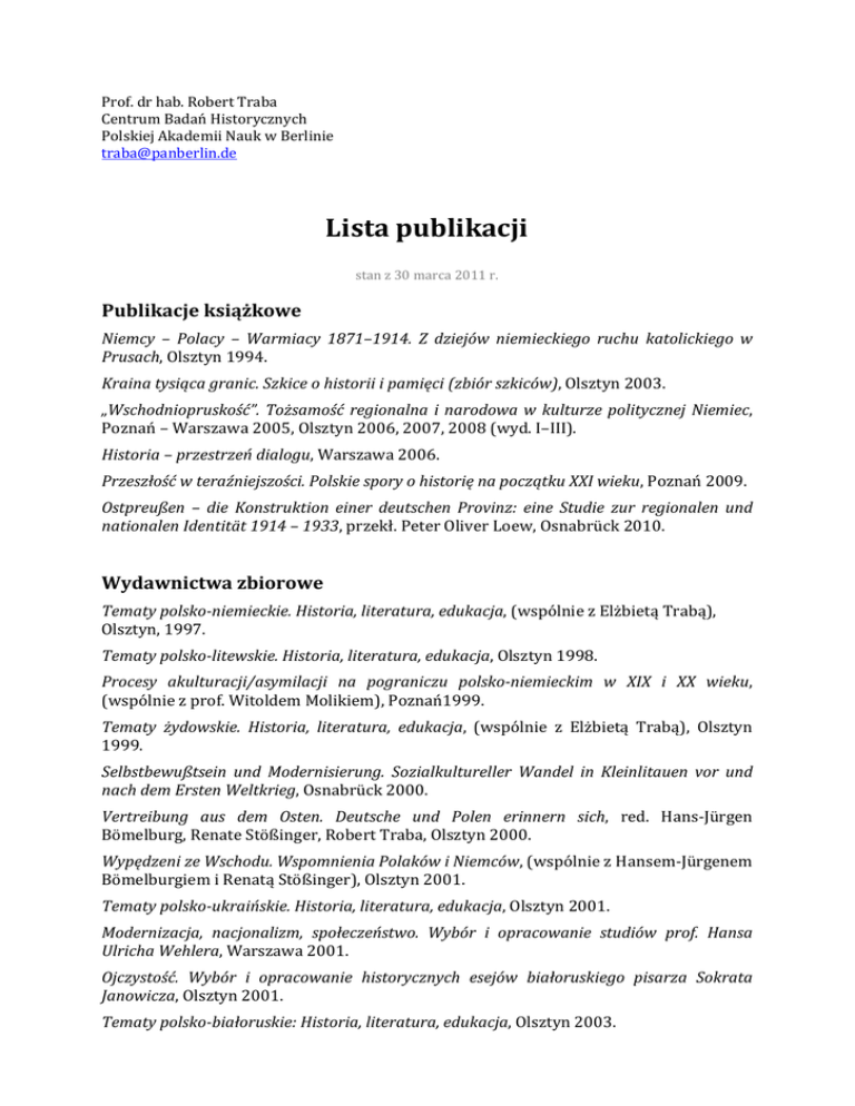 Prof. dr hab. Robert Traba Centrum Badań Historycznych Polskiej Akademii Nauk w Berlinie [email protected] Lista publikacji stan z 30 marca 2011 r. Publikacje książkowe Niemcy – Polacy – Warmiacy 1871–1914. Z dziejów niemieckiego ruchu katolickiego w Prusach, Olsztyn 1994. Kraina tysiąca granic. Szkice o historii i pamięci (zbiór szkiców), Olsztyn 2003. „Wschodniopruskość”. Tożsamość regionalna i narodowa w kulturze politycznej Niemiec, Poznań – Warszawa 2005, Olsztyn 2006, 2007, 2008 (wyd. I–III). Historia – przestrzeń dialogu, Warszawa 2006. Przeszłość w teraźniejszości. Polskie spory o historię na początku XXI wieku, Poznań 2009. Ostpreußen – die Konstruktion einer deutschen Provinz: eine Studie zur regionalen und nationalen Identität 1914 – 1933, przekł. Peter Oliver Loew, Osnabrück 2010. Wydawnictwa zbiorowe Tematy polsko-niemieckie. Historia, literatura, edukacja, (wspólnie z Elżbietą Trabą), Olsztyn, 1997. Tematy polsko-litewskie. Historia, literatura, edukacja, Olsztyn 1998. Procesy akulturacji/asymilacji na pograniczu polsko-niemieckim w XIX i XX wieku, (wspólnie z prof. Witoldem Molikiem), Poznań1999. Tematy żydowskie. Historia, literatura, edukacja, (wspólnie z Elżbietą Trabą), Olsztyn 1999. Selbstbewußtsein und Modernisierung. Sozialkultureller Wandel in Kleinlitauen vor und nach dem Ersten Weltkrieg, Osnabrück 2000. Vertreibung aus dem Osten. Deutsche und Polen erinnern sich, red. Hans-Jürgen Bömelburg, Renate Stößinger, Robert Traba, Olsztyn 2000. Wypędzeni ze Wschodu. Wspomnienia Polaków i Niemców, (wspólnie z Hansem-Jürgenem Bömelburgiem i Renatą Stößinger), Olsztyn 2001. Tematy polsko-ukraińskie. Historia, literatura, edukacja, Olsztyn 2001. Modernizacja, nacjonalizm, społeczeństwo. Wybór i opracowanie studiów prof. Hansa Ulricha Wehlera, Warszawa 2001. Ojczystość. Wybór i opracowanie historycznych esejów białoruskiego pisarza Sokrata Janowicza, Olsztyn 2001. Tematy polsko-białoruskie: Historia, literatura, edukacja, Olsztyn 2003. Codzienność zapamiętana? Lata czterdzieste i pięćdziesiąte na Warmii i Mazurach, (wspólnie z Hansem-Jürgenem Karpem), Warszawa – Olsztyn 2004. Nachkriegsalltag in Ostpreußen. Erinnerungen von Deutschen, Polen und Ukrainer, (wspólnie z Hansem-Jürgenem Karpem), Münster 2004. Golo Mann, Dzieje niemieckie XIX i XX wieku, Olsztyn 2007 (opracowanie i posłowie). Przeszłość zapamiętana. Narracje z pogranicza, tom I serii: R. Traba, Historia i pamięć polsko-niemieckiego pogranicza. Warmińska Purda, (wspólnie z Andrzejem Saksonem), Olsztyn 2007. Purda 1900–2006. Portret wsi / Gross Purden 1900–2006. Das Portrait eines Dorfes, red. Magdalena Kardach, Janusz Pilecki i Elżbieta Traba, tom II serii: R. Traba, Historia i pamięć polsko-niemieckiego pogranicza. Warmińska Purda, Olsztyn 2008. Jan Assmann, Pamięć kulturowa, Warszawa 2008 (opracowanie i wstęp). Pamięć. Wyzwanie dla nowoczesnej Europy, Olsztyn 2008 (redakcja i wprowadzenie) – wydanie dwujęzyczne z okazji wręczenia tytułu doctora honoris causa Uniwersytetu Warmińsko-Mazurskiego Hansowi-Gertowi Pötteringowi. Akulturacja/asymilacja na pograniczach kulturowych Europy Środkowo-Wschodniej w XIX i XX wieku, tom I: Stereotypy i pamięć, Warszawa 2009. My, berlińczycy! Wir Berliner! Geschichte einer deutsch-polnischen Nachbarschaft, Berlin 2009. My, berlińczycy! Wir Berliner! Historia polsko-niemieckiego sąsiedztwa, Berlin 2009. Serie wydawnicze (koncepcja i redakcja naukowa) 7 tomów serii „Klio w Niemczech”, w tym m.in. dzieła Winfrieda Schulze, Ute Frevert, Hartmuta Boockmanna, Thomasa Nipperdeya, Martina Broszata, Johannesa Frieda, Klausa Zernacka, Hansa-Ulricha Wehlera, Warszawa: Deutsches Historisches Institut Warschau 1996–2001. 11 romów serii „Odkrywanie światów“, Olsztyn: B orussia, 1999–2005. „Krajobrazy pamięci”, Olsztyn. „Historia i pamięć polsko-niemieckiego pogranicza. Warmińska Purda”, Olsztyn. Redaktor naczelny czasopisma „Borussia. Historia – Kultura – Literatura“. Członek redakcji czasopisma „Kultura i Społeczeństwo“. Członek redakcji czasopisma „Historie“. Artykuły Organizacja i działalność oddziałów Polskiego Towarzystwa Historycznego na Pomorzu Wschodnim i Kujawach w latach 1948–1985, „Zapiski Historyczne”, 1986, z. 4, s. 57–74. Eugeniusz Buchholz. Przyczynek do biografii, „Komunikaty Mazursko-Warmińskie“, 1987, nr 2, s. 267–287. Nieznane listy Adama Napieralskiego, „Sobótka”, 1987, nr 2, s. 231–242. Prasa katolicka na Warmii 1871–1914, „Olsztyńskie Studia Niemcoznawcze”, 1989, t. III, s. 17–40. Prasa polska w Prusach Wschodnich o układzie monachijskim, w: W 50. rocznicę konferencji monachijskiej – niedocenionego ostrzeżenia dla narodów świata, Olsztyn 1990, s. 75–80. Polityczne i prawne aspekty tzw. sprawy Gabrylewicza. Przyczynek do dziejów Warmińskiego Komitetu Plebiscytowego, (wspólnie z Bogdanem Cybulskim), „Acta Universitatis Wratislaviensis”, (Prawo) CXCXII, 1992, s. 124–157. Grunwald w niemieckiej publicystyce prowincji Prusy Wschodnie na przełomie XIX i XX wieku, „Studia Grunwaldzkie”, 1992, t. II, s. 53–62. „Regionalna” czy „narodowa”?, „Borussia”, 1993, nr 6, s. 42–46. Postawy narodowe niemieckich Warmiaków (1871–1914), w: Zagadnienia narodowościowe w Prusach Wschodnich w XIX i XX wieku, red. Janusz Jasiński, Olsztyn 1993, s. 88–102. Zur Entwicklung des politischen Katholizismus im Ermland 1871–1914, „Zeitschrift für die Geschichte und Altertumskunde Ermlands“, 1994, t. 47, s. 107–119. Ultramontanizm – pojęcie i jego znaczenie w propagandzie politycznej w Prusach Wschodnich na przełomie XIX i XX wieku, „Komunikaty Mazursko-Warmińskie“, 1994, nr 2–3, s. 239–246. Durch die Grenze zur Normalität?, w: „Ein schicklicher Platz“? Königsberg/Kaliningrad in der Sicht von Bewohnern und Nachbarn, red.