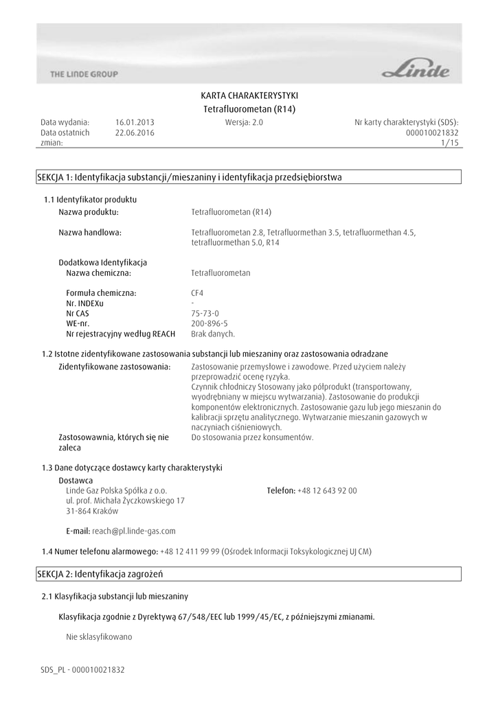 KARTA CHARAKTERYSTYKI Tetrafluorometan (R14) Data wydania: Data ostatnich zmian: 16.01.2013 22.06.2016 Wersja: 2.0 Nr karty charakterystyki (SDS): 000010021832 1/15 SEKCJA 1: Identyfikacja substancji/mieszaniny i identyfikacja przedsiębiorstwa 1.1 Identyfikator produktu Nazwa produktu: Tetrafluorometan (R14) Nazwa handlowa: Tetrafluorometan 2.8, Tetrafluormethan 3.5, tetrafluormethan 4.5, tetrafluormethan 5.0, R14 Dodatkowa Identyfikacja Nazwa chemiczna: Formuła chemiczna: Nr. INDEXu Nr CAS WE-nr. Nr rejestracyjny według REACH Tetrafluorometan CF4 75-73-0 200-896-5 Brak danych. 1.2 Istotne zidentyfikowane zastosowania substancji lub mieszaniny oraz zastosowania odradzane Zidentyfikowane zastosowania: Zastosowawnia, których się nie zaleca Zastosowanie przemysłowe i zawodowe. Przed użyciem należy przeprowadzić ocenę ryzyka. Czynnik chłodniczy Stosowany jako półprodukt (transportowany, wyodrębniany w miejscu wytwarzania). Zastosowanie do produkcji komponentów elektronicznych. Zastosowanie gazu lub jego mieszanin do kalibracji sprzętu analitycznego. Wytwarzanie mieszanin gazowych w naczyniach ciśnieniowych. Do stosowania przez konsumentów. 1.3 Dane dotyczące dostawcy karty charakterystyki Dostawca Linde Gaz Polska Spółka z o.o. ul. prof. Michała Życzkowskiego 17 31-864 Kraków Telefon: +48 12 643 92 00 E-mail: [email protected] 1.4 Numer telefonu alarmowego: +48 12 411 99 99 (Ośrodek Informacji Toksykologicznej UJ CM) SEKCJA 2: Identyfikacja zagrożeń 2.1 Klasyfikacja substancji lub mieszaniny Klasyfikacja zgodnie z Dyrektywą 67/548/EEC lub 1999/45/EC, z późniejszymi zmianami. Nie sklasyfikowano SDS_PL - 000010021832 KARTA CHARAKTERYSTYKI Tetrafluorometan (R14) Data wydania: Data ostatnich zmian: 16.01.2013 22.06.2016 Wersja: 2.0 Nr karty charakterystyki (SDS): 000010021832 2/15 Klasyfikacja zgodnie z Rozporządzeniem (WE) Nr 1272/2008, z późniejszymi zmianami. Zagrożenia Fizyczne Gazy pod ciśnieniem Gaz skroplony H280: Zawiera gaz pod ciśnieniem; ogrzanie grozi wybuchem. 2.2 Elementy Oznakowania Hasło Ostrzegawcze: Uwaga Zwroty wskazujące rodzaj zagrożenia: H280: Zawiera gaz pod ciśnieniem; ogrzanie grozi wybuchem. Ostrzeżenie Zapobieganie: Żadnych. Reagowanie: Żadnych. Magazynowanie: P403: Przechowywać w dobrze wentylowanym miejscu. Usunięcie odpadów: Żadnych. Informacje uzupełniające na etykiecie EIGA-0783: Zawiera fluorowane gazy cieplarniane objęte protokołem z Kioto. EIGA-As: Środek duszący w wysokich stężeniach. 2.3 Inne zagrożenia: SDS_PL - 000010021832 Kontakt z parującą cieczą może powodować odmrożenie albo zamarznięcie skóry. KARTA CHARAKTERYSTYKI Tetrafluorometan (R14) Data wydania: Data ostatnich zmian: 16.01.2013 22.06.2016 Wersja: 2.0 Nr karty charakterystyki (SDS): 000010021832 3/15 SEKCJA 3: Skład/informacja o składnikach 3.1 Substancje Nazwa chemiczna Nr. INDEXu: Nr CAS: WE-nr.: Nr rejestracyjny według REACH: Czystość: Nazwa handlowa: Tetrafluorometan 75-73-0 200-896-5 Brak danych. 100% Czystość substancji w niniejszej sekcji została zastosowana tylko do celów klasyfikacyjnych i nie przedstawia rzeczywistej czystości substancji w stanie dostarczanym, dla której należy zapoznać się z inną dokumentacją. Tetrafluorometan 2.8, Tetrafluormethan 3.5, tetrafluormethan 4.5, tetrafluormethan 5.0, R14 SEKCJA 4: Środki pierwszej pomocy Uwagi ogólne: W wysokich stężeniach może spowodować uduszenie. Objawy obejmują utratę zdolności ruchowych/przytomności. Ofiara może nie być świadoma, że się dusi. Zabezpieczając się izolującym aparatem oddechowym przenieść ofiarę do nieskażonego obszaru. Utrzymywać ofiarę w cieple i spokoju. Wezwać lekarza. W przypadku zaniku oddechu zastosować sztuczne oddychanie. 4.1 Opis środków pierwszej pomocy Wdychanie: W wysokich stężeniach może spowodować uduszenie. Objawy obejmują utratę zdolności ruchowych/przytomności. Ofiara może nie być świadoma, że się dusi. Zabezpieczając się izolującym aparatem oddechowym przenieść ofiarę do nieskażonego obszaru. Utrzymywać ofiarę w cieple i spokoju. Wezwać lekarza. W przypadku zaniku oddechu zastosować sztuczne oddychanie. Kontakt z oczami: Niezwłocznie przemyć oko wodą. Wyjąć soczewki kontaktowe, jeżeli są i można je łatwo usunąć. Nadal płukać. Płukać dokładnie dużą ilością wody przez 15 minut. Zasięgnąć niezwłocznie porady lekarskiej. W przypadku braku natychmiastowej pomocy lekarskiej, płukać przez dodatkowe 15 minut. Kontakt ze Skórą: Kontakt z parującą cieczą może powodować odmrożenie albo zamarznięcie skóry. Spożycie: Spożycie nie jest uważane za potencjalną drogę narażenia. 4.2 Najważniejsze ostre i opóźnione objawy oraz skutki narażenia: SDS_PL - 000010021832 Wstrzymanie oddechu. Kontakt ze skroplonym gazem może spowodować urazy (odmrożenie) ze względu na szybkie chłodzenie w wyniku parowania. KARTA CHARAKTERYSTYKI Tetrafluorometan (R14) Data wydania: Data ostatnich zmian: 16.01.2013 22.06.2016 Wersja: 2.0 Nr karty charakterystyki (SDS): 000010021832 4/15 4.3 Wskazania dotyczące wszelkiej natychmiastowej pomocy lekarskiej i szczególnego postępowania z poszkodowanym Zagrożenia: Wstrzymanie oddechu. Kontakt ze skroplonym gazem może spowodować urazy (odmrożenie) ze względu na szybkie chłodzenie w wyniku parowania. Leczenie: Rozmrozić oszronione obszary letnią wodą. Nie trzeć oszronionego obszaru. Natychmiast zasięgnąć porady/zgłosić się pod opiekę lekarza. SEKCJA 5: Postępowanie w przypadku pożaru Ogólne Zagrożenia Pożarowe: Pojemniki mogą wybuchnąć wskutek wysokiej temperatury. 5.1 Środki gaśnicze Stosowne środki gaśnicze: Substancja nie zapali się. W przypadku pożaru w otoczeniu: zastosować odpowiedni środek gaśniczy. Niewłaściwe środki gaśnicze: Żadnych. 5.2 Szczególne zagrożenia związane z substancją lub mieszaniną: Niebezpieczne produkty spalania: Pożar lub zbyt wysoka temperatura może