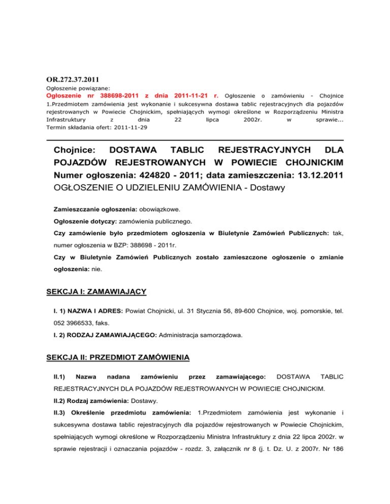 OR.272.37.2011 Ogłoszenie powiązane: Ogłoszenie nr 388698-2011 z dnia 2011-11-21 r. Ogłoszenie o zamówieniu - Chojnice 1.Przedmiotem zamówienia jest wykonanie i sukcesywna dostawa tablic rejestracyjnych dla pojazdów rejestrowanych w Powiecie Chojnickim, spełniających wymogi określone w Rozporządzeniu Ministra Infrastruktury z dnia 22 lipca 2002r. w sprawie... Termin składania ofert: 2011-11-29 Chojnice: DOSTAWA TABLIC REJESTRACYJNYCH DLA POJAZDÓW REJESTROWANYCH W POWIECIE CHOJNICKIM Numer ogłoszenia: 424820 - 2011; data zamieszczenia: 13.12.2011 OGŁOSZENIE O UDZIELENIU ZAMÓWIENIA - Dostawy Zamieszczanie ogłoszenia: obowiązkowe. Ogłoszenie dotyczy: zamówienia publicznego. Czy zamówienie było przedmiotem ogłoszenia w Biuletynie Zamówień Publicznych: tak, numer ogłoszenia w BZP: 388698 - 2011r. Czy w Biuletynie Zamówień Publicznych zostało zamieszczone ogłoszenie o zmianie ogłoszenia: nie. SEKCJA I: ZAMAWIAJĄCY I. 1) NAZWA I ADRES: Powiat Chojnicki, ul. 31 Stycznia 56, 89-600 Chojnice, woj. pomorskie, tel. 052 3966533, faks. I. 2) RODZAJ ZAMAWIAJĄCEGO: Administracja samorządowa. SEKCJA II: PRZEDMIOT ZAMÓWIENIA II.1) Nazwa nadana zamówieniu przez zamawiającego: DOSTAWA TABLIC REJESTRACYJNYCH DLA POJAZDÓW REJESTROWANYCH W POWIECIE CHOJNICKIM. II.2) Rodzaj zamówienia: Dostawy. II.3) Określenie przedmiotu zamówienia: 1.Przedmiotem zamówienia jest wykonanie i sukcesywna dostawa tablic rejestracyjnych dla pojazdów rejestrowanych w Powiecie Chojnickim, spełniających wymogi określone w Rozporządzeniu Ministra Infrastruktury z dnia 22 lipca 2002r. w sprawie rejestracji i oznaczania pojazdów - rozdz. 3, załącznik nr 8 (j. t. Dz. U. z 2007r. Nr 186 poz.1322 ze zm.) oraz odbiór starych tablic rejestracyjnych będących w magazynie Wydziału Komunikacji i Transportu Starostwa Powiatowego w Chojnicach w wyznaczonym przez zamawiającego terminie i ich złomowanie. 2. Zamówienie obejmuje dostawę tablic rejestracyjnych wg wzorów określonych w załączniku Nr 8 do w/w rozporządzenia w rodzajach i ilościach jak niżej: L.p. Rodzaj tablicy Jednostka Ilość 1. Tablice zwyczajne - samochodowe jednorzędowe kpl. 5000 samochodowe jednorzędowe (przeznaczone do przyczep) szt. 594 - motocyklowe szt. 594 motorowerowe szt. 594 2. Tablice indywidualne - samochodowe jednorzędowe kpl. 5 samochodowe dwurzędowe kpl. 2 - motocyklowe szt. 2 3. Tablice zabytkowe - samochody jednorzędowe kpl. 3 - samochodowe dwurzędowe kpl. 3 - motocyklowe szt. 3 4. Tablice tymczasowe - jednorzędowe kpl. 20 - jednorzędowa (na przyczepy) szt. 20 5. Wtórniki samochodowe jednorzędowe szt. 200 - samochodowe dwurzędowe szt. 3 - motocyklowe szt. 10 motorowerowe szt. 10 Zamawiający zastrzega, że ilości tablic podane w w/w tabeli, są jedynie wielkościami szacunkowymi zapotrzebowania i ich rzeczywiste wykorzystanie może być nieco mniejsze od podanego do 20 %. Określone wyżej orientacyjne ilości tablic mogą ulec zmianie w zależności od ilości rejestrowanych pojazdów. Zamawiający wymaga, aby wzory i jakość dostarczanych tablic była zgodna z obowiązującymi w danej chwili przepisami prawa. 3.Koszty dostawy zamówionych tablic rejestracyjnych oraz koszty odbioru i złomowania starych tablic w terminach wskazanych przez zamawiającego ponosi wykonawca. Wykonawca dostarczy zamawiającemu, na własny koszt, na czas trwania umowy, pojemniki (skrzynie itp.) wielokrotnego użytku do składowania wycofanych tablic rejestracyjnych w magazynie zamawiającego. Wykonawca zobowiązany jest do przekazania zamawiającemu dokumentu (protokołu) potwierdzającego każdorazowo złomowanie (kasację) starych tablic rejestracyjnych. 4.Tablice muszą być dodatkowo pokryte folią zabezpieczającą przed zniszczeniem.. II.4) Wspólny Słownik Zamówień (CPV): 44.31.64.00-2. SEKCJA III: PROCEDURA III.1) TRYB UDZIELENIA ZAMÓWIENIA: Przetarg nieograniczony III.2) INFORMACJE ADMINISTRACYJNE • Zamówienie dotyczy projektu/programu finansowanego ze środków Unii Europejskiej: nie SEKCJA IV: UDZIELENIE ZAMÓWIENIA IV.1) DATA UDZIELENIA ZAMÓWIENIA: 13.12.2011. IV.2) LICZBA OTRZYMANYCH OFERT: 3. IV.3) LICZBA ODRZUCONYCH OFERT: 0. IV.4) NAZWA I ADRES WYKONAWCY, KTÓREMU UDZIELONO ZAMÓWIENIA: • EUROTAB Sp. z o.o., ul. Bokserska 34/37, 02-682 Warszawa, kraj/woj. mazowieckie. IV.5) Szacunkowa wartość zamówienia (bez VAT): 72576,00 PLN. IV.6) INFORMACJA O CENIE WYBRANEJ OFERTY ORAZ O OFERTACH Z NAJNIŻSZĄ I NAJWYŻSZĄ CENĄ • Cena wybranej oferty: 50209,83 • Oferta z najniższą ceną: 50209,83 / Oferta z najwyższą ceną: 124434,99 • Waluta: PLN. Zamieszczono w BZP w dniu 13.12.2011r. Wywieszono na tablicy ogłoszeń + strona internetowa. Zdjęto….
