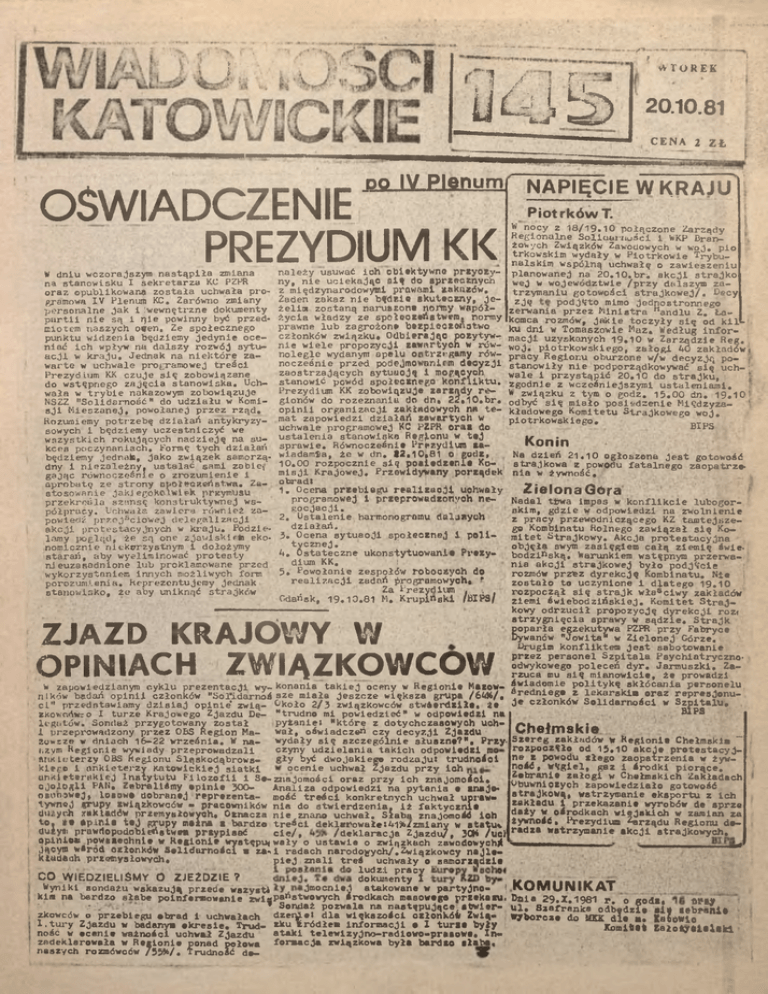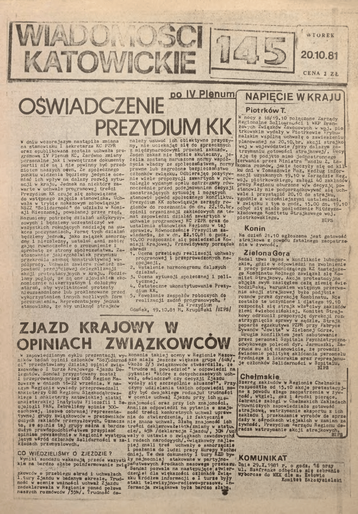 * i W TOREK 1 il4 i ¡¿) 20.10.81 CENA do 2 Z-Ł li IV Plenum NAPIĘCIE W KRAJU OŚWIADCZENIE PREZYDIUM KK Piotrków T. W nocy z 18/19.10 połączone Zarządy Regionalne Solidarności 1 V/KP Bran żowych Związków Zawodowych w woj. pi o trkowskim wydały w Piotrkowie Trybu nalskim wspólną uchwałę o zawieszeniu planowanej na 20.10.bri akcji strajko wej w województwie /przy dalszym za trzymaniu gotowości strajkowej/. Decy zj*i podjęto mimo jednostronnego zerwania przez ftlnlstra H andłu Z. Łakoraca rozmów, jakie toczyły się od kila ku dni w Tomaszowie Maz* Według infor macji uzyskanych 19*10 w Zarządzie Reg. woj. piotrkowskiego, załogi 40 zakładówt pracy Regionu oburzone w/w decyzjo, postanowiły nie podporządkowywać się uch-: wale i przystąpić 20.10 do strajku, Zgodnie z wcześniejszymi ustaleniami. V* związku z tym o godz. 15.00 dn. 19-10 ‘ odbyć się miało posiedzenie Międzyza kładowego Komitetu Strajkowego woj. piotrkowskiego. BIps należy usuwać ioh obiektywno przyozyny, nie uciekając alf do sprzecznych z międzynarodowymi prawami askazów. Żaden zakaz nie bfdzie skuteczny, jeżelim zostaną narusson* normy wapółżycia władzy ze społeczeństwem. normy prawne lub zagrożone bezpieczeństwo członków związku* Odbierając pozytyw nie wiele propozycji zawartych w rów nolegle wydanym apelu ontrzi-gamy rów nocześnie przed podejmownnlrm decyzji zaostrzających sytuuoją 1 mogących stanowić powód społecznego konfliktu. Prezydium KK zobowiązuje zarządy re gionów do rozeznaniu, do dn, 22*10.br. opinii organizacji zakładowych na te mat zapowiedzi działań zawartych w uchwale programowej KC PZPR ora* do ustalenia stanowiska Regionu w t*J sprawie. Równocześnie Prezydium za wiadamia, że w dn. (2*10*81 0 godz, Na dzień 21«10 ogłoszona Jest gotowość 10.00 rozpocznie się poaledzenl* Ko strajkowa z powodu fatalnego zaopatrzę* misji Krajowej, Przewidywany porządek nia w żywność# obrad! 1. Ocena przebiegu reallzaojl uchwały programowej 1 przeprowadzonych ne Nadal ttrwa impas w konflikcie lubogorgocjacji. akim, gdzie w odpowiedzi na zwolnienie 2. Ustalenie harmonogramu dttla*yoh z pracy przewodniczącego KZ tamtejsze działań. go Kombinatu Rolnego zawiązał się Ko 3. Ocena sytuaojl społecznej 1 poli mitet Strajkowy. Akcja protestacyjna tycznej. objęła swym zasięgiem całą ziemię świe. U. Ostateczne ukonstytuowani* Prezy bodzln ską. Warunkiem wstępnym przerwa dium KK. i nia akcji strajkowej było podjecie 5. Powołanie zespołów roboczych do rozmów prziez dyrekcję Kombinatu. Nie realizacji zadań programowych* ? zostało to uczynione i dlatego 19.10 Za Prezydium , , , rozpoczął się strajk w ła8 clwy zakładów Gdańsk, 19.10.81 M. Krupiński fhlPS/ ziemi świebodzińskiej. Komitet Straj kowy odrzucił propozycję dyrekcji rozt strzygnięcia sprawy w sądzie. Strajk poparła egzekutywa PZPR przy Fabryce Dywanów "Jowita" w Zielonej Górze. firugim konfliktem jest sabotowanie przez personel Szpitala Psychiatrycznoodwykowego poleceń dyr. Jarmuszki. Za rzuca mu się mianowicie, że prowadzi świadomie politykę skłócania personelu w zapowiedzianym oyklu prezentacji w y - konania takiej oceny w Regionie Mazowz lekarskim oraz represjonu óW badań _PB__ sze miała Jeszcze większa grupa /6 W / * średniego ników ... .. opinii . - członków .. , - "SoTidarnoś ci" przedstawiamy dzisiaj opinie’zwią Około 2/3 związkowców stwierdził*. ie je członków Solidarności w Szpitalu, BIPS zkowo,itas o X turze Krajowego Zjazdu De- "trudno mi powiedzieć" w odpowiedzi na iogiitów. Sondaż przygotowany został pytanie; "które z dotychczasowych uohi przeprowadzony przez OBS Region Ma- wał, oświadczeń czy decyzji Zjazdu Kowsze w dniach 16-22 września. W na- wydały się szczególnie słuszne?"* Przy. Szereg zakładów w Kegioni* Chełmskim ~ tszym Regionie wywiady przeprowadzali czyny udzielania takich odpowiedzi mo rozpoczęło od 15,10 akcje protestacyj gły być dwojakiego rodzajus trudności ne * powodu złego zaopatrzenia w żyw Ankieterzy OBS Regionu Sląskodąbrowsność, węgiel, gaz i środki piorące, ocenie uchwał ZJJazdu przy ich klepo i ankieterzy Katowickiej siatki ¿obranie załogi w Chełmskich Zakładach unkleterakiej Instytutu filozofii i So-znajomości oraz przy ich znajomośoi* cjoloftll PAN* ¿ebraliimy »pinie 300Analiza odpowiedzi na pytania e *n»3o* Obuwniczych zapowiedziało gotowość strajkową, wstrzymanie eksportu z ich oionowej, losow* dobranej reprerenta- mość treści konkretnych uchwał upraw» zakładu 1 przekazanie wyrobów de sprze lywnoj grupy związKowców » - pracowników nia do stwle tywnej &rupy związkowców stwierdzenia, iż faktyczni* diuych jrakladów przemysłowych. Oznacza nie znano uchwał. uc Słaba znajomość ioh dąży w ośrodkach wiejskich w zamian za to, »* Opirl* t*J grupy me i na * bardzo treści dekla latfowałesAift/zmlany w status. żywność. Prezydium Narządu R egionu dodu*ym cie/,, /d ---/deklaracja Zjazdu/, 30H /uc) radza wstrzymanie akcji strajkowych* .¿i--prawdopodobirfgtwea ■ u . — przypisać opinio* powtzeohnle w Regionie występu*wały o ustawie o związkach zawodowych/ ■MM**-1— ^ ¡ W Y ® w®rod członków Solidarności ■ za^i redach narodowych/.Związkowcy najlekiudaah przemysłowych* piej znali treś uchwały o samorządzl* W dniu wczorajszym nastąpiła zmiana na stanowisku I sekretarza KC PZPR oraz opublikowana została uchwała pro gramowa IV Plenum KC. Zarówno zmiany personalne Jak i Wewnętrzne dokumenty partii nie są i i^ie powinny być przed miotem naszych ooen. Ze społecznego punktu widzenia będziemy Jedynie oce niać ich wpływ na dalszy rozwój sytu acji w kraju. Jednak na niektóre za warte w uchwale programowej treści Prezydium KK czuje się zobowiązane do wstępnego zajęcia stanowiska. Uch wała w trybie nakazowym zobowiązuje NSZZ "Solidarność" do udziału w Komi sji Mieszanej, powołanej p r z e z r z ą d * Rozum