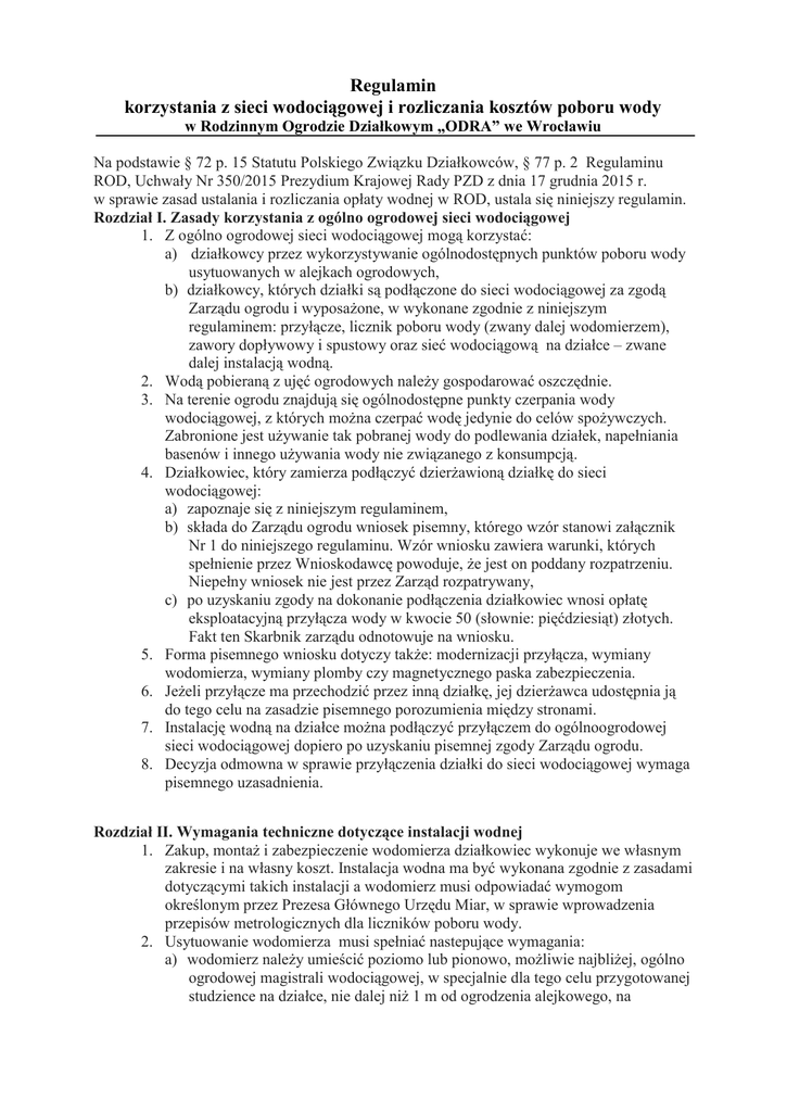 Regulamin korzystania z sieci wodociągowej i rozliczania kosztów poboru wody w Rodzinnym Ogrodzie Działkowym „ODRA” we Wrocławiu Na podstawie § 72 p. 15 Statutu Polskiego Związku Działkowców, § 77 p. 2 Regulaminu ROD, Uchwały Nr 350/2015 Prezydium Krajowej Rady PZD z dnia 17 grudnia 2015 r. w sprawie zasad ustalania i rozliczania opłaty wodnej w ROD, ustala się niniejszy regulamin. Rozdział I. Zasady korzystania z ogólno ogrodowej sieci wodociągowej 1. Z ogólno ogrodowej sieci wodociągowej mogą korzystać: a) działkowcy przez wykorzystywanie ogólnodostępnych punktów poboru wody usytuowanych w alejkach ogrodowych, b) działkowcy, których działki są podłączone do sieci wodociągowej za zgodą Zarządu ogrodu i wyposażone, w wykonane zgodnie z niniejszym regulaminem: przyłącze, licznik poboru wody (zwany dalej wodomierzem), zawory dopływowy i spustowy oraz sieć wodociągową na działce – zwane dalej instalacją wodną. 2. Wodą pobieraną z ujęć ogrodowych należy gospodarować oszczędnie. 3. Na terenie ogrodu znajdują się ogólnodostępne punkty czerpania wody wodociągowej, z których można czerpać wodę jedynie do celów spożywczych. Zabronione jest używanie tak pobranej wody do podlewania działek, napełniania basenów i innego używania wody nie związanego z konsumpcją. 4. Działkowiec, który zamierza podłączyć dzierżawioną działkę do sieci wodociągowej: a) zapoznaje się z niniejszym regulaminem, b) składa do Zarządu ogrodu wniosek pisemny, którego wzór stanowi załącznik Nr 1 do niniejszego regulaminu. Wzór wniosku zawiera warunki, których spełnienie przez Wnioskodawcę powoduje, że jest on poddany rozpatrzeniu. Niepełny wniosek nie jest przez Zarząd rozpatrywany, c) po uzyskaniu zgody na dokonanie podłączenia działkowiec wnosi opłatę eksploatacyjną przyłącza wody w kwocie 50 (słownie: pięćdziesiąt) złotych. Fakt ten Skarbnik zarządu odnotowuje na wniosku. 5. Forma pisemnego wniosku dotyczy także: modernizacji przyłącza, wymiany wodomierza, wymiany plomby czy magnetycznego paska zabezpieczenia. 6. Jeżeli przyłącze ma przechodzić przez inną działkę, jej dzierżawca udostępnia ją do tego celu na zasadzie pisemnego porozumienia między stronami. 7. Instalację wodną na działce można podłączyć przyłączem do ogólnoogrodowej sieci wodociągowej dopiero po uzyskaniu pisemnej zgody Zarządu ogrodu. 8. Decyzja odmowna w sprawie przyłączenia działki do sieci wodociągowej wymaga pisemnego uzasadnienia. Rozdział II. Wymagania techniczne dotyczące instalacji wodnej 1. Zakup, montaż i zabezpieczenie wodomierza działkowiec wykonuje we własnym zakresie i na własny koszt. Instalacja wodna ma być wykonana zgodnie z zasadami dotyczącymi takich instalacji a wodomierz musi odpowiadać wymogom określonym przez Prezesa Głównego Urzędu Miar, w sprawie wprowadzenia przepisów metrologicznych dla liczników poboru wody. 2. Usytuowanie wodomierza musi spełniać nastepujące wymagania: a) wodomierz należy umieścić poziomo lub pionowo, możliwie najbliżej, ogólno ogrodowej magistrali wodociągowej, w specjalnie dla tego celu przygotowanej studzience na działce, nie dalej niż 1 m od ogrodzenia alejkowego, na 3. 4. 5. 6. głębokości nie mniejszej niż 70 cm. Usytuowanie wodomierza powinno umożliwiać łatwe dokonywanie odczytu wskazań, kontroli plomby i zabezpieczającego paska magnetycznego. Zabrania się: niszczenia infrastruktury ogrodu poprzez sytuowanie studzienki działki na alejce ogrodowej a także sytuowania wodomierza w altanie działki, b) wodomierz musi być sprawny technicznie, posiadać plombę legalizacyjną. Po odbiorze przyłącza wodomierz dodatkowo zabezpieczony zostaje przez osobę odbierającą całość instalacji wodnej magnetycznym paskiem, c) przed wodomierzem (od strony dopływu wody) należy umieścić zawór odcinający wodę, za wodomierzem zawór spustowy. Przez wodomierz musi przepływać cała ilość wody pobierana na działce co oznacza zakaz wmontowywania w instalację przed wodomierzem trójników lub innych urządzeń umożliwiających pobór wody poza wodomierzem, d) w nakrętkach przy wodomierzu muszą znajdować się otwory umożliwiające jego zaplombowanie przez odbierającego instalację przedstawiciela Zarządu ROD. W szczególnie uzasadnionym pisemnie przypadku Zarząd ROD może wyrazić zgodę na inne usytuowanie wodomierza niż określone w Rozdz. II, p. 2 lit. „a” niniejszego regulaminu. Po wykonaniu wszystkich prac należy zgłosić Zarządowi ogrodu przygotowaną instalację wodną, do odbioru technicznego. Odbiór techniczny instalacji: a) odbioru technicznego przyłącza, wodomierza oraz pozostałej części instalacji wodnej dokonują protokolarnie członkowie ogrodowej Komisji ds. sieci woodociągowej. Wzór protokołu odbioru stanowi załącznik Nr 2 do nieniejszego regulaminu. b) po stwierdzeniu prawidłowości wykonania instalacji wodnej zgodnie z wymaganiami, dokonaniu próby szczelności, komisja zakłada na wodomierzu plombę zabezpieczającą oraz ochronny pasek magnetyczny dopuszczając instalację do eksploatacji. Kopię protokołu odbioru otrzymuje działkowiec. Okresowa legalizacja wodomierza i związane z tym koszty należy do zadań działkowca. Rozdział III. Okresowa kontrola stanu technicznego przyłącza oraz licznika wody. 1. W celu sprawdzenia (kontroli) stanu prawidłowości podłączeń instalacji wodociągowej, odczytu liczników wody, działkowiec ma obowiązek umożliwić wstęp na działkę i do altany osobom upoważnionym przez Zarząd ROD. 2. Mimo braku zgody działkowca, osoby upoważnione przez Zarząd ROD są uprawnione, na podstawie § 74 p. 2 Regulaminu ROD, do wstępu na działkę w celu przeprowadzenia czynności o których mowa w p. 1 jeżeli z co najmniej 7dniowym wyprzedzeniem zawiadomią na piśmie działkowca o konieczności wstępu na teren działki. 3. Z czynności kontrolnych sporząd
