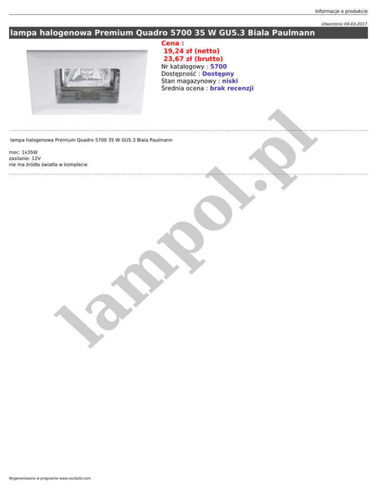 Informacje o produkcie Utworzono 04-03-2017 lampa halogenowa Premium Quadro 5700 35 W GU5.3 Biala Paulmann Cena : 19,24 zł (netto) 23,67 zł (brutto) Nr katalogowy : 5700 Dostępność : Dostępny Stan magazynowy : niski Średnia ocena : brak recenzji la l.p m po moc: 1x35W zasilanie: 12V nie ma źródła światła w komplecie l lampa halogenowa Premium Quadro 5700 35 W GU5.3 Biala Paulmann Wygenerowano w programie www.oscGold.com
