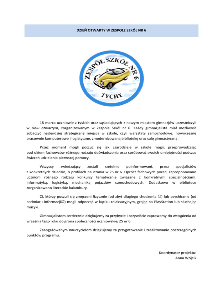 DZIEŃ OTWARTY W ZESPOLE SZKÓŁ NR 6 18 marca uczniowie z tyskich oraz sąsiadujących z naszym miastem gimnazjów uczestniczyli w Dniu otwartym, zorganizowanym w Zespole Szkół nr 6. Każdy gimnazjalista miał możliwość zobaczyć najbardziej strategiczne miejsca w szkole, czyli warsztaty samochodowe, nowoczesne pracownie komputerowe i logistyczne, zmodernizowaną bibliotekę oraz salę gimnastyczną. Przez moment mogli poczuć się jak czarodzieje w szkole magii, przeprowadzając pod okiem fachowców różnego rodzaju doświadczenia oraz spróbować swoich umiejętności podczas ćwiczeń udzielania pierwszej pomocy. Wszyscy zwiedzający zostali rzetelnie poinformowani, przez specjalistów z konkretnych dziedzin, o profilach nauczania w ZS nr 6. Oprócz fachowych porad, zaproponowano uczniom różnego rodzaju konkursy tematycznie związane z konkretnymi specjalnościami: informatyką, logistyką, mechaniką pojazdów samochodowych. Dodatkowo w bibliotece zorganizowano literackie kalambury. Ci, którzy poczuli się zmęczeni fizycznie (od zbyt długiego chodzenia ) lub psychicznie (od nadmiaru informacji) mogli odpocząć w kąciku relaksacyjnym, grając na PlayStation lub słuchając muzyki. Gimnazjalistom serdecznie dziękujemy za przybycie i oczywiście zapraszamy do wstąpienia od września tego roku do grona społeczności uczniowskiej ZS nr 6. Zaangażowanym nauczycielom dziękujemy za przygotowanie i zrealizowanie poszczególnych punktów programu. Koordynator projektu: Anna Wójcik