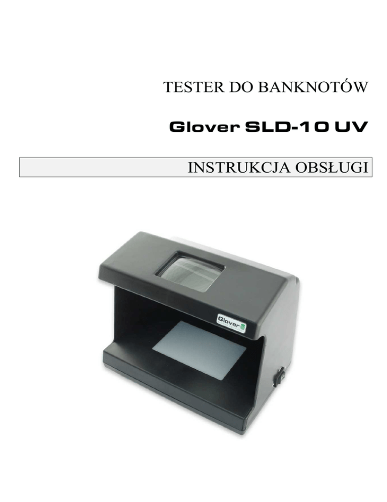 TESTER DO BANKNOTÓW Glover SLD-10 UV INSTRUKCJA OBSŁUGI Glover SLD-10 UV Tester SLD-10 UV został zaprojektowany w oparciu o zaawansowaną technologię badania prawdziwości banknotów, która jest stosowana w wielu krajach świata. Tester SLD10 UV jest przeznaczony do pracy w bankach, urzędach pocztowych, sklepach oraz innych punktach kasowych. Dane techniczne 1. Urządzenie powinno pracować przy natężeniu światła od 200 do 800 luksów. Podczas pracy powinno być odwrócone tyłem do słońca oraz innych źródeł emitujących światło. Umożliwia to lepszą czytelność podczas sprawdzania banknotów. 2. Napięcie: 230 V +/- 10%, 50 Hz 3. Moc - Lampa UV: 9 W - Światło białe: 4 W 4. Warunki pracy testera - Temperatura: 0-40 st. C - Wilgotność: do 85% 5. Wymiary: 200 x 120 x 160 mm Zalecenia ogólne: 1. Przed rozpoczęciem eksploatacji urządzenia proszę się dokładnie zapoznać z instrukcją. 2. Chronić przed kurzem i pyłem. 3. Czyść tester regularnie, w sposób, w jaki czyścimy inne urządzenia elektroniczne. 4. Jeżeli urządzenie znajdowało się w temperaturze poniżej 50C, należy odczekać ok. 10 min. przed rozpoczęciem pracy. Zalecenia dotyczące eksploatacji urządzenia: Lampa ultrafioletowa stosowana w tych testerach to lampa typu fluorescencyjnego (popularnie nazywana „świetlówką”), której charakterystyka powoduje, że elementami najbardziej narażonymi na uszkodzenie lub zużycie są żarniki. Żarniki ulegają największym obciążeniom w momencie rozruchu, wtedy też jest największe ryzyko ich uszkodzenia. Wobec powyższych faktów producent lamp zaleca, żeby stosunek ilości zapłonów lampy do czasu jej pracy był jak najmniejszy. Podawane często charakterystyki długości pracy lampy (np. 3000 h, 6000 h, 9000 h) są przyjmowane dla świecenia ciągłego, nie zakładają więc wielokrotnego ich włączania i wyłączania. Zaleca się więc, aby w trosce o jak najdłuższy okres eksploatacji lamp, a zarazem o koszt eksploatacji urządzenia, testery był włączany nie więcej niż 2-3 razy dziennie i pracował kilka godzin. W ten sposób model ten, o wyższej trwałości powinien zapewnić pracę bez konieczności wymiany lampy w okresie ok. 2- letnim. Częste włączanie urządzenia (np. aby doraźnie zweryfikować banknot) wyraźnie obniża czas eksploatacji lampy. 2 Glover SLD-10 UV Funkcje testera Tester uruchamiamy poprzez włączenie go do źródła prądu, a następnie przełączając klawisz „PE/OFF/UV”, na bocznej płycie urządzenia 1. Funkcja UV Aby móc korzystać z tej funkcji, należy ustawić klawisz wyłącznika na pozycję „UV”, wtedy świetlówka powinna się zaświecić. Możemy wtedy rozpocząć testowanie, w tym celu wsuwamy banknot pod lampę UV. Prawdziwy banknot absorbuje światło ultrafioletowe, są w nim widoczne tylko wybrane znaki. Jeśli światło jest przez banknot odbijane, banknot jest fałszywy! Jest to związane z rodzajem papieru, jaki wykorzystuje się przy produkcji banknotów oraz specyfiką farb, którymi są pokryte. W świetle ultrafioletowym, możemy także badać inne dokumenty zabezpieczane podobnie jak banknoty (certyfikaty, czeki, bony, etc.). Zabezpieczenia banknotu w promieniach UV na przykładzie banknotu 50 zł. W banknocie znajdują się następujące zabezpieczenia utajone: na stronie przedniej - w lewym górnym rogu banknotu prostokątne pole koloru zielonego z napisem w kontrze (napis nie świeci), część linii giloszowych, prawe oznaczenie serii i numeracja w kolorze pomarańczowym na stronie odwrotnej - fragmenty giloszy w kolorze zielonym 2. Badanie zabezpieczeń w świetle białym Aby móc stwierdzić obecność znaku wodnego, nitki zabezpieczającej oraz poprawności elementu retro-verso, korzystamy z lampy emitującej światło białe. W tym celu należy ustawić klawisz wyłącznika na pozycję „PE”, lampa światła białego powinna się zaświecić. Następnie kładziemy banknot na szybie („matówce”) testera. W przypadku banknotu prawdziwego, znak wodny powinien się wyraźnie ukazać. Banknoty fałszywe bądź nie mają tego znaku, bądź jest on błędnie wykonany. Znak wodny nie jest widoczny w świetle ultrafioletowym w przypadku prawdziwego banknotu, a jest widoczny w przypadku banknotu fałszywego. Również nitka zabezpieczająca powinna być czytelnie widoczna łącznie z nadrukiem NBP w jego środku, ale tylko w świetle przechodzącym. 3 Glover SLD-10 UV Znak optyczny (recto-verso). Elementy graficzne ze strony przedniej i odwrotnej oglądane pod światło powinny wzajemnie się uzupełniać, będąc dokładnie wycentrowane. Nitka z mikrodrukiem Element recto-verso Znak wodny Banknot posiada dwutonowy znak wodny umiejscowiony po lewej stronie awersu. Jest na nim powtórzony portret króla Kazimierza Wielkiego. Banknot posiada metalizowaną, wewnętrzną nitkę z mikrodrukiem. Mikrodruk stanowią wielokrotnie powtórzone bloki tekstowe "50 ZŁ". Względem siebie sąsiednie bloki znajdują się w lustrzanym odbiciu. w świetle odbitym strona przednia pod światło strona odwrotna od strony przedniej Z prawej strony portretu znajduje się znak optyczny (recto-verso). Elementy graficzne ze strony przedniej i odwrotnej oglądane pod światło wzajemnie się uzupełniają. Ciemne tło korony z rewersu wypełnia jej kontury na awersie. Wykorzystanie do obserwacji zabezpieczeń banknotu szkła powiększającego (lupy) znajdującej się w górnej części obudowy, w znacznym stopniu podnosi jej dokładność. Lupa pozwala także na weryfikację dokładności i poprawności mikrodruków umieszczanych na banknotach. 4