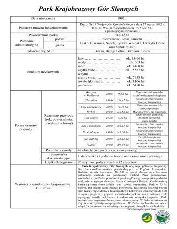 Park Krajobrazowy Gór Słonnych Data utworzenia 1992r. Rozp. Nr 19 Wojewody Krośnieńskiego z dnia 27 marca 1992 r. Podstawa prawna funkcjonowania Powierzchnia parku powiat PołoŜenie administracyjne gmina PołoŜenie wg ALP Struktura uŜytkowania Formy ochrony przyrody Rezerwaty przyrody (rok, powierzchnia, przedmiot ochrony) Pomniki przyrody Stanowiska dokumentacyjne UŜytki ekologiczne Wartości przyrodniczo – krajobrazowe, kulturowe (Dz. U. Woj. Krośnieńskiego nr 7/92 poz. 53, z późniejszymi zmianami) 56 032 ha bieszczadzki, leski, sanocki Lesko, Olszanica, Sanok, Tyrawa Wołoska, Ustrzyki Dolne oraz Sanok miasto Bircza, Brzegi Dolne, Brzozów, Lesko lasy:………………………… wody:………………………. inne:………………………... uŜytki rolne………………… w tym: grunty orne:………………… trwałe łąki i sady:…………... pastwiska:…………………... ok. 35490 ha ok. 503 ha ok. 4468 ha ok. 15557 ha ok. 7958 ha ok. 1106 ha ok. 6450 ha Buczyna w Wańkowej 2000r 98,68 ha Chwaniów 1996r 354,47 ha Cisy w Serednicy 2002r 14,48 ha Dyrbek 1996r 130,88 ha Góra Sobień 1970r 5,34 ha Nad Trzciańcem 2000r 182,13 ha Na Opalonym 1996r 216,54 ha Na Oratyku 2000r 233,15 ha Polanki 1996r 191,94 ha Naturalne zbiorowiska, osobliwości dendrologiczne Naturalne zbiorowisko buczyny karpackiej Naturalne stanowisko cisa pospolitego Wielopiętrowy las mieszany Grąd lipowo-grabowy, buczyna karpacka, ruiny zamku Naturalne zbiorowisko buczyny karpackiej Naturalne zbiorowisko buczyny karpackiej Przejściowa forma buczyny karpackiej Naturalne zbiorowisko buczyny karpackiej 48 obiekty (w tym 3 przyr. nieozywionej) 1 stanowisko (+ jedno w trakcie nabierania mocy prawnej) 96 uŜytków, połączonych w 12 zespołów Park Krajobrazowy Gór Słonnych obejmuje północne fragmenty Gór Sanocko-Turczańskich przechodzących w Pogórze Przemyskie. Grzbiety górskie (najwyŜszy Dił 721 m npm.) ułoŜone są z kierunku północnego zachodu na południowy wschód. Przez południowowschodnią część Parku przechodzi granica głównego europejskiego działu wód, oddzielającego zlewiska Morza Czarnego i Bałtyku. Osobliwością Parku są liczne słone źródła oraz złoŜa roponośne. Park w 73 % pokryty jest lasami, które cechuje piętrowość. Roslinność powyŜej 500 m npm tworzy regiel dolny z lasami jodłowo-bukowymi i bukowymi, do 500 m npm – pogórza z grądem wschodniokarpackim, zaś w dolinach rzek występują zarośla wiklinowe i nadrzeczna olszynka karpacka. Park cechuje duŜe bogactwo florystyczne i faunistyczne. W Parku urządzone są trzy ścieŜki dydaktyczno-przyrodnicze. W Parku zachowało się wiele zabytków budownictwa sakralnego, szczególnie obrządków wschodnich. ZPKwPrzemyślu styczeń 2006