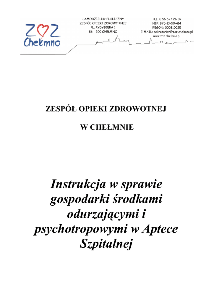 ZESPÓŁ OPIEKI ZDROWOTNEJ W CHEŁMNIE Instrukcja w sprawie gospodarki środkami odurzającymi i psychotropowymi w Aptece Szpitalnej CEL PROCEDURY Celem instrukcji jest opisanie gospodarki środkami odurzającymi i psychotropowymi w Aptece Szpitalnej PODSTAWA PRAWNA Podstawą prawną jest Ustawa z dnia 06.09.2001r. - Prawo farmaceutyczne - Dz.U.Nr.53 poz.533 z późn.zm., Ustawa z dnia 29.07.2005 roku o przeciwdziałaniu narkomanii oraz poszczególne Rozporządzenia Ministra Zdrowia dotyczące obrotem środkami psychotropowymi i narkotycznymi 1.Transport leków Apteka szpitalna zaopatrywana jest w leki psychotropowe i narkotyczne na podstawie ogłoszonych przetargów w ZOZ Chełmno. Hurtownie farmaceutyczne lub firmy farmaceutyczne, które wygrywają przetargi, zobligowane są do dostarczania w/w środków zgonie z umową przetargową. W momencie dostarczenia towaru do apteki mgr farmacji sprawdza w obecności dostawcy zgodność towaru z fakturą tj daty ważności, serię,stan fizyczny zakupionych leków Kierownik Apteki Szpitalnej odpowiada za przyjęcie na stan apteki leków narkotycznych i psychotropowych W tym celu prowadzi ewidencję przychodu i rozchodu leków narkotycznych i psychotropowych, w formie ksiąg kontroli opieczętowanych przez Inspektorat Nadzoru Farmaceutycznego. Ordynator oddziału lub lekarz przez niego wyznaczony odbiera osobiście z apteki szpitalnej leki narkotyczne. Leki psychotropowe i silnie działające obiera z apteki szpitalnej pielęgniarka oddziałowa lub pielęgniarka upoważniona do odbioru w/w środków 2.Zasady przechowywania preparatów narkotycznych i leków psychotropowych Leki narkotyczne przechowywane są w aptece szpitalnej w sejfie. Klucz do leków narkotycznych posiada kierownik apteki szpitalnej Leki psychotropowe przechowywane są w aptece szpitalnej w zamykanych szafach. Kierownik apteki szpitalnej prowadzi cotygodniową ewidencję leków narkotycznych i psychotropowych -wpisuje przychód i rozchód w/w środków. Na poszczególnych oddziałach i poradniach w ZOZ Chełmno prowadzona jest również ewidencja leków narkotycznych za którą odpowiedzialny jest ordynator oddziału lub lekarz przez niego wyznaczony. Leki narkotyczne przechowywane są na oddziałach w sejfach. Klucz posiada ordynator oddziału lub lekarz upoważniony. Leki psychotropowe przechowywane są na oddziałach i poradniach w oddzielnych zamykanych na klucz szafkach. 3.Zasady utylizacji przeterminowanych preparatów narkotycznych i leków psychotropowych oraz w/w leków niezużytych i uszkodzonych Dotyczy Oddziałów i pozostałych komórek w ZOZ Chełmno * Pielęgniarka oddziałowa odpowiedzialna za gospodarkę lekami na oddziale lub w innej komórce organizacyjnej ZOZ-u po stwierdzeniu faktu posiadania przeterminowanych lub niezużytych leków psychotropowych lub uszkodzonych, jest zobowiązana do przekazania tej informacji ordynatorowi oddziału *Ordynator sporządza protokół zgodnie z załącznikiem nr1 Informacja oddziału/jednostki organizacyjnej ZOZ-u w Chełmnie o posiadaniu środków którym upłyną termin ważności oraz wpisuje dany lek do odpowiedniego rejestru tych środków na oddziale. Dostarcza do apteki szpitalnej przeterminowany lek wraz z załącznikiem nr1 *Oryginał załącznika nr1 pozostaje w aptece, natomiast kopia po podpisaniu przez kierownika apteki wraca do jednostki organizacyjnej ZOZ-u i jest przechowywana razem z rejestrem środków przeterminowanych. *Kierownik apteki szpitalnej w obecności ordynatora wypełnia załącznik nr2 Protokół zabezpieczenia środków którym upłynął termin ważności,uległ uszkodzeniu i niezużytych *Przeterminowane leki psychotropowe lub narkotyczne kierownik apteki szpitalnej przechowuje w sejfie zamykanym na klucz. Leki przeterminowane zostają umieszczone w pojemniku zbiorczym z napisem „DO UNIESZKODLIWIENIA” aby uniknąć ponownego wprowadzenia ich do obrotu. *Kierownik apteki szpitalnej powiadamia Wojewódzkiego Inspektora Nadzoru Farmaceutycznego *Inspektor nadzoru farmaceutycznego zabezpiecza przez oplombowanie pojemnika z lekami do utylizacji, pozostawia ten pojemnik w miejscu do czasu przekazania go do utylizacji oraz dokumentuje powyższe czynności w protokole którego wzór stanowi załącznik 3.w trzech egzemplarzach Protokół zabezpieczenia środków odurzających którym upłynął termin ważności,uległ uszkodzeniu i niezużytych Dwa egzemplarze załącznika nr3 pozostają w aptece szpitalnej,trzeci egzemplarz odbiera inspektor nadzoru farmaceutycznego *Zaplombowany i zabezpieczony pojemnik wraz z protokołem załącznik nr3 jest przekazywany przedsiębiorstwu utylizującemu odpady w ramach podpisanej umowy *Przedsiębiorstwo utylizujące odpady zobowiązane jest do potwierdzenia na protokole karcie przekazania odpadu faktu przyjęcia ww. leków do utylizacji. Protokół zawiera następujące informacje:, -oznaczenie przedsiębiorcy i miejsce przeprowadzenia utylizacji -datę dostarczenia przesyłki do miejsca unieszkodliwienia -stan przesyłki w chwili dostarczenia -datę przeprowadzenia unieszkodliwienia -o ilości unieszkodliwionych produktów leczniczych -o przebiegu procesu unieszkodliwienia, z uwzględnieniem przypadków konieczności otwarcia pojemników zbiorczych -datę sporządzenia protokołu -imię i nazwisko, stanowisko służbowe każdej z osób obecnych podczas unieszkodliwienia *Protokół z utylizacji wraca do apteki szpitalnej Dotyczy Apteki Szpitalnej *Kierownik apteki potwierdza fakt posiadania w aptece szpitalnej środka przeterminowanego w rejestrze środków przeterminowanych oraz wypełnia załącznik nr1 *Kierownik apteki szpitalnej wypełnia załącznik nr2 *Przeterminowane leki psychotropowe lub narkotyczne kierownik apteki szpitalnej przechowuje w sejfie zamykanym na klucz. Leki przeterminowane zostają umieszczone w pojemniku zbiorczym z napisem „DO UNIESZKODLIWIENIA” aby uniknąć ponownego wprowadzenia ich do obrotu. *Kierownik apteki szpitaln