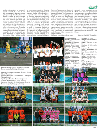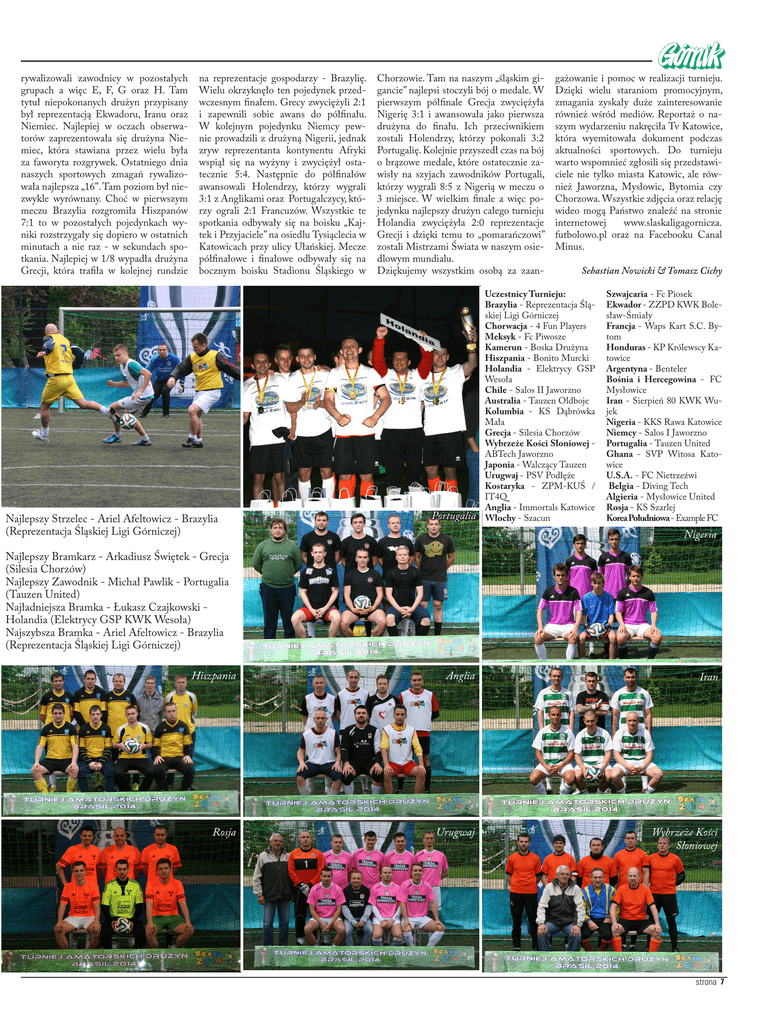 rywalizowali zawodnicy w pozostałych grupach a więc E, F, G oraz H. Tam tytuł niepokonanych drużyn przypisany był reprezentacją Ekwadoru, Iranu oraz Niemiec. Najlepiej w oczach obserwatorów zaprezentowała się drużyna Niemiec, która stawiana przez wielu była za faworyta rozgrywek. Ostatniego dnia naszych sportowych zmagań rywalizowała najlepsza „16”. Tam poziom był niezwykle wyrównany. Choć w pierwszym meczu Brazylia rozgromiła Hiszpanów 7:1 to w pozostałych pojedynkach wyniki rozstrzygały się dopiero w ostatnich minutach a nie raz - w sekundach spotkania. Najlepiej w 1/8 wypadła drużyna Grecji, która trafiła w kolejnej rundzie na reprezentacje gospodarzy - Brazylię. Wielu okrzyknęło ten pojedynek przedwczesnym finałem. Grecy zwyciężyli 2:1 i zapewnili sobie awans do półfinału. W kolejnym pojedynku Niemcy pewnie prowadzili z drużyną Nigerii, jednak zryw reprezentanta kontynentu Afryki wspiął się na wyżyny i zwyciężył ostatecznie 5:4. Następnie do półfinałów awansowali Holendrzy, którzy wygrali 3:1 z Anglikami oraz Portugalczycy, którzy ograli 2:1 Francuzów. Wszystkie te spotkania odbywały się na boisku „Kajtek i Przyjaciele” na osiedlu Tysiąclecia w Katowicach przy ulicy Ułańskiej. Mecze półfinałowe i finałowe odbywały się na bocznym boisku Stadionu Śląskiego w Najlepszy Strzelec - Ariel Afeltowicz - Brazylia (Reprezentacja Śląskiej Ligi Górniczej) Chorzowie. Tam na naszym „śląskim gigancie” najlepsi stoczyli bój o medale. W pierwszym półfinale Grecja zwyciężyła Nigerię 3:1 i awansowała jako pierwsza drużyna do finału. Ich przeciwnikiem zostali Holendrzy, którzy pokonali 3:2 Portugalię. Kolejnie przyszedł czas na bój o brązowe medale, które ostatecznie zawisły na szyjach zawodników Portugali, którzy wygrali 8:5 z Nigerią w meczu o 3 miejsce. W wielkim finale a więc pojedynku najlepszy drużyn całego turnieju Holandia zwyciężyła 2:0 reprezentacje Grecji i dzięki temu to „pomarańczowi” zostali Mistrzami Świata w naszym osiedlowym mundialu. Dziękujemy wszystkim osobą za zaan- Portugalia gażowanie i pomoc w realizacji turnieju. Dzięki wielu staraniom promocyjnym, zmagania zyskały duże zainteresowanie również wśród mediów. Reportaż o naszym wydarzeniu nakręciła Tv Katowice, która wyemitowała dokument podczas aktualności sportowych. Do turnieju warto wspomnieć zgłosili się przedstawiciele nie tylko miasta Katowic, ale również Jaworzna, Mysłowic, Bytomia czy Chorzowa. Wszystkie zdjęcia oraz relację wideo mogą Państwo znaleźć na stronie internetowej www.slaskaligagornicza. futbolowo.pl oraz na Facebooku Canal Minus. Sebastian Nowicki & Tomasz Cichy Uczestnicy Turnieju: Brazylia - Reprezentacja Śląskiej Ligi Górniczej Chorwacja - 4 Fun Players Meksyk - Fc Piwosze Kamerun - Boska Drużyna Hiszpania - Bonito Murcki Holandia - Elektrycy GSP Wesoła Chile - Salos II Jaworzno Australia - Tauzen Oldboje Kolumbia - KS Dąbrówka Mała Grecja - Silesia Chorzów Wybrzeże Kości Słoniowej ABTech Jaworzno Japonia - Walczący Tauzen Urugwaj - PSV Podłęże Kostaryka - ZPM-KUŚ / IT4Q Anglia - Immortals Katowice Włochy - Szacun Szwajcaria - Fc Piosek Ekwador - ZZPD KWK Bolesław-Śmiały Francja - Waps Kart S.C. Bytom Honduras - KP Królewscy Katowice Argentyna - Benteler Bośnia i Hercegowina - FC Mysłowice Iran - Sierpień 80 KWK Wujek Nigeria - KKS Rawa Katowice Niemcy - Salos I Jaworzno Portugalia - Tauzen United Ghana - SVP Witosa Katowice U.S.A. - FC Nietrzeźwi Belgia - Diving Tech Algieria - Mysłowice United Rosja - KS Szarlej Korea Południowa - Example FC Nigeria Najlepszy Bramkarz - Arkadiusz Świętek - Grecja (Silesia Chorzów) Najlepszy Zawodnik - Michał Pawlik - Portugalia (Tauzen United) Najładniejsza Bramka - Łukasz Czajkowski Holandia (Elektrycy GSP KWK Wesoła) Najszybsza Bramka - Ariel Afeltowicz - Brazylia (Reprezentacja Śląskiej Ligi Górniczej) Hiszpania Anglia Iran Rosja Urugwaj Wybrzeże Kości Słoniowej strona 7