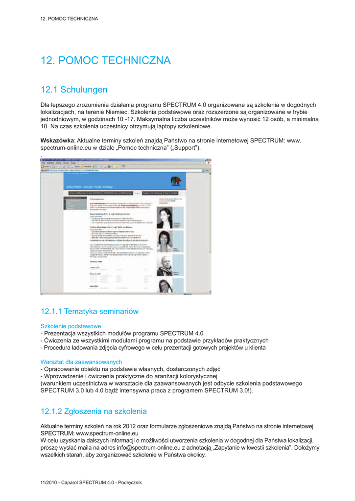 12. POMOC TECHNICZNA 12. POMOC TECHNICZNA 12.1 Schulungen Dla lepszego zrozumienia działania programu SPECTRUM 4.0 organizowane są szkolenia w dogodnych lokalizacjach, na terenie Niemiec. Szkolenia podstawowe oraz rozszerzone są organizowane w trybie jednodniowym, w godzinach 10 -17. Maksymalna liczba uczestników może wynosić 12 osób, a minimalna 10. Na czas szkolenia uczestnicy otrzymują laptopy szkoleniowe. Wskazówka: Aktualne terminy szkoleń znajdą Państwo na stronie internetowej SPECTRUM: www. spectrum-online.eu w dziale „Pomoc techniczna” („Support”). . 12.1.1 Tematyka seminariów Szkolenie podstawowe - Prezentacja wszystkich modułów programu SPECTRUM 4.0 - Ćwiczenia ze wszystkimi modułami programu na podstawie przykładów praktycznych - Procedura ładowania zdjęcia cyfrowego w celu prezentacji gotowych projektów u klienta Warsztat dla zaawansowanych - Opracowanie obiektu na podstawie własnych, dostarczonych zdjęć - Wprowadzenie i ćwiczenia praktyczne do aranżacji kolorystycznej (warunkiem uczestnictwa w warsztacie dla zaawansowanych jest odbycie szkolenia podstawowego SPECTRUM 3.0 lub 4.0 bądź intensywna praca z programem SPECTRUM 3.0!). 12.1.2 Zgłoszenia na szkolenia Aktualne terminy szkoleń na rok 2012 oraz formularze zgłoszeniowe znajdą Państwo na stronie internetowej SPECTRUM: www.spectrum-online.eu W celu uzyskania dalszych informacji o możliwości utworzenia szkolenia w dogodnej dla Państwa lokalizacji, proszę wysłać maila na adres [email protected] z adnotacją „Zapytanie w kwestii szkolenia”. Dołożymy wszelkich starań, aby zorganizować szkolenie w Państwa okolicy. 11/2010 - Caparol SPECTRUM 4.0 - Podręcznik 112 12. POMOC TECHNICZNA 12.2 Filmy szkoleniowe wideo Filmy szkoleniowe wideo dotyczące poszczególnych działów podręcznika znajdą Państwo w przyszłości na stronie www.spectrum-online.eu w dziale „Pomoc techniczna” („Support”). 12.3 Biuletyn Czy chcą Państwo zawsze trzymać rękę na pulsie? Jeśli tak, proszę się zarejestrować, by otrzymywać bezpłatny biuletyn SPECTRUM 4.0! Znajdą Państwo w nim informacje o wszystkich nowościach dotyczących programu SPECTRUM 4.0, jak np. o aktualizacjach lub nowych materiałach. Logowanie do programu SPECTRUM 4.0 Z jednej strony mogą się Państwo zalogować bezpośrednio przy rejestracji programu SPECTRUM 4.0. W tym celu w bloku nawigacji głównej proszę kliknąć opcję „Dodatki” („Extras”)>„Rejestracja” („Registrierung”), wprowadzić żądaną nazwę użytkownika i sprawdzić, czy jest widoczny haczyk w pozycji „Abonuj biuletyn” („Newsletter abonnieren”). Następnie proszę kliknąć przycisk „Rejestruj” („Registrieren”). W trakcie rejestracji zostaniecie Państwo dodatkowo wpisani jako abonent biuletynu (więcej informacji na temat rejestracji, patrz podrozdział 9.2). Logowanie się za pomocą poczty elektronicznej Z drugiej strony mogą Państwo zalogować się wysyłając mail. W tym celu proszę przesłać swoje dane kontaktowe włącznie z adresem mailowym na adres: [email protected] Ostatecznie od zespołu SPECTRUM otrzymają Państwo email z linkiem potwierdzającym. Abonament biuletynu stanie się aktywny dopiero po kliknięciu na link potwierdzający i potwierdzeniu swojego adresu mailowego. Oczywiście z naszego serwisu biuletynowego w każdej chwili mogą Państwo zrezygnować. Link do rezygnacji znajdą Państwo na końcu każdego otrzymanego biuletynu. Cieszymy się z Państwa zgłoszenia! Twój zespół SPECTRUM 11/2010 - Caparol SPECTRUM 4.0 - Podręcznik 113 12. POMOC TECHNICZNA 12.4 Strona internetowa Na nowej stornie internetowej SPECTRUM www.spectrum-online.eu mogą Państwo uzyskać wszelkie informacje dotyczące oprogramowania SPECTRUM 4.0: - Terminy szkoleń w bieżącym i w przyszłym roku - Filmy szkoleniowe wideo - Odpowiedzi na najczęściej zadawane pytania - Informacje o aktualizacjach - Informacje o wszystkich produktach SPECTRUM 4.0 - Informacje o produktach dla własnego marketingu - Infolinia pomocy technicznej - Informacje o kontaktach Strona internetowa jest do Państwa dyspozycji zarówno w języku niemieckim, jak i języku angielskim. Dodatkowo dostępna jest wersja internetowa programu SPECTRUM: SPECTRUM online w ponad 15 językach z produktami specyficznymi dla danego kraju. 12.5 Kontakt Odpowiedzi na pytania techniczne W razie pytań technicznych, na które ten podręcznik lub nasza strona internetowa nie udzieliły Państwu odpowiedzi, chętnie informacji udzieli nasz zespół pomocy technicznej. Nasi pracownicy odpowiedzą na wszystkie pytania techniczne związane z programem SPECTRUM 4.0: E-Mail: [email protected] Płatna Infolinia: 0180 - 5 26 56 87 (0,14 euro/min. z niemieckiej sieci stacjonarnej, z telefonu komórkowego najwyżej 0,42 euro/min). Od poniedziałku do piątku, w godzinach od 9.00 do 12.00 i od 13.00 do 16.00. 11/2010 - Caparol SPECTRUM 4.0 - Podręcznik 114 12. POMOC TECHNICZNA Państwa osobista lista życzeń SPECTRUM 4.0 ma wiele możliwości – jednak jeśli macie Państwo jakieś życzenia dotyczące udoskonalenia programu prosimy o informację. Na pewno sprawdzimy możliwość realizacji Państwa pomysłów. Prosimy o wysłanie swojej osobistej „Listy życzeń” na adres: [email protected] Cała paleta produktów Caparol ze wszystkimi informacjami technicznymi znajduje się pod adresem: www.caparol.de 11/2010 - Caparol SPECTRUM 4.0 - Podręcznik 115