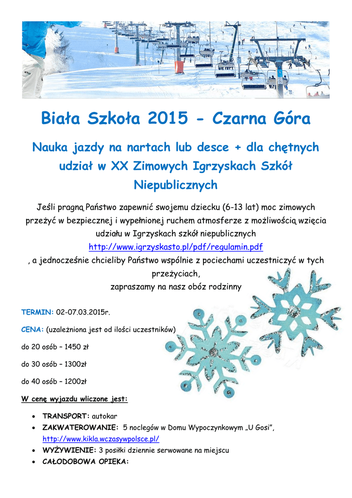 Biała Szkoła 2015 - Czarna Góra Nauka jazdy na nartach lub desce + dla chętnych udział w XX Zimowych Igrzyskach Szkół Niepublicznych Jeśli pragną Państwo zapewnić swojemu dziecku (6-13 lat) moc zimowych przeżyć w bezpiecznej i wypełnionej ruchem atmosferze z możliwością wzięcia udziału w Igrzyskach szkół niepublicznych http://www.igrzyskasto.pl/pdf/regulamin.pdf , a jednocześnie chcieliby Państwo wspólnie z pociechami uczestniczyć w tych przeżyciach, zapraszamy na nasz obóz rodzinny TERMIN: 02-07.03.2015r. CENA: (uzależniona jest od ilości uczestników) do 20 osób – 1450 zł do 30 osób – 1300zł do 40 osób – 1200zł W cenę wyjazdu wliczone jest: TRANSPORT: autokar ZAKWATEROWANIE: 5 noclegów w Domu Wypoczynkowym „U Gosi”, http://www.kikla.wczasywpolsce.pl/ WYŻYWIENIE: 3 posiłki dziennie serwowane na miejscu CAŁODOBOWA OPIEKA: instruktor p. Tomasz Zieliński, nauczyciel w-f p. Agnieszka Czyżewska (nauczyciel SSP nr 5 i SG nr 3) WYKWALIFIKOWANA I DOŚWIADCZONA KADRA REALIZUJĄCA PROGRAM OBOZU: Nauka jazdy na nartach lub desce dla dzieci i dorosłych z wykwalifikowanymi instruktorami, Zajęcia na stoku po zmroku, Zajęcia rekreacyjne na łyżwach, Zajęcia taneczne z instruktorem, Gry i zabawy sportowe na hali, Gry i zabawy terenowe: „Zimowe Igrzyska na Wesoło”, Wycieczka do kompleksu Basenów Termalnych Kulig połączony z ogniskiem i pieczeniem kiełbasek, Gry i zabawy świetlicowe: dyskoteki, konkursy indywidualne i zespołowe, karaoke, Konkursy obozowe… W CENĘ OBOZU NIE SĄ WLICZONE SKIPASY, WYPOŻYCZENIE SPRZĘTU (JEŚLI KTOŚ NIE POSIADA WŁASNEGO SPRZĘTU NARCIARSKIEGO) ORAZ OPŁATA STARTOWA ZA UDZIAŁ W IGRZYSKACH ZIMOWYCH Zapewniamy możliwość wypożyczenia sprzętu na miejscu korzyści, jakie niesie ze sobą uczestnictwo w naszym obozie: Walory zdrowotne, Rozwijanie sprawności fizycznej, Kształtowanie strony mentalnej, Odkrywanie talentów, Zacieśnianie więzów rodzinnych, Relaks dla dorosłych i wiele, wiele innych!!! Zebranie informacyjne Na około dwa tygodnie przed obozem (początek stycznia 2015) zorganizowane będzie dla Państwa zebranie informacyjne. O konkretnej dacie zebrania zostaną Państwo poinformowani drogą elektroniczną. Jeśli są Państwo zainteresowani ofertą Szkoły, chcieliby Państwo mieć więcej informacji na temat wyjazdu lub najzwyczajniej mieliby Państwo jakiekolwiek pytania, proszę pisać na adres szkoły: [email protected] SERDECZNIE ZAPRASZAMY Dyrekcja Szkoły i nauczyciele w-f