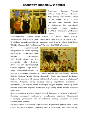 SPORTOWA NIEDZIELA W DĘBEM Tegoroczny Gminny Turniej Halowej Piłki NoŜnej o Puchar Wójta Gminy Dębe Wielkie, odbył się 19 lutego sportowej w 2012r. przy Halinowie. przystąpiło w Zespole Do hali Szkół rywalizacji osiem druŜyn: G.L.U.K.S „Płomień”, „Nafciarze” Chrośla, „Samorządowcy” Gmina Dębe Wielkie, „FC „Celinów”, Koma” Dębe Wielkie, „Gimnazjum Dębe Wielkie 1997”, „Sami Swoi” Dębe Wielkie, „Wrzosowia 90”. W półfinale zacięcie rywalizowały pomiędzy sobą druŜyny: „Sami Swoi” Dębe Wielkie, „Wrzosowia 90”, „Nafciarze” Chrośla , G.L.U.K.S „Płomień”. Po wyczerpujących zmaganiach w finale spotkały się druŜyny: „Sami Swoi” Dębe Wielkie 90”. i „Wrzosowia Finał zwycięskim okazał się dla być druŜyny: „Wrzosowia 90” i to Oni zdobyli Główną nagrodę – czyli Puchar Wójta Gminy Dębe Wielkie. O to zwycięzcy: Jarosław Konowrocki, Jakub Malesa, Bartosz Malesa, Mariusz Wójcik, Mateusz Wojda, Michał Kukawski, Daniel Głuchowski, Radosław Malesa. W meczu o III miejsce G.L.U.K.S „Płomień” wygrał z „Nafciarze” Chrośla. Wszystkie cztery druŜyny zostały nagrodzone pucharami i dyplomami, a za zajęcie trzech pierwszych miejsc druŜyny otrzymały takŜe medale. Wszystkie nagrody ufundował Wójt Gminy Dębe Wielkie Krzysztof Kalinowski. Królem strzelców turnieju został Michał Bodnara z druŜyny „Nafciarze” Chrośla, z druŜyny natomiast najlepszym „Wrzosowia 90”. bramkarzem Zawodnikom Jarosław zostały Konowrocki wręczone statuetki i pamiątkowe dyplomy. Dla wszystkich zawodników organizatorzy przygotowali poczęstunek. KaŜdy z nich po wyczerpującej rywalizacji mógł zregenerować siły, posilając się pyszną grochówką przyrządzoną przez „gminnego kucharza” Pana Tadeusza Wójcika. Wójt Krzysztof Kalinowski dziękuje wszystkim w organizatorom szczególności imprezy, włodarzom z Gminy Halinów za udostępnienie pięknej hali sportowej, zawodnikom turnieju, kibicom, sędziom, druhom jednostki OSP Dębe Wielkie, którzy dbali o bezpieczeństwo uczestników, a takŜe sponsorom z Gminy Dębe Wielkie: Właścicielom sklepów: "Sezam", "A & M", "Benek", "He-Man", PHU „Global” „Bartos” oraz Pani Alicji Woźnica, Elizie Grabiec. Właścicielce kwiaciarni "Stokrotka". Właścicielom firmy International Plastic Polska sp. z o. o., Panu Wojciechowi Dzienio, Panu Jerzemu Rogala za okazaną pomoc w zorganizowaniu tak udanej imprezy sportowej.