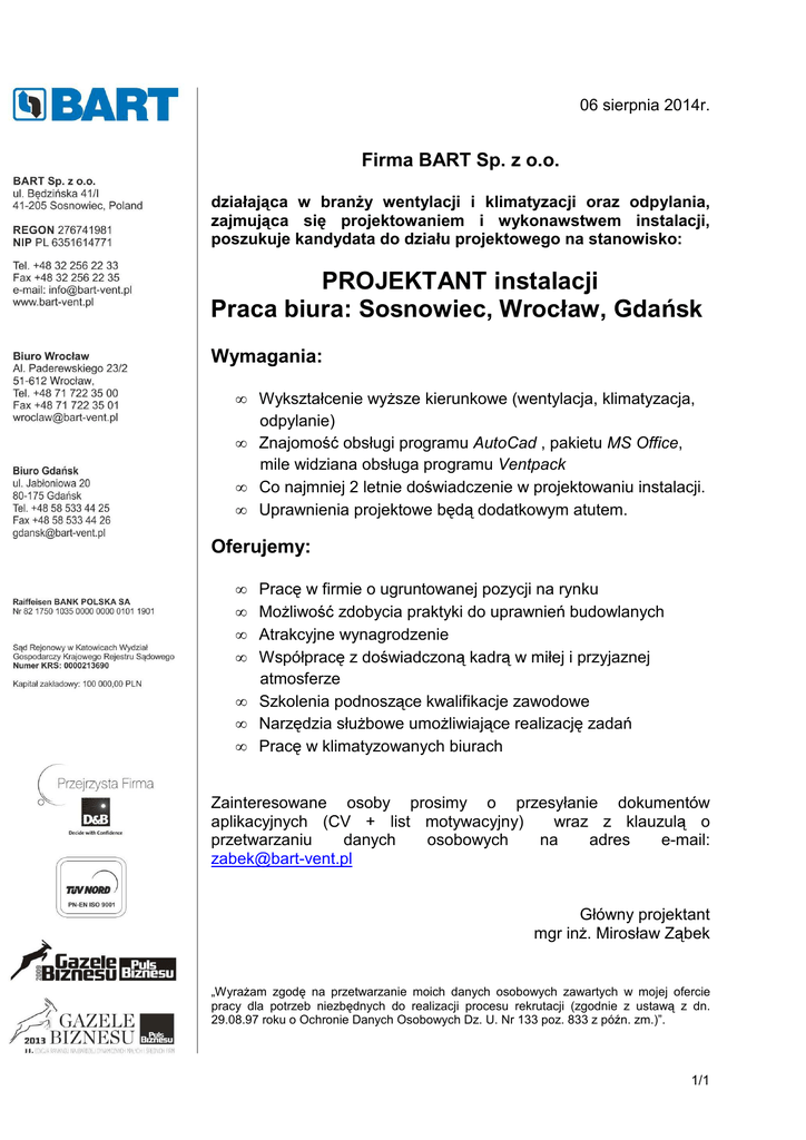 06 sierpnia 2014r. Firma BART Sp. z o.o. działająca w branży wentylacji i klimatyzacji oraz odpylania, zajmująca się projektowaniem i wykonawstwem instalacji, poszukuje kandydata do działu projektowego na stanowisko: PROJEKTANT instalacji Praca biura: Sosnowiec, Wrocław, Gdańsk Wymagania: • Wykształcenie wyższe kierunkowe (wentylacja, klimatyzacja, odpylanie) • Znajomość obsługi programu AutoCad , pakietu MS Office, mile widziana obsługa programu Ventpack • Co najmniej 2 letnie doświadczenie w projektowaniu instalacji. • Uprawnienia projektowe będą dodatkowym atutem. Oferujemy: • • • • Pracę w firmie o ugruntowanej pozycji na rynku Możliwość zdobycia praktyki do uprawnień budowlanych Atrakcyjne wynagrodzenie Współpracę z doświadczoną kadrą w miłej i przyjaznej atmosferze • Szkolenia podnoszące kwalifikacje zawodowe • Narzędzia służbowe umożliwiające realizację zadań • Pracę w klimatyzowanych biurach Zainteresowane osoby prosimy o przesyłanie dokumentów aplikacyjnych (CV + list motywacyjny) wraz z klauzulą o przetwarzaniu danych osobowych na adres e-mail: [email protected] Główny projektant mgr inż. Mirosław Ząbek „Wyrażam zgodę na przetwarzanie moich danych osobowych zawartych w mojej ofercie pracy dla potrzeb niezbędnych do realizacji procesu rekrutacji (zgodnie z ustawą z dn. 29.08.97 roku o Ochronie Danych Osobowych Dz. U. Nr 133 poz. 833 z późn. zm.)”. 1/1